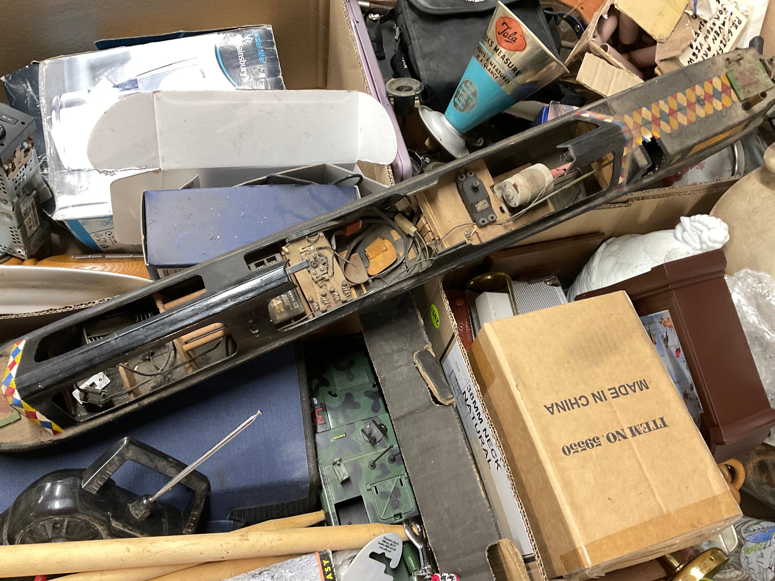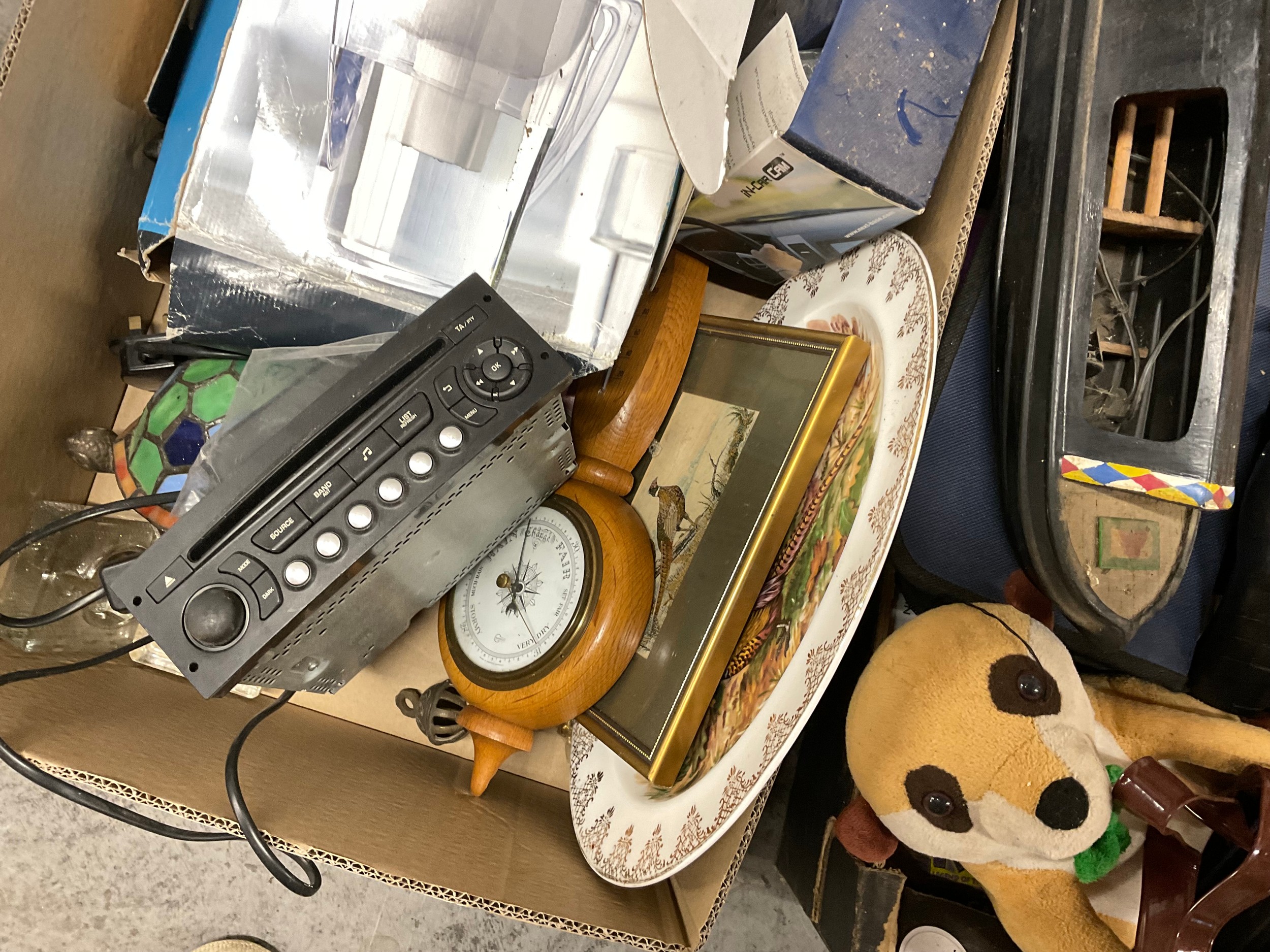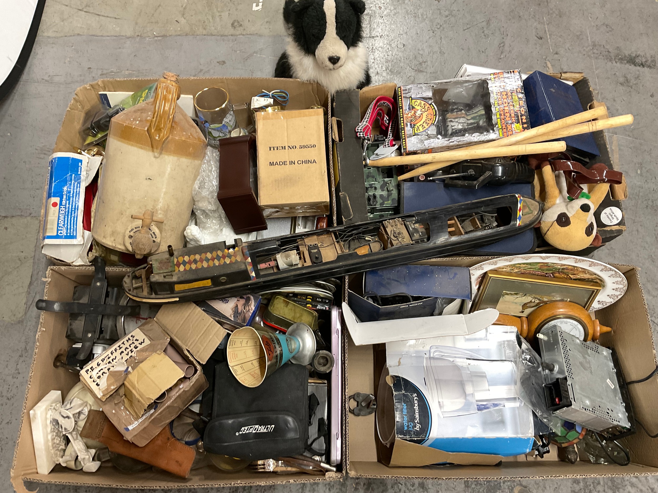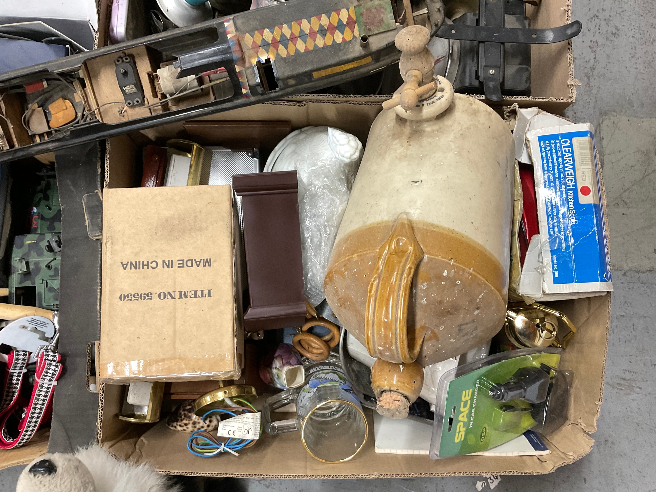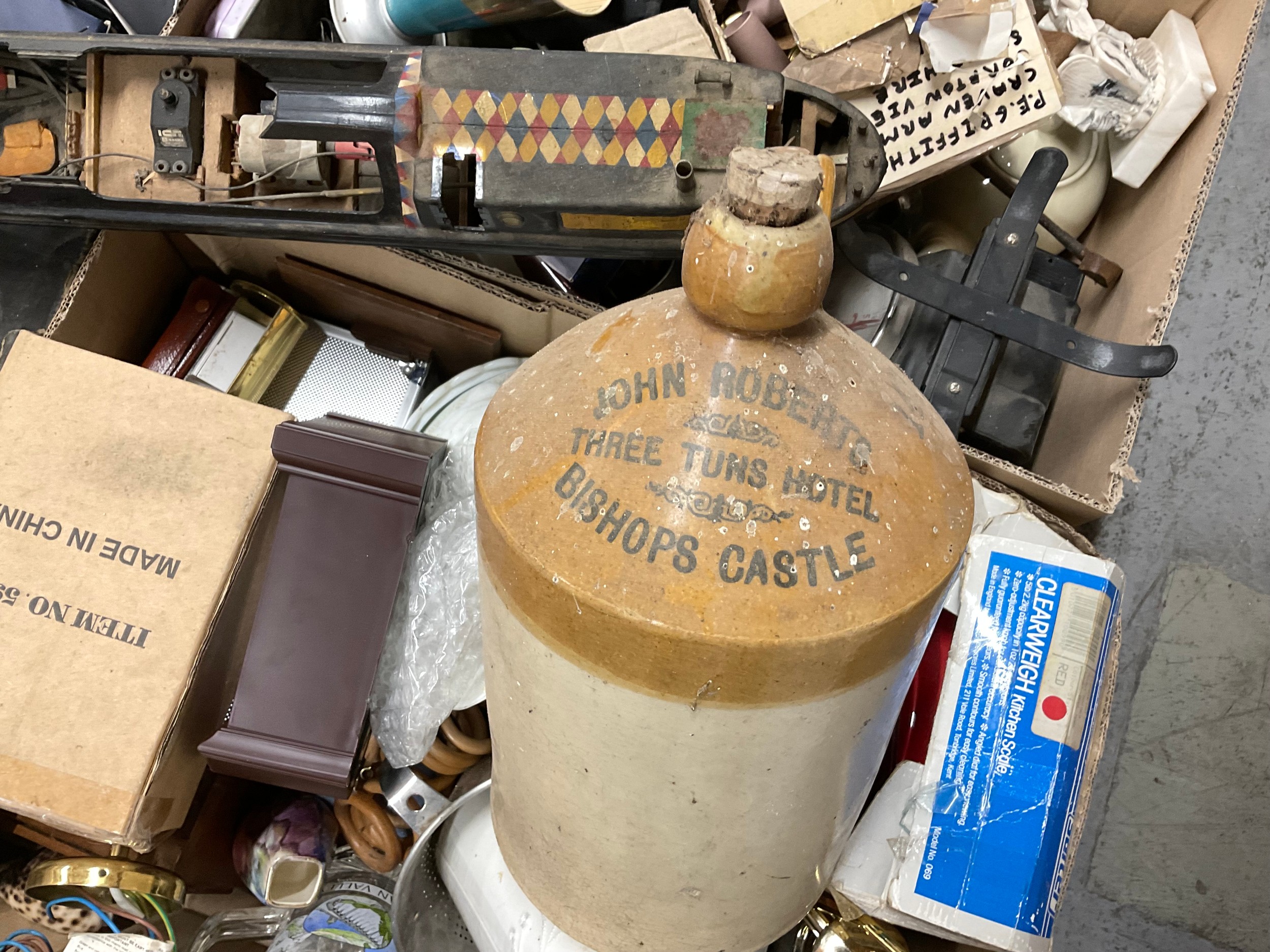 4 BOXES OF COLLECTABLES TO INCLUDE BISHOPS CASTLE STONEWARE FLAGON, METAL BARGE ETC