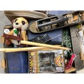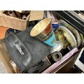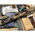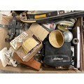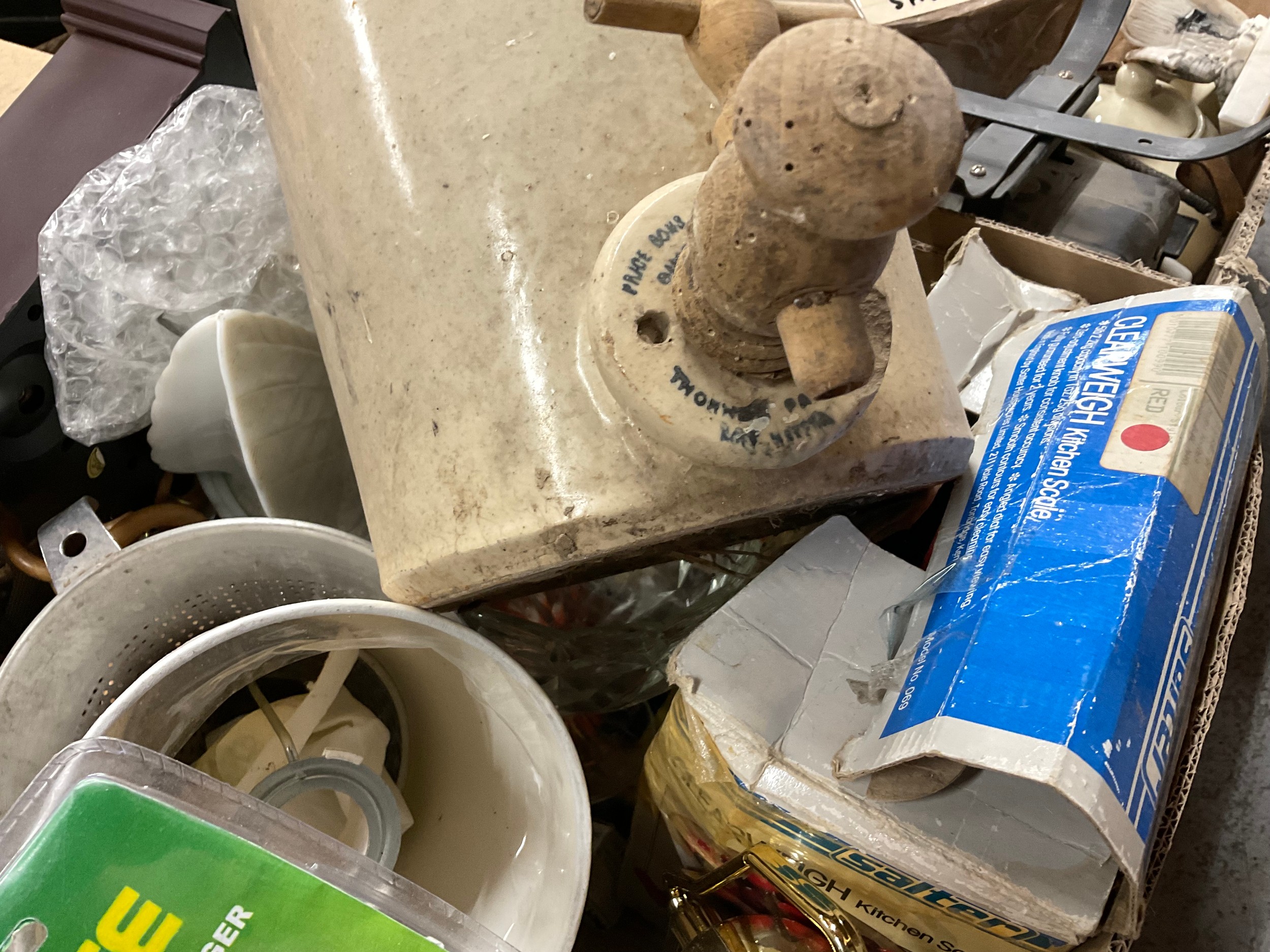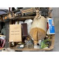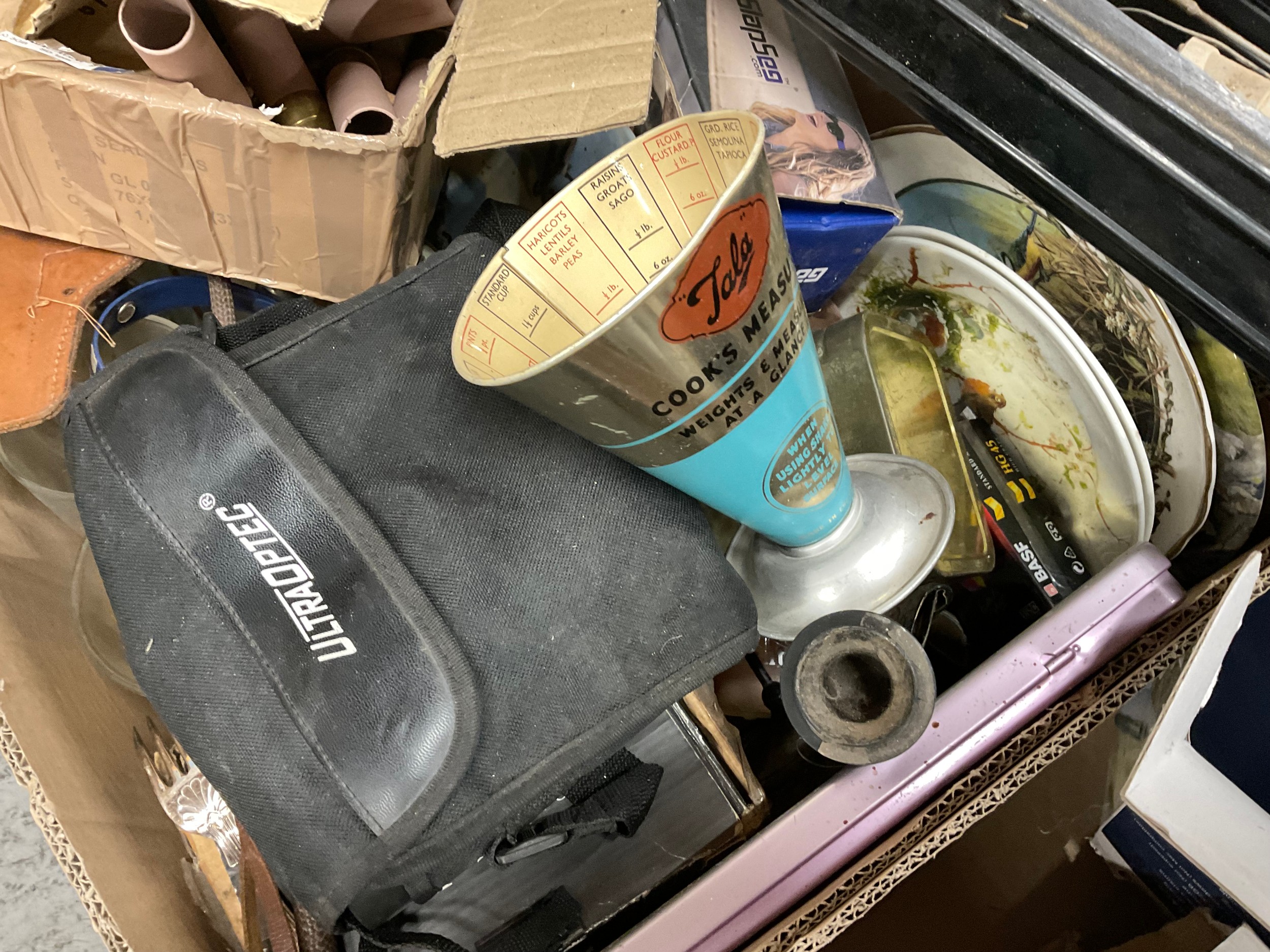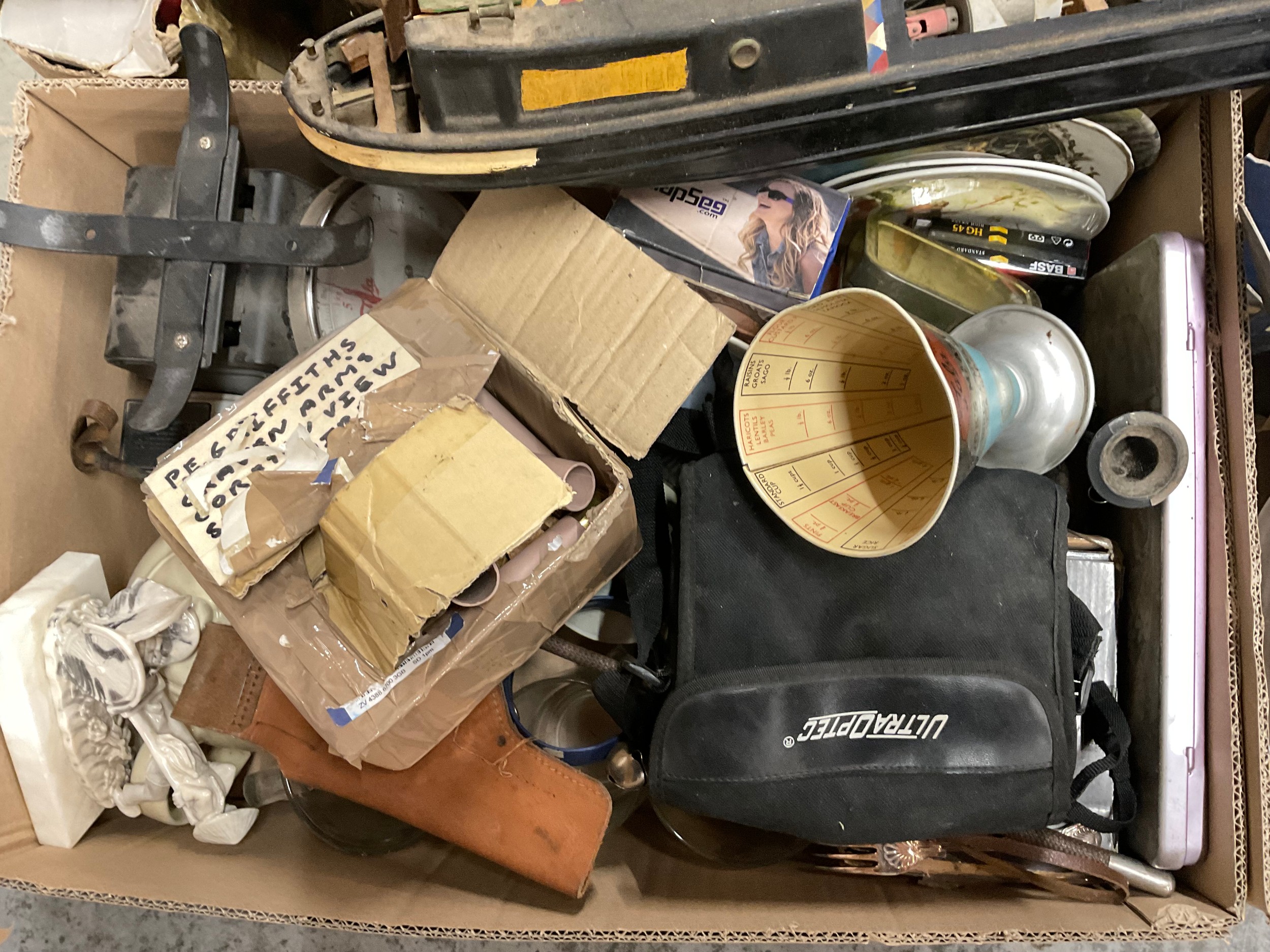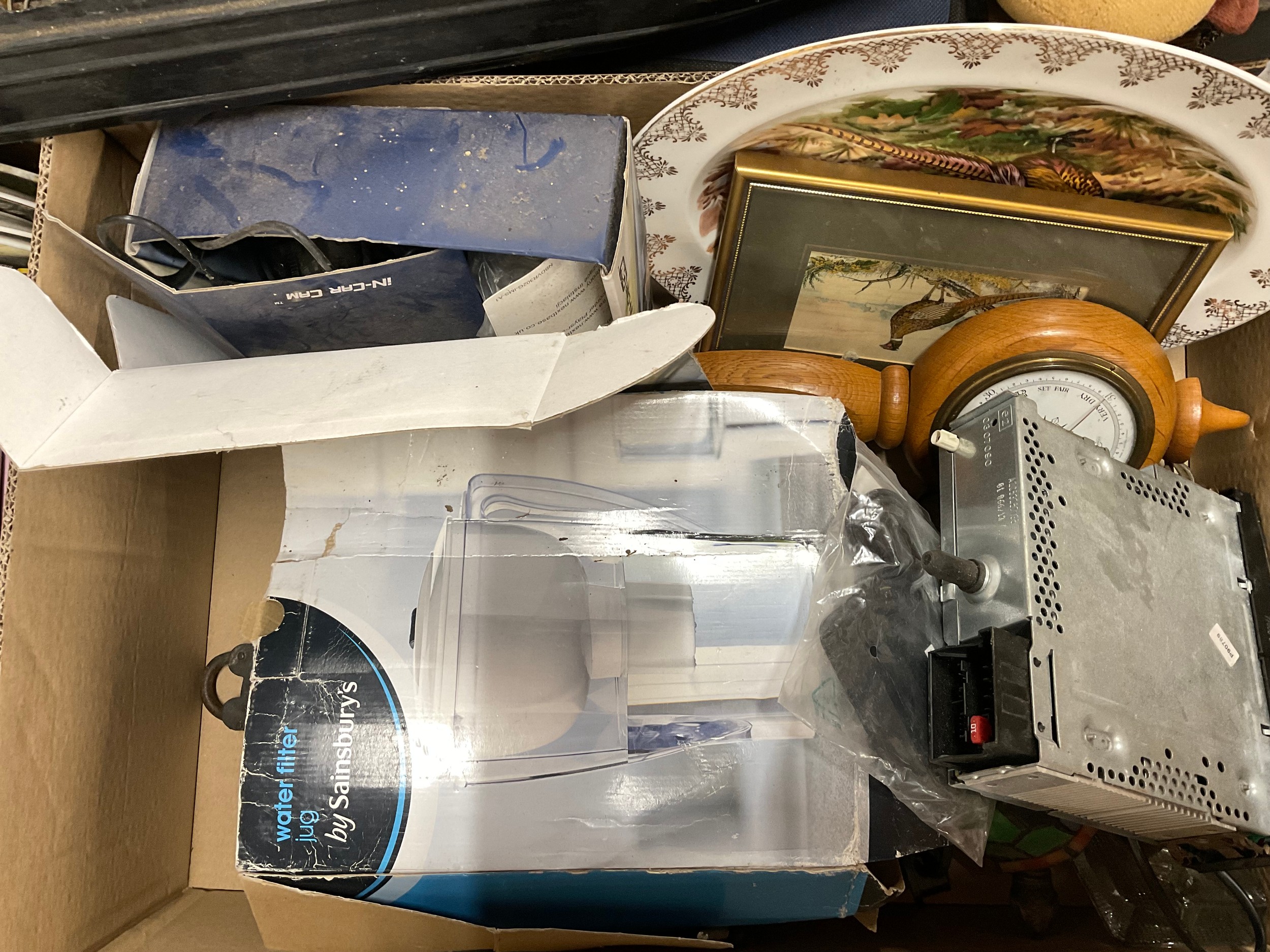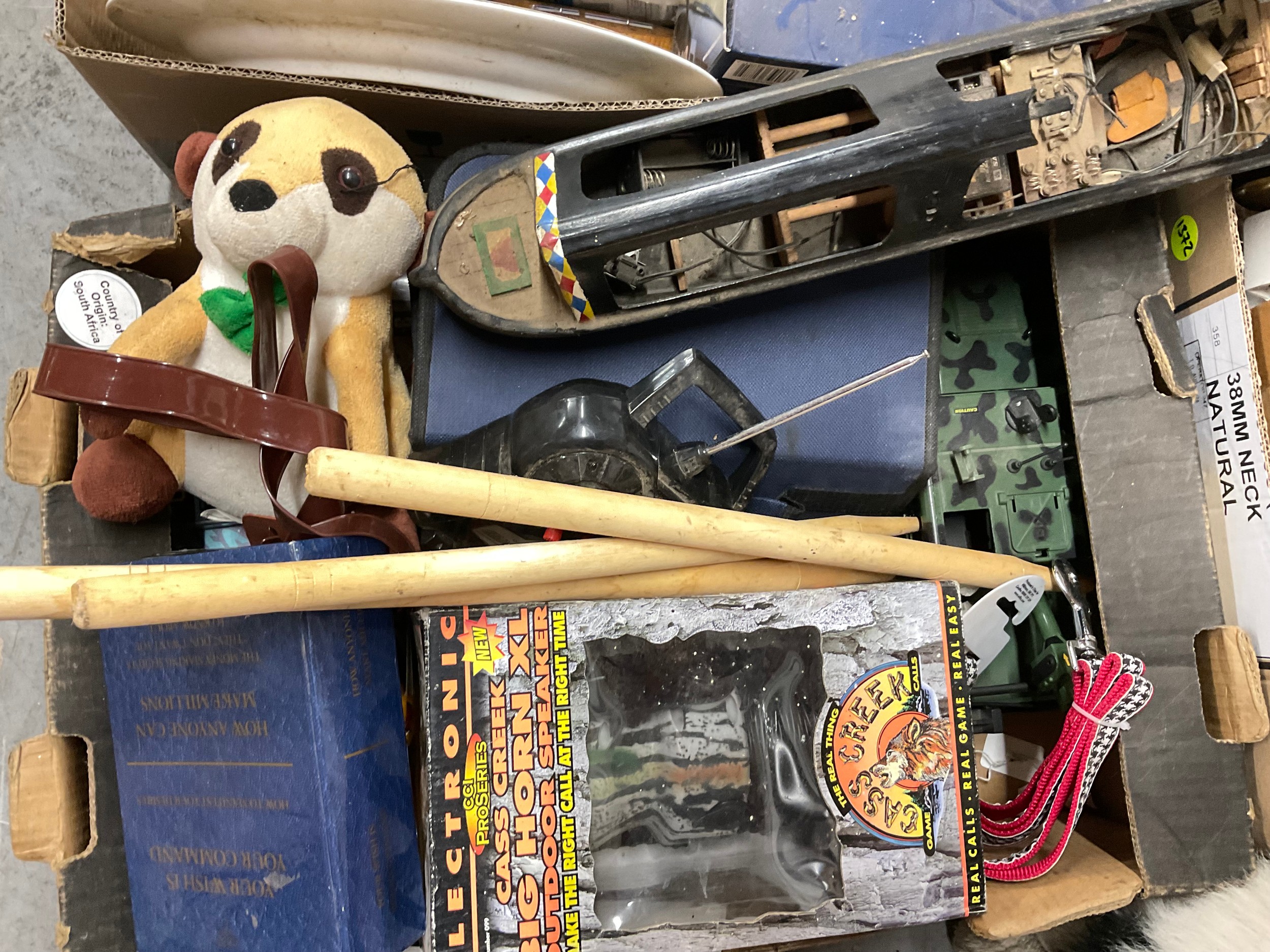 4 BOXES OF COLLECTABLES TO INCLUDE BISHOPS CASTLE STONEWARE FLAGON, METAL BARGE ETC
