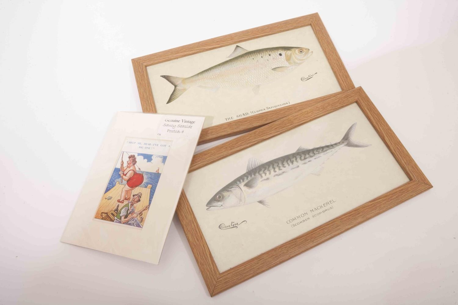 A shad and mackerel print with a saucy seaside postcard