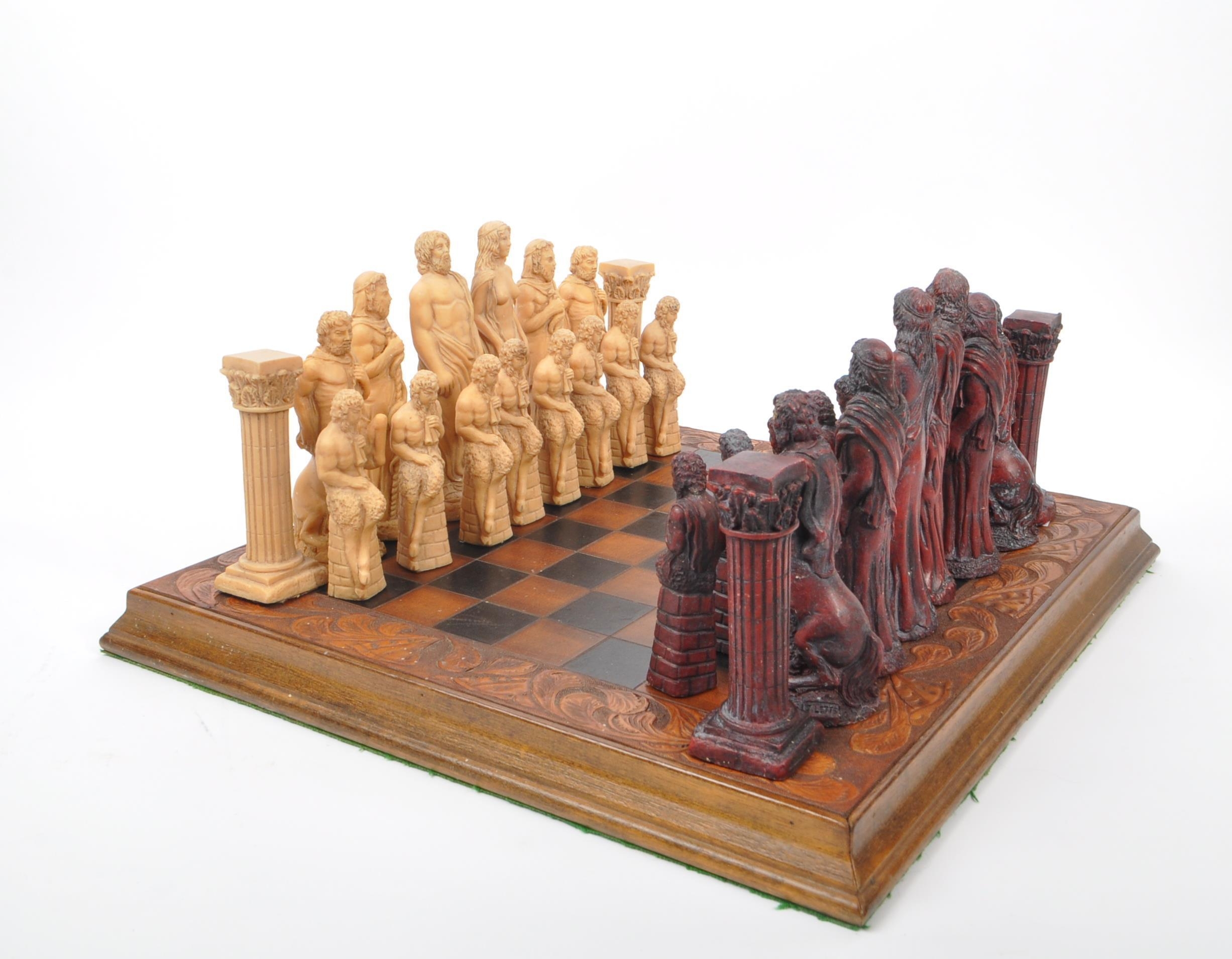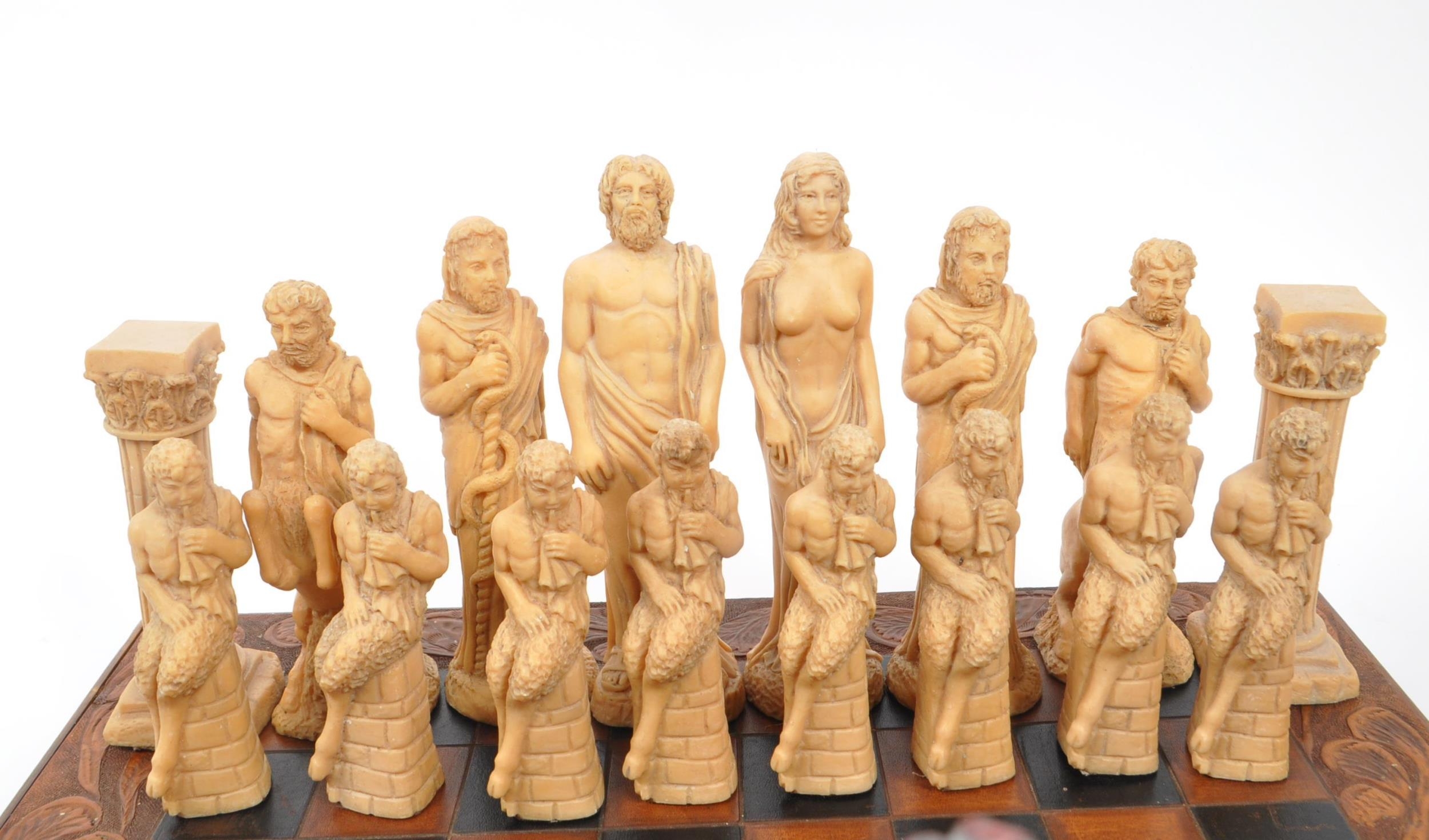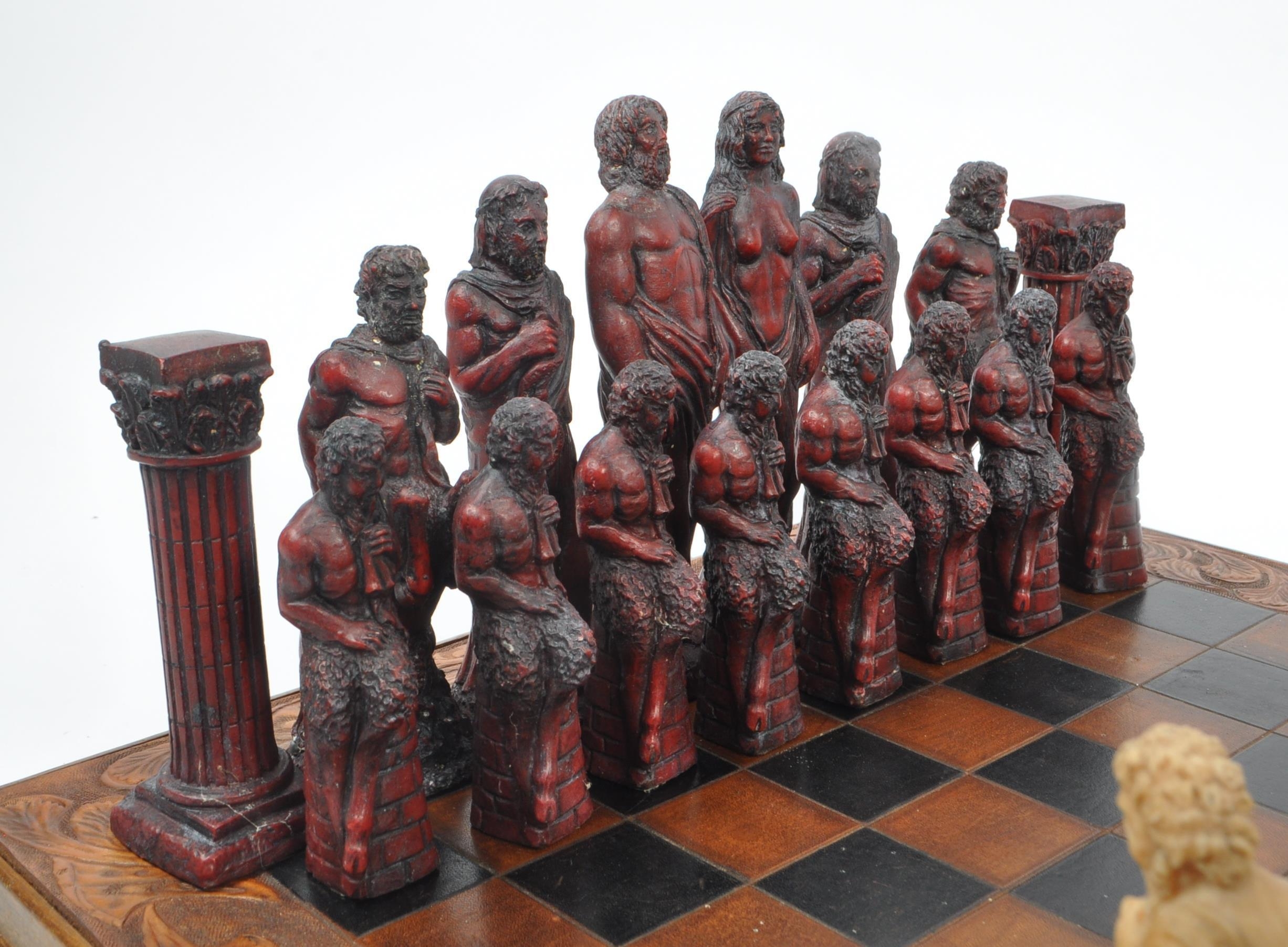 J Letts - Gods of Mythology - A 20th century resin J. Letts Gods of Mythology chess set, alongside leather inlaid chess board. The chess pieces each cast in resin, featuring mythological figures. The chess board having oak surround, with inset leather top. Featuring relief foliate design to surround.