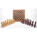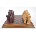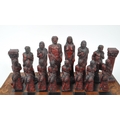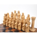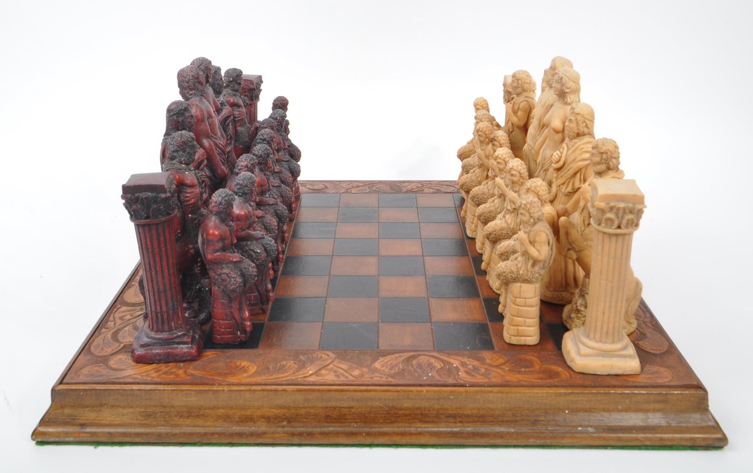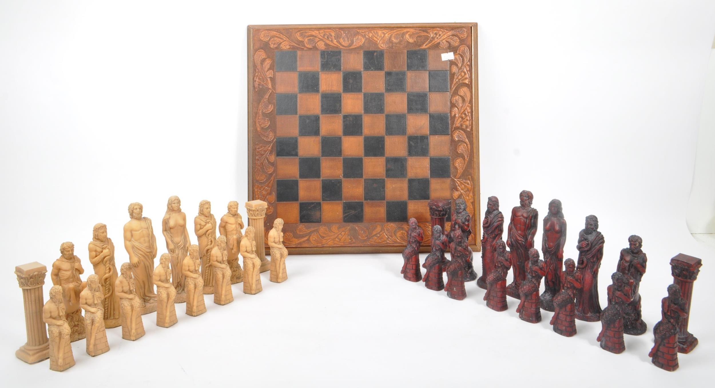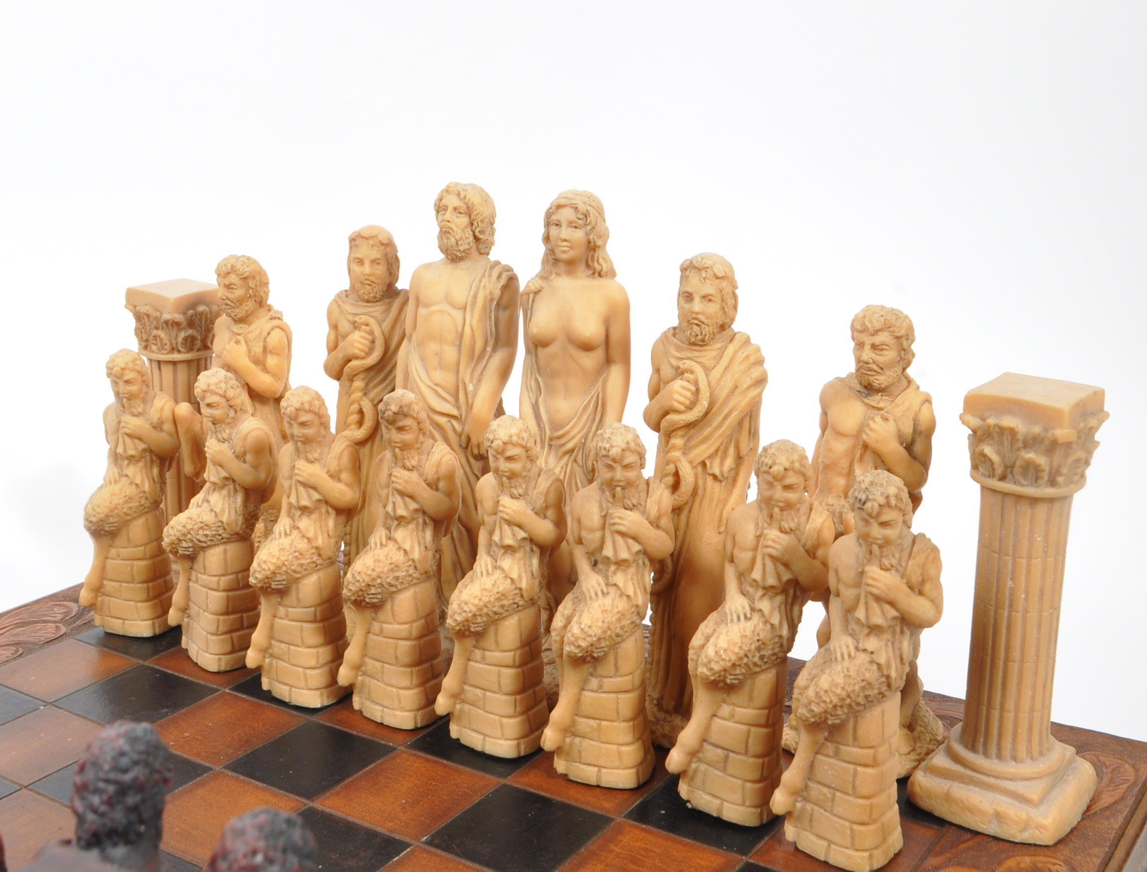 J Letts - Gods of Mythology - A 20th century resin J. Letts Gods of Mythology chess set, alongside leather inlaid chess board. The chess pieces each cast in resin, featuring mythological figures. The chess board having oak surround, with inset leather top. Featuring relief foliate design to surround.