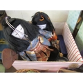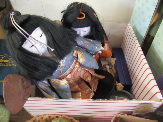BOX OF MISCELLANEOUS ORNAMENTS WITH DOLLS AND MOTHER OF PEARL SPOONS