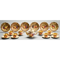 A Royal Worcester two handled pot pourri vase and cover, c1970, painted by Freeman, signed with a continuous still life of fruit, the rims and handles gilt, 17cm high, black printed mark