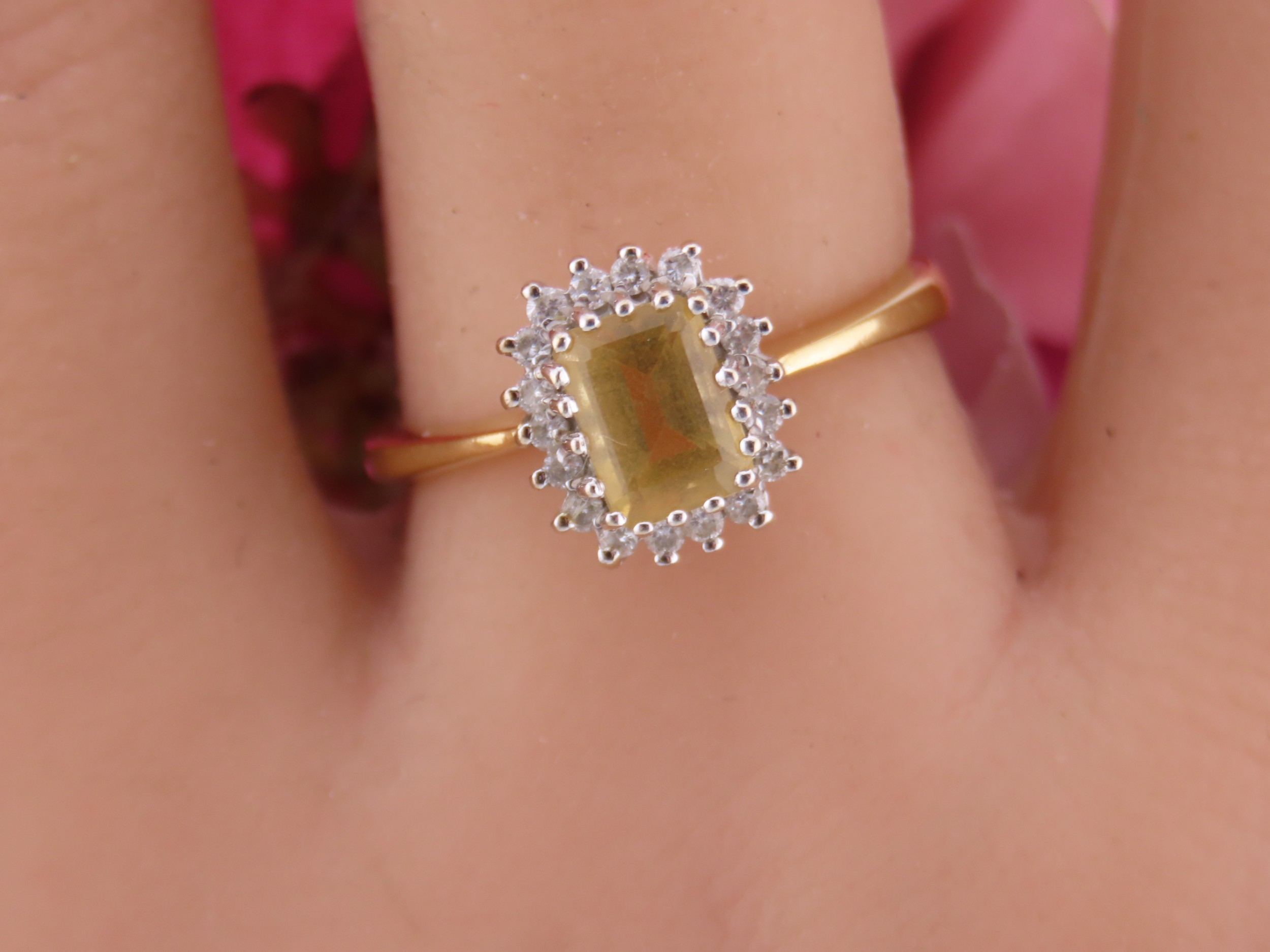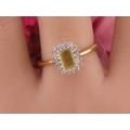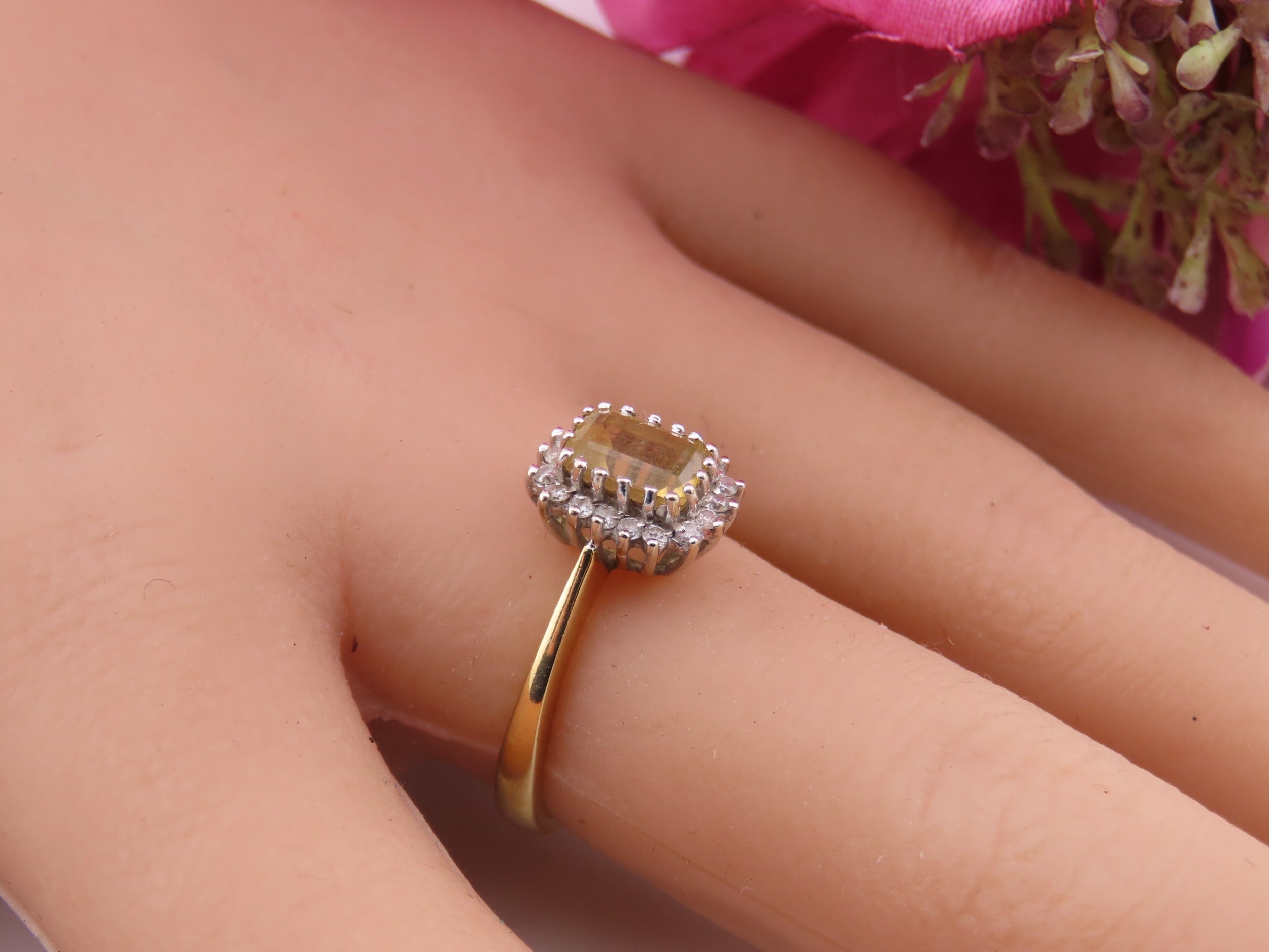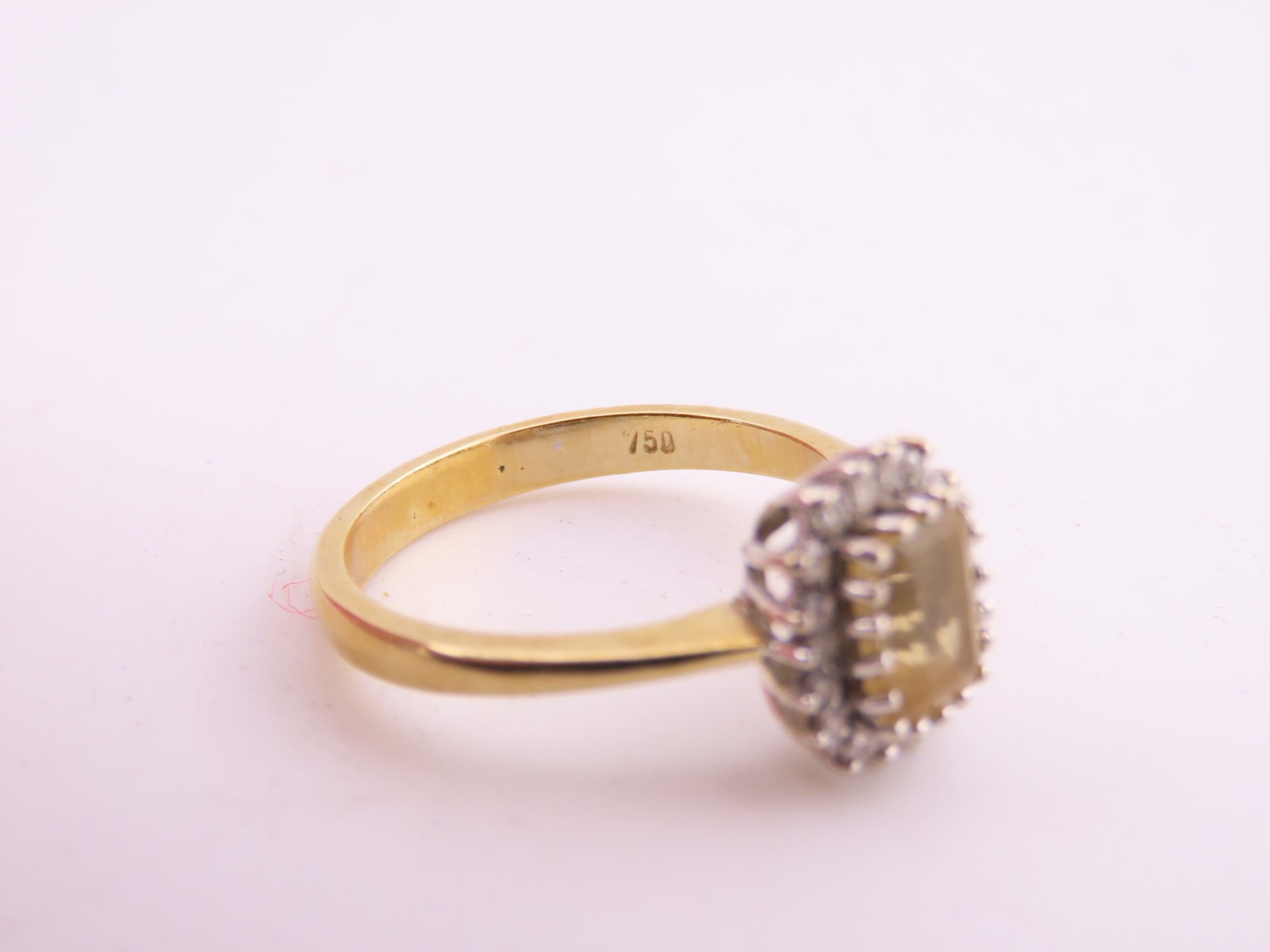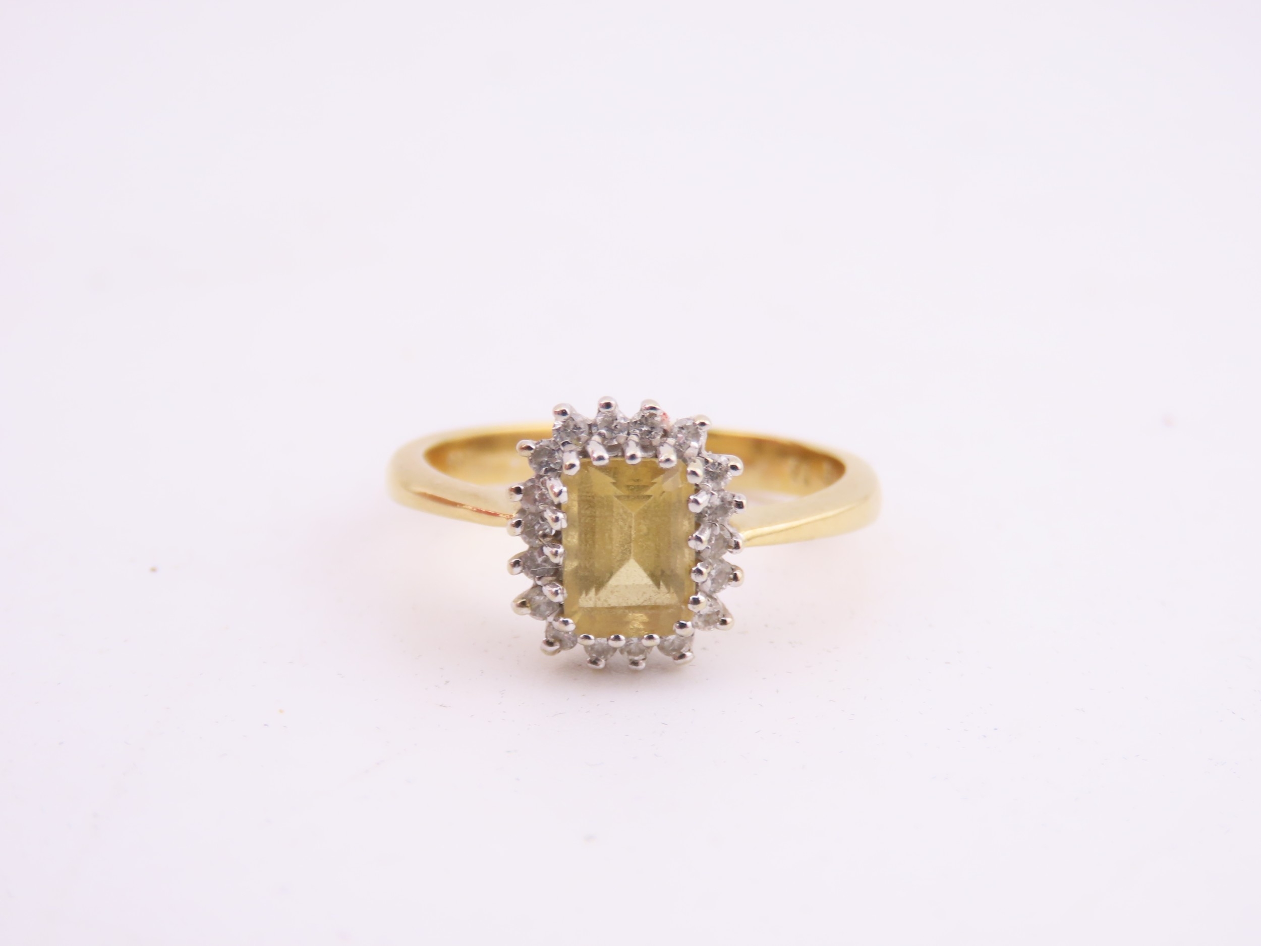 An 18ct yellow gold ring claw set with a rectangular cut citrine accented by small brilliant cut diamonds, the shoulders plain polished. Ring size O. Gross weight 3.9 grams.