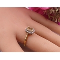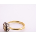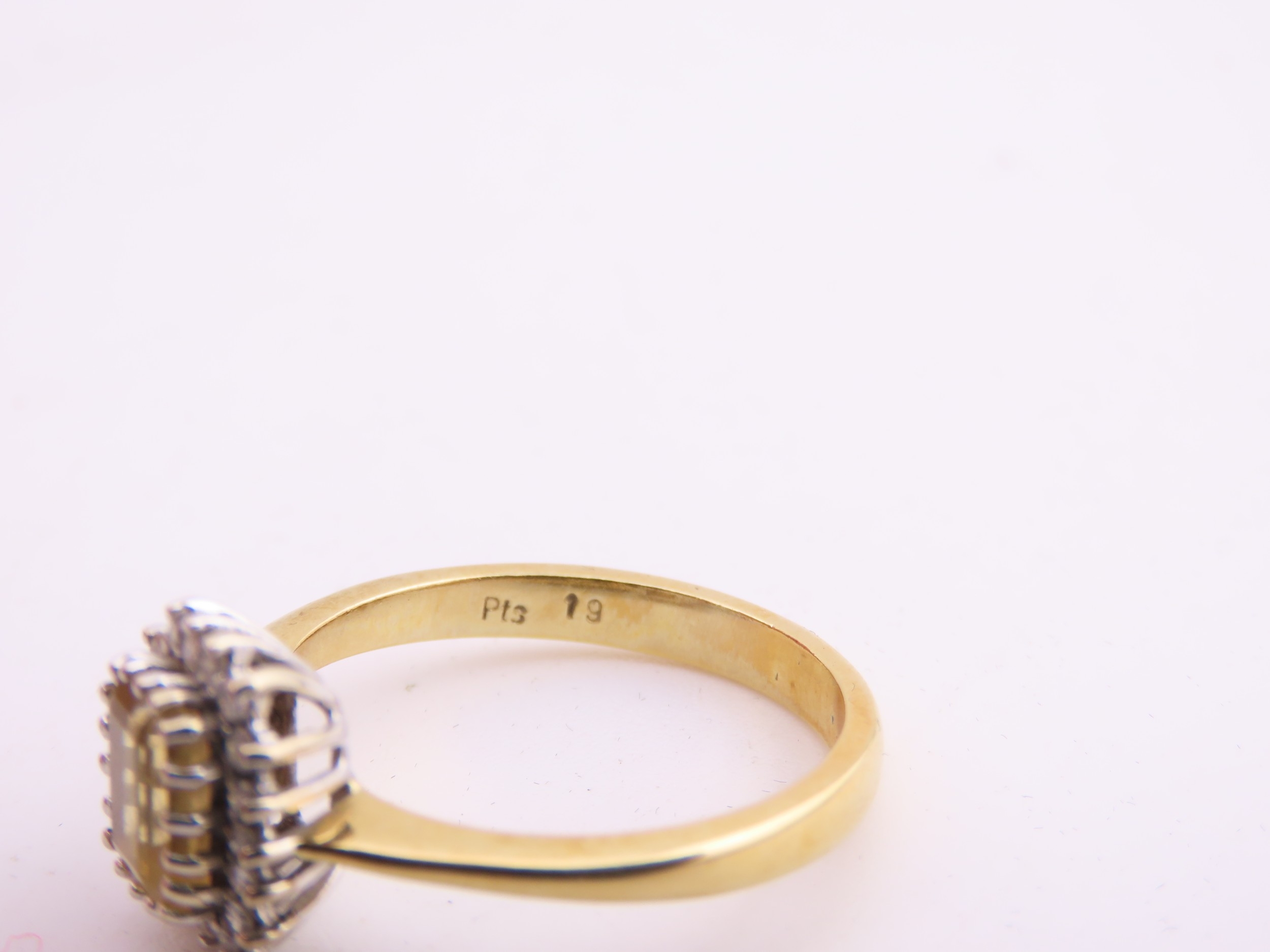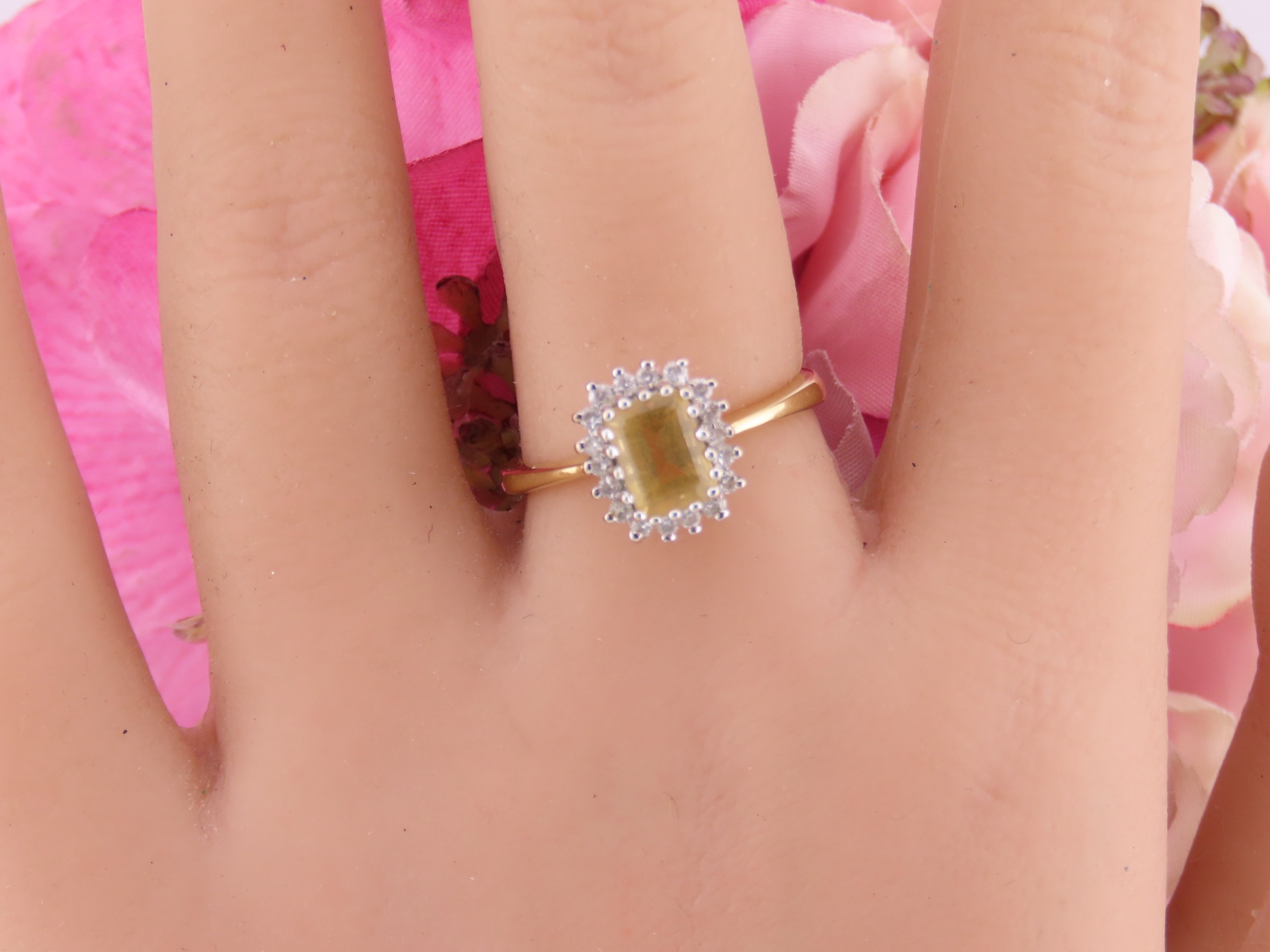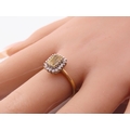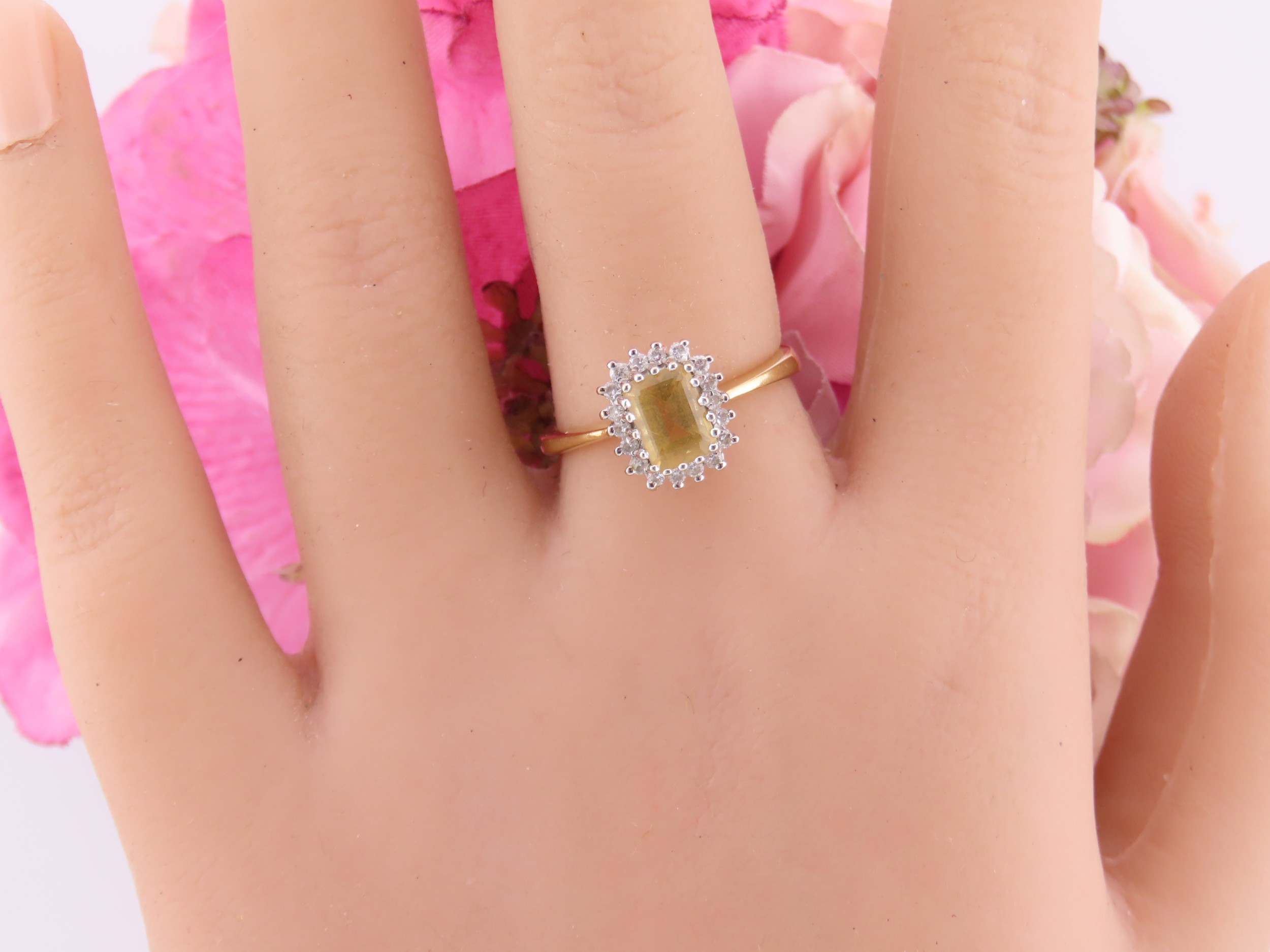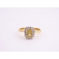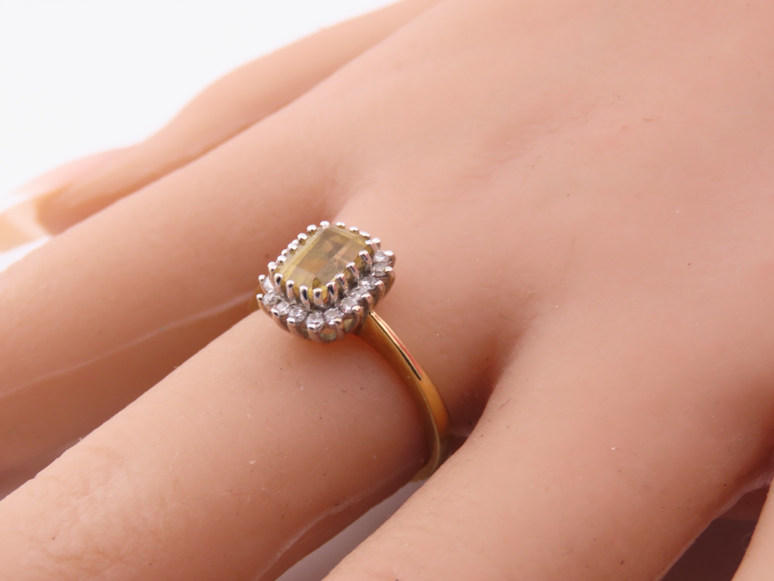 An 18ct yellow gold ring claw set with a rectangular cut citrine accented by small brilliant cut diamonds, the shoulders plain polished. Ring size O. Gross weight 3.9 grams.