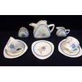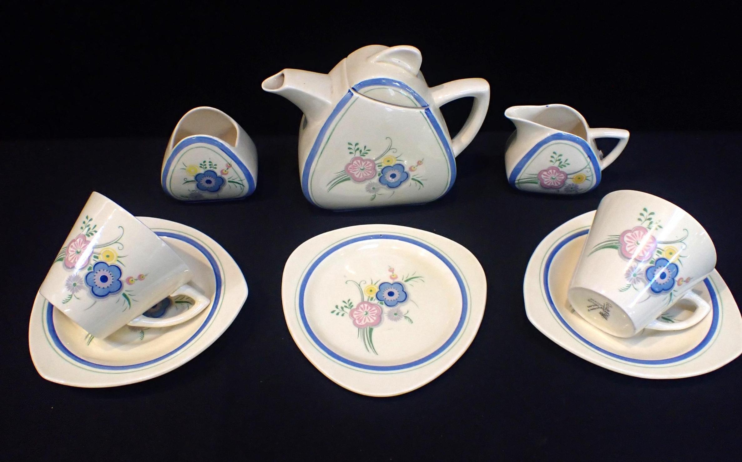CLARICE CLIFF: WILKINSON Ltd 'MATANA' ART DECO TEA SETfor two, transfer printed, the teapot 13cm high