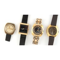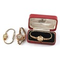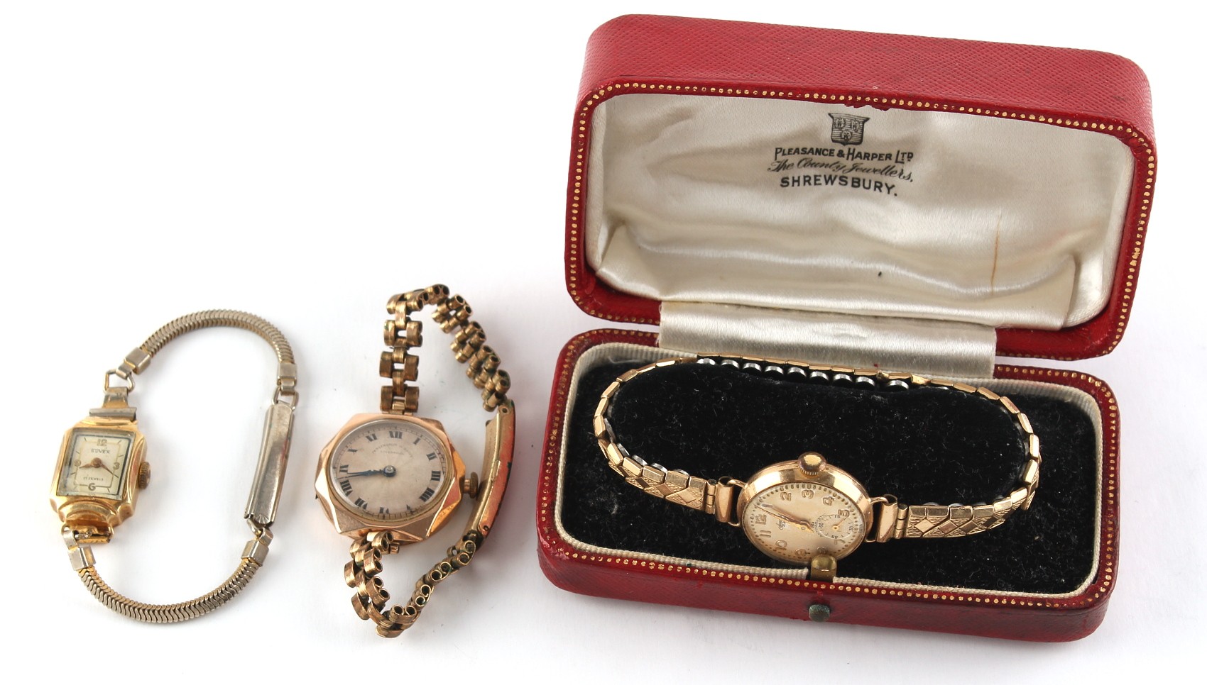 Property of a deceased estate, a private collection of watches - three lady's gold wristwatches, comprising a Suvex 14ct gold rectangular cased wristwatch, and two larger 9ct gold wristwatches, all appear to be working but no guarantees are given, the bracelet straps not gold, one boxed (3).