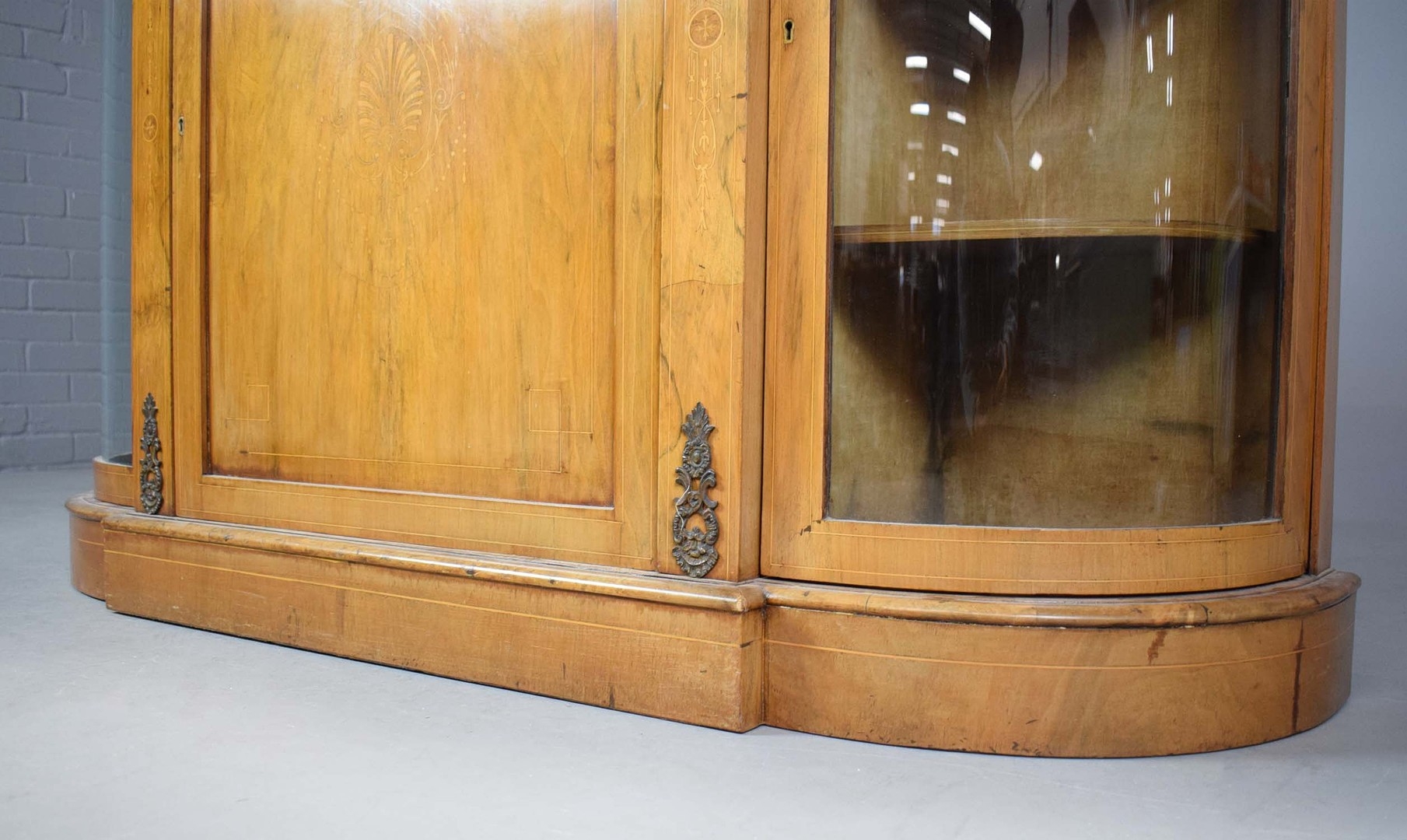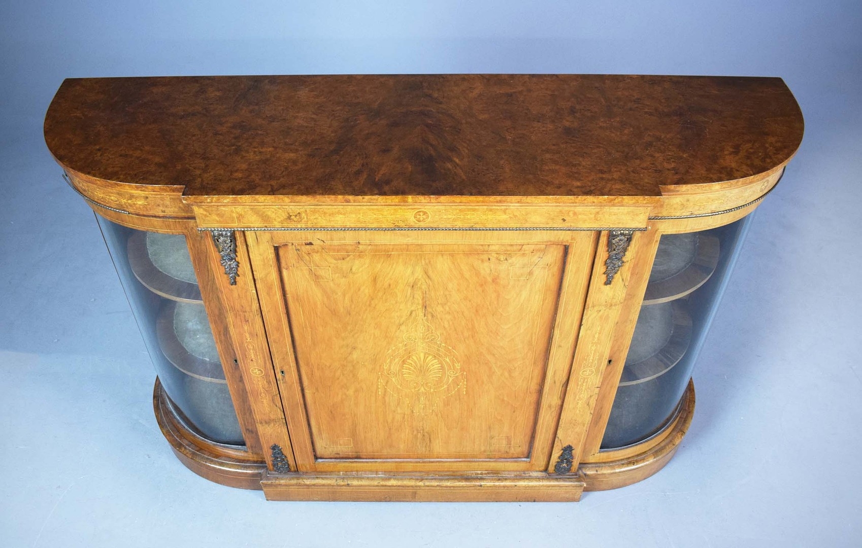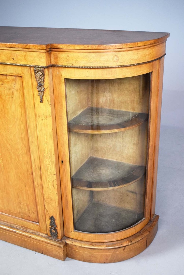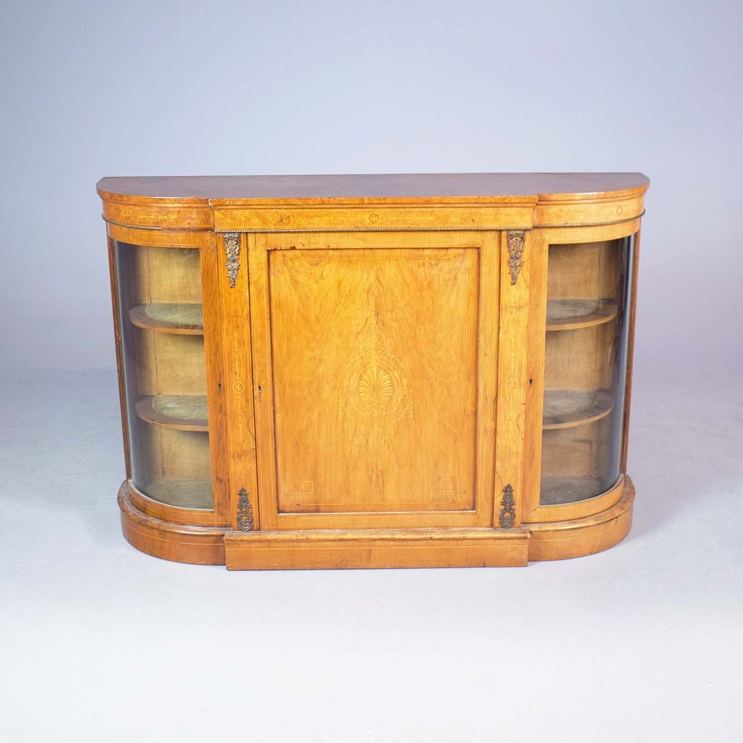 VICTORIAN WALNUT, BURR WALNUT, INLAID AND BRASS MOUNTED CREDENZA. panel door flanked by bowed glazed doors enclosing velvet lined shelves, 100cm H x 150cm W x 40cm D.