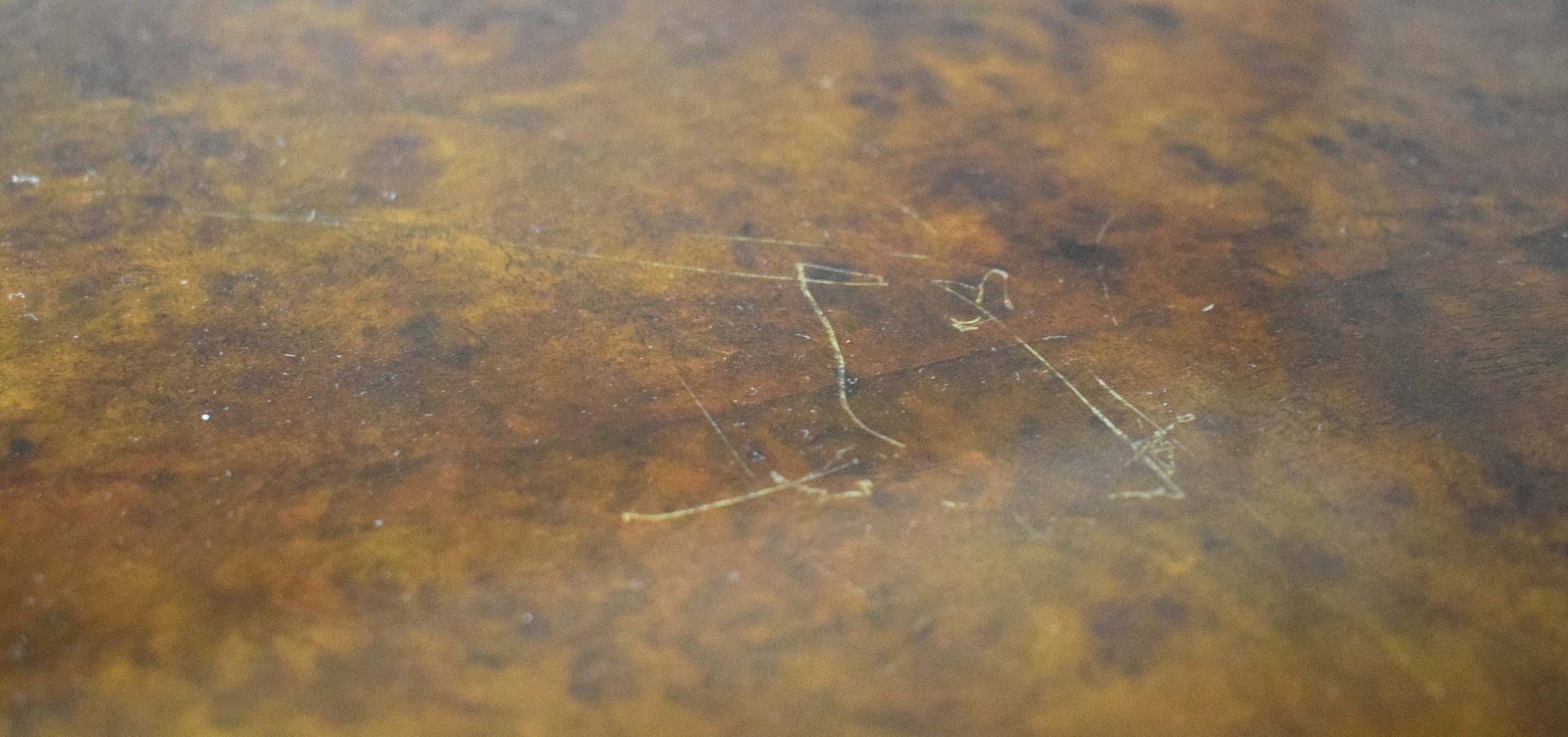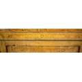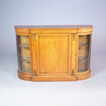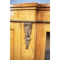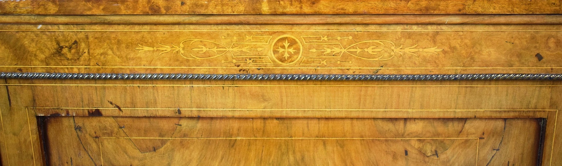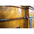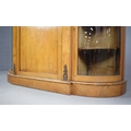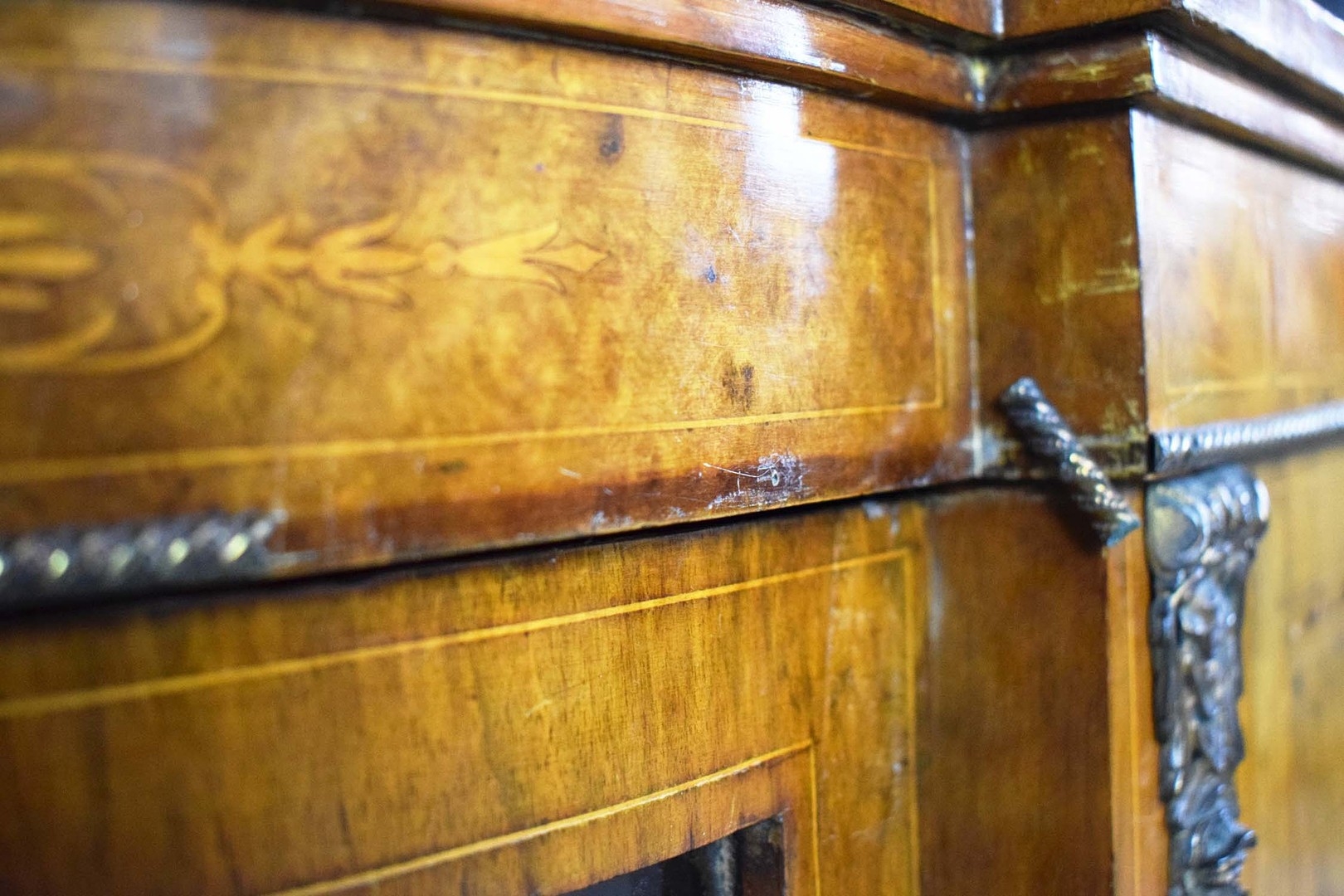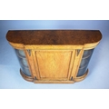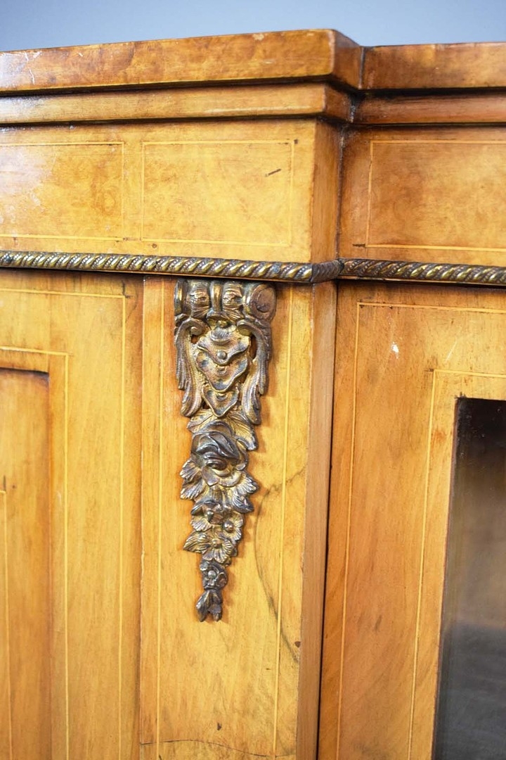VICTORIAN WALNUT, BURR WALNUT, INLAID AND BRASS MOUNTED CREDENZA. panel door flanked by bowed glazed doors enclosing velvet lined shelves, 100cm H x 150cm W x 40cm D.