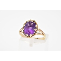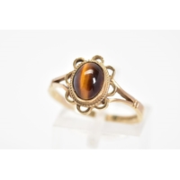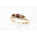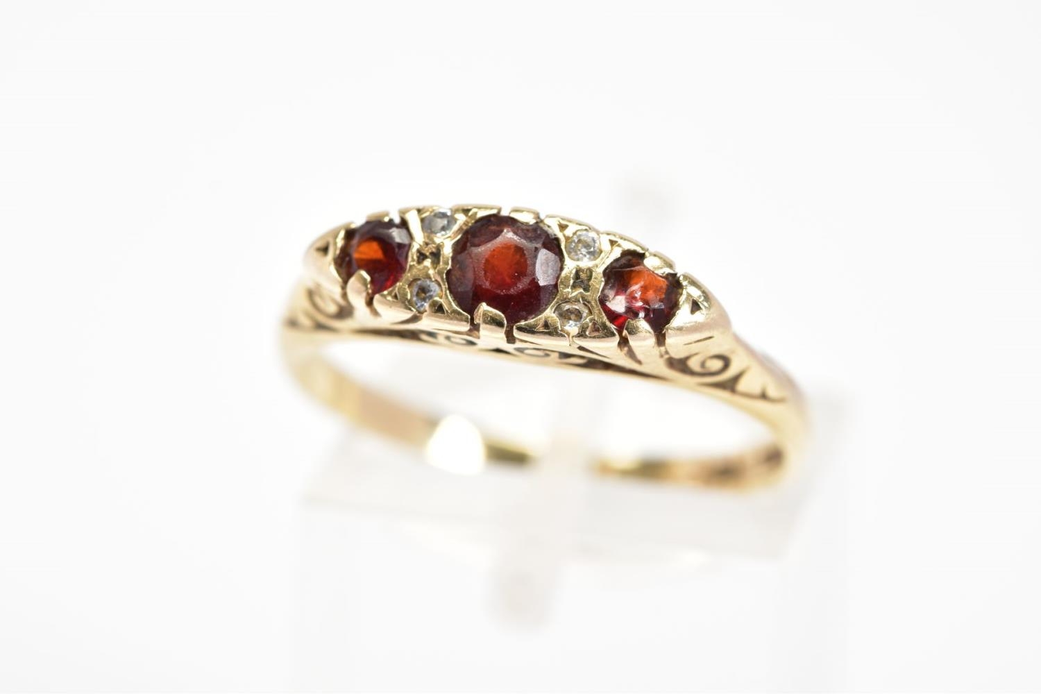 A 9CT GOLD GEM RING, of boat shape design, with a row of three graduated circular garnets interspaced by four circular colourless pastes, to the scrolling gallery, with 9ct hallmark for Birmingham 1987, ring size M 1/2, approximate weight 2.3 grams (condition: chip to one garnet)