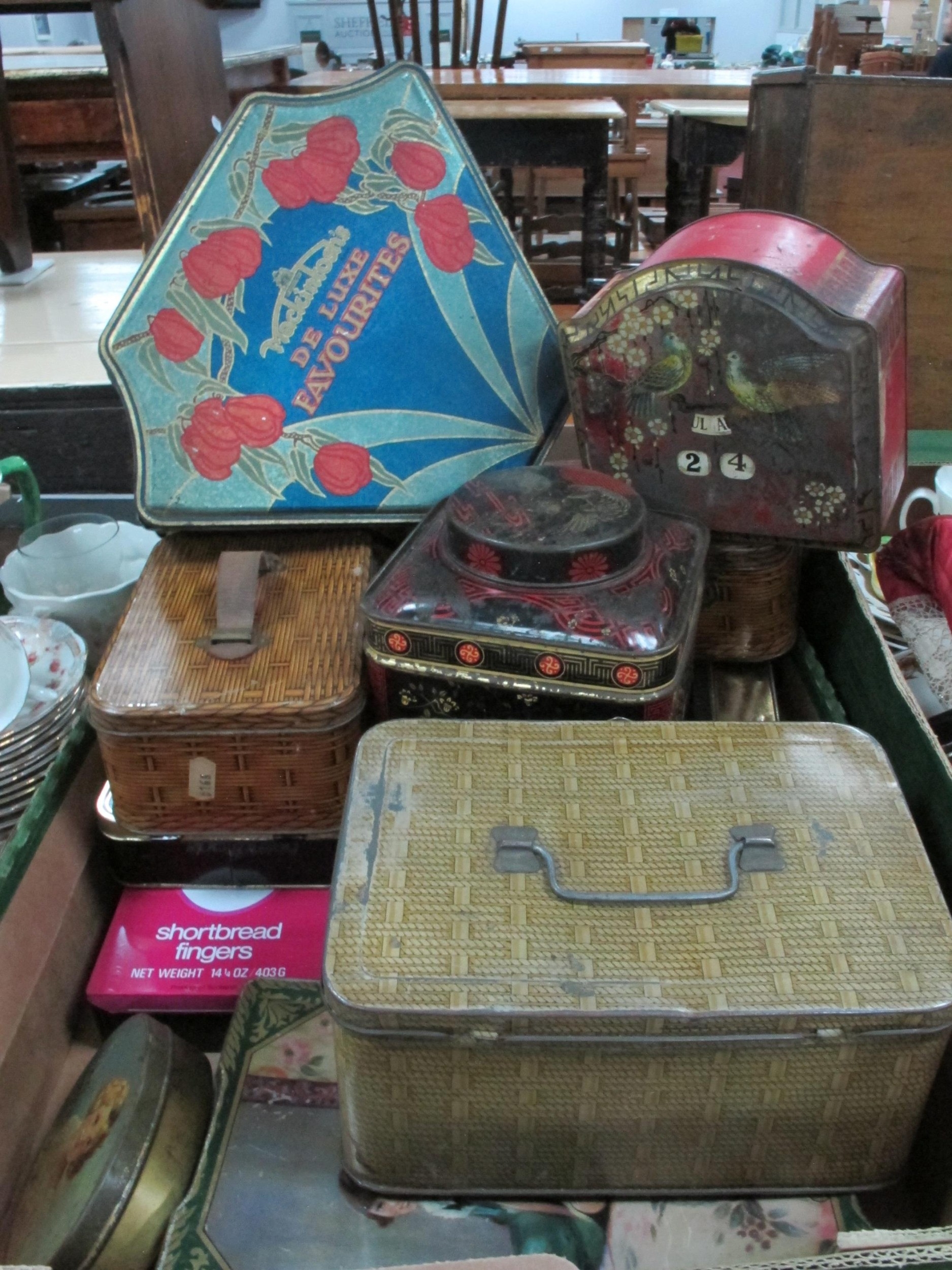 Geo Bassett Sheffield Tin In The Form of a Basket, Mackintosh's De Luxe Favourites Tin, other tins, etc:- One Box.