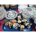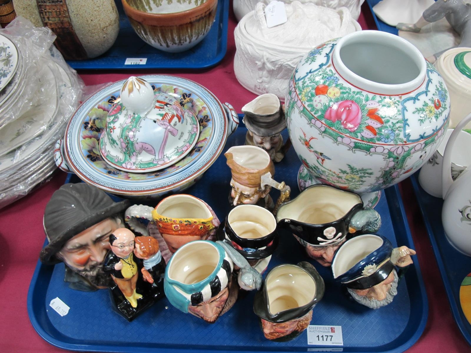 Five Royal Doulton Small Character Jugs , bisque tobacco jar as a fisherman, two Dickens figures, etc:- One Tray.