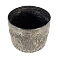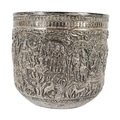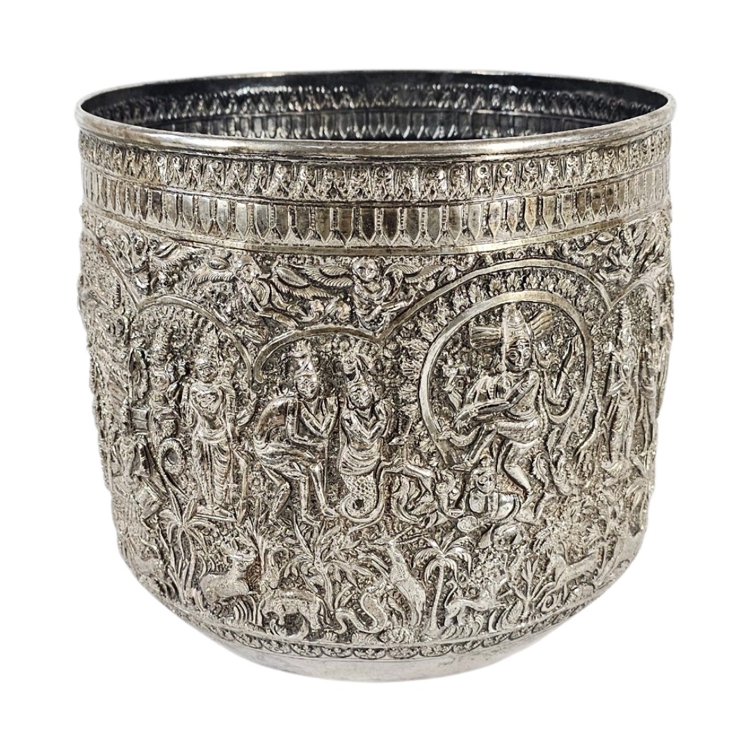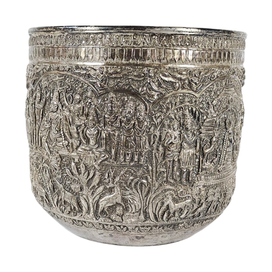 Substantial deep circular form bowl, masterfully chased in high relief with traditional scenes from The Jataka Tales, the elaborate decoration features figures in architectural surrounds beneath a foliate rim.