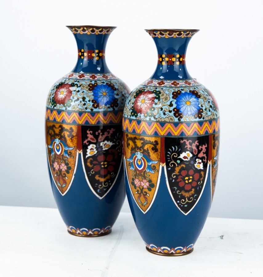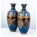 PAIR OF LATE MEIJI PERIOD JAPANESE CLOISONNE VASES, each of Indian club form with waisted neck, decorated in colours with shaped, floral panels, on a mid blue ground, set beneath geometric and flowerhead borders, and between coppered borders, 12 ¼” (31.1cm) high, unmarked, (2)