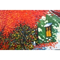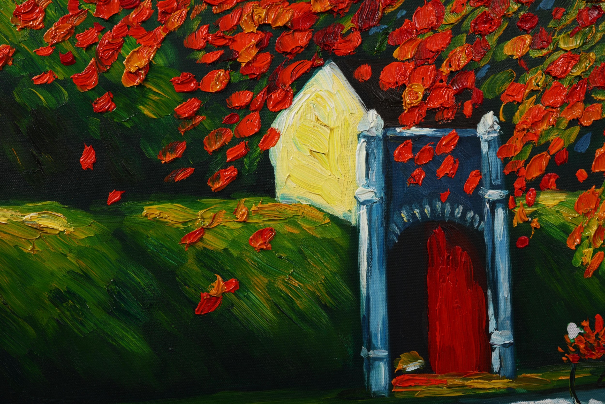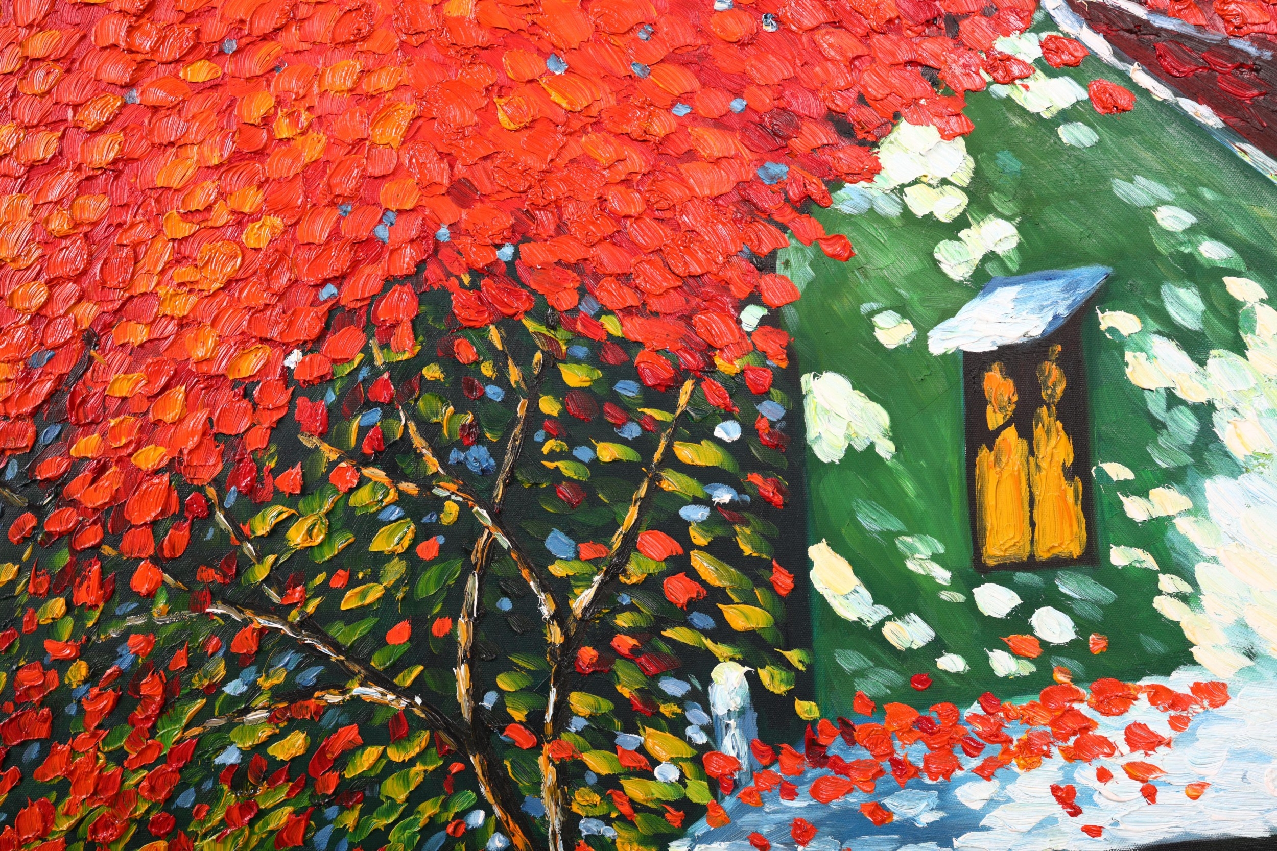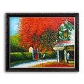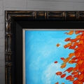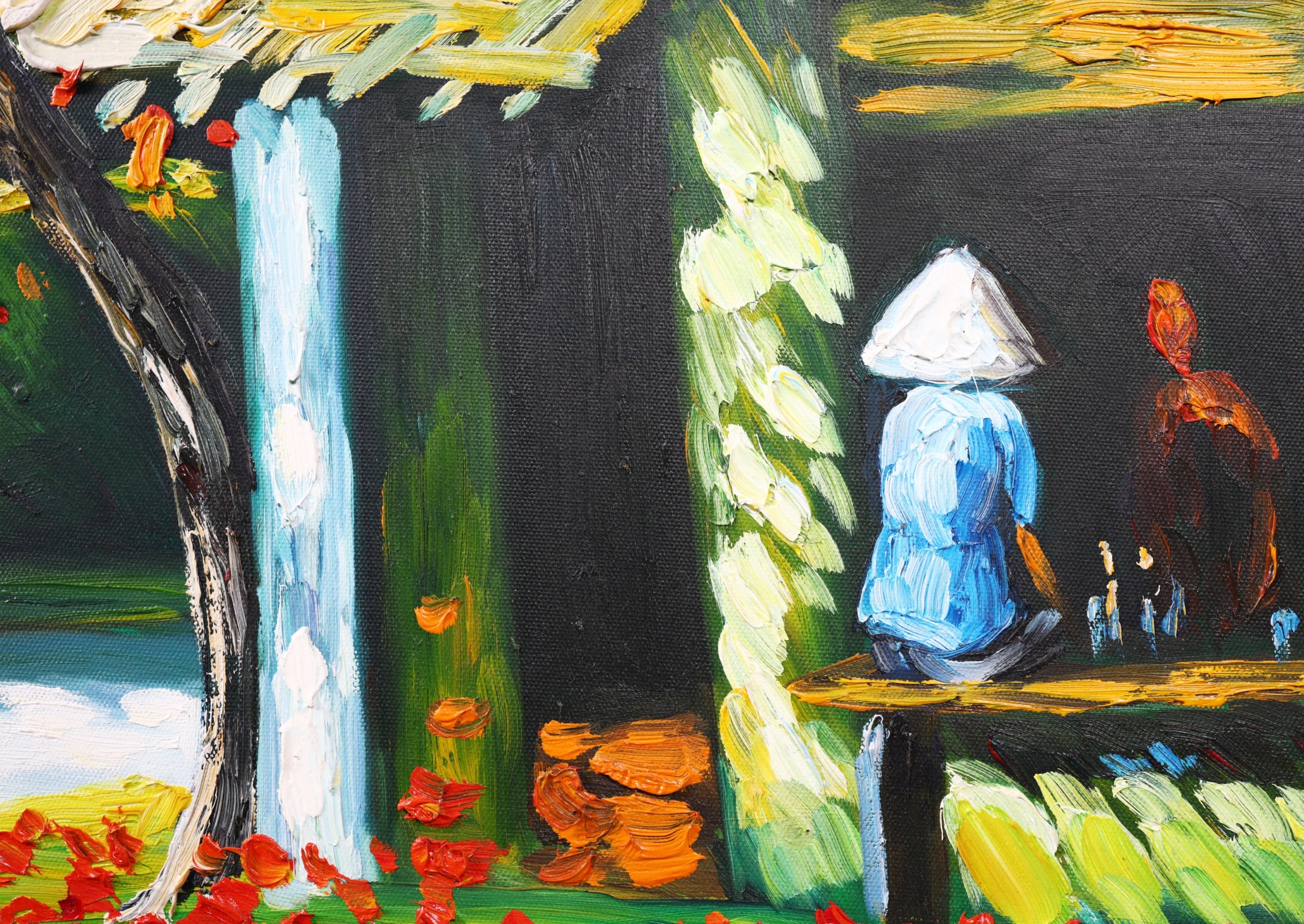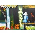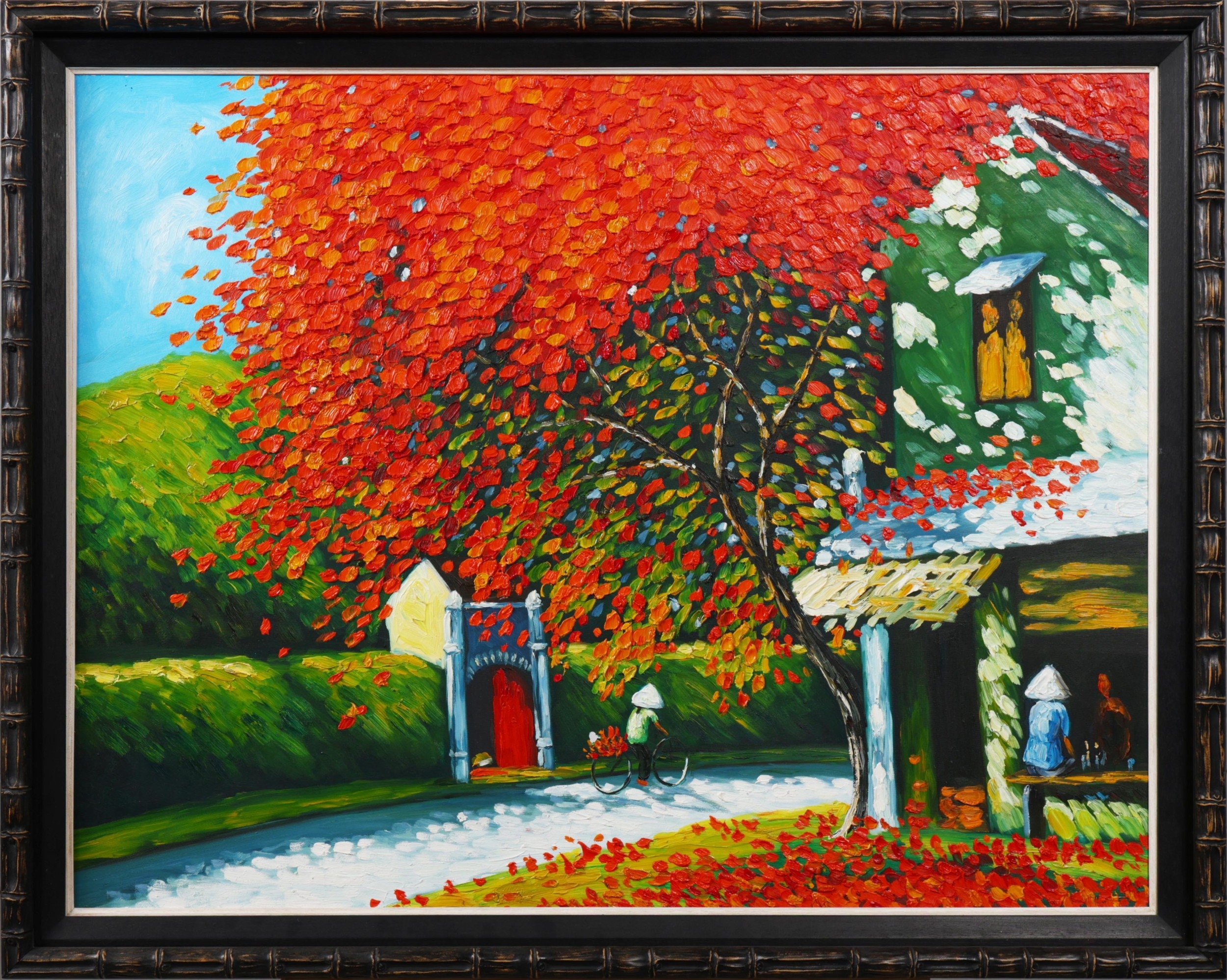 CONTEMPORARY SCHOOL, ASIAN STREET SCENE WITH TREE. on canvas, in a distressed faux bamboo frame, overall 78cm t x 100 cm w.