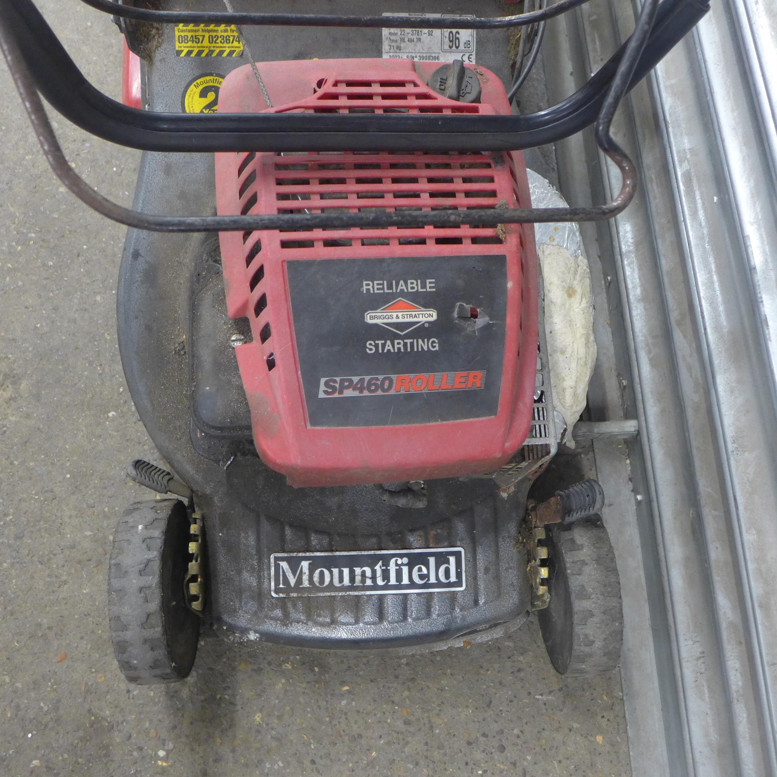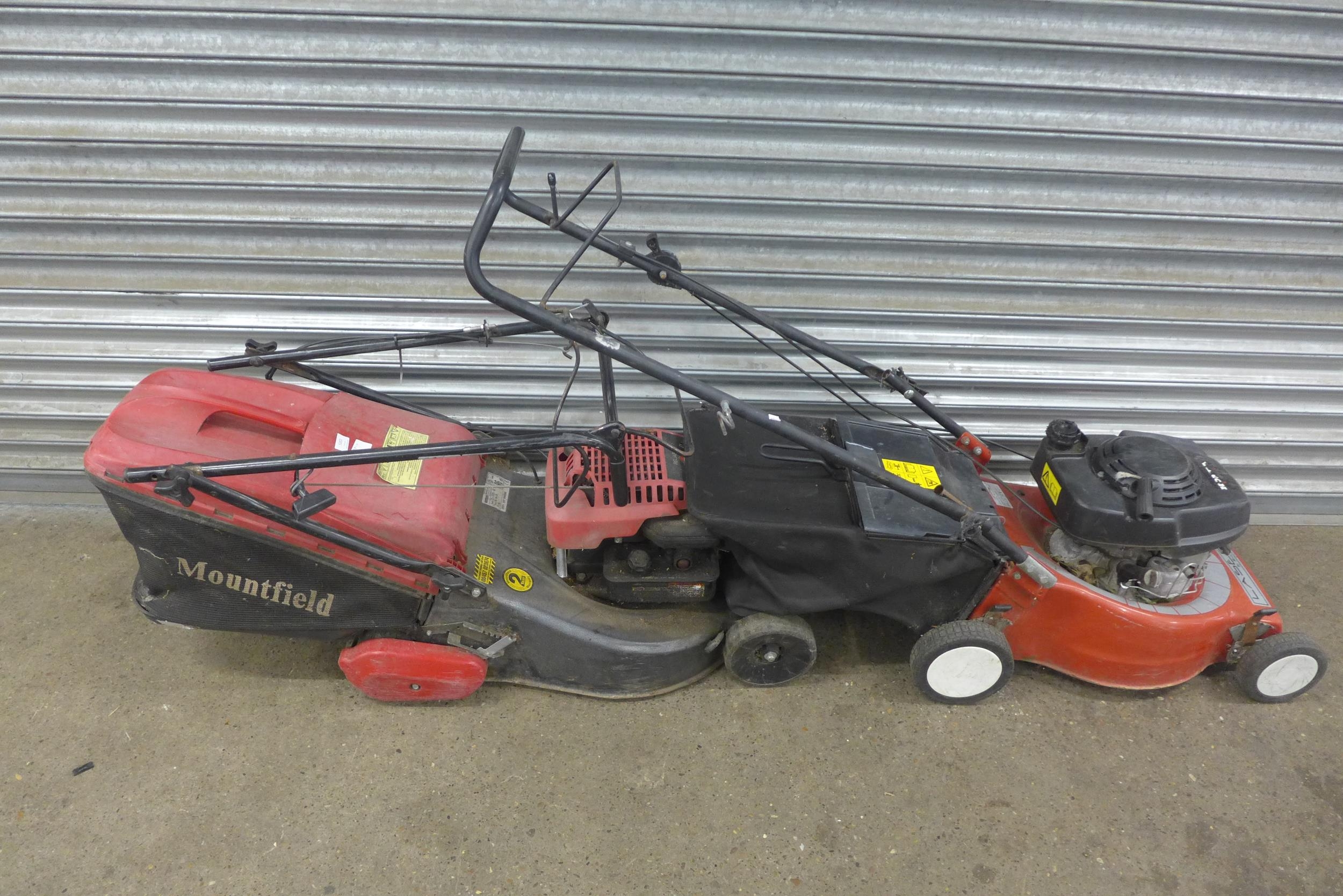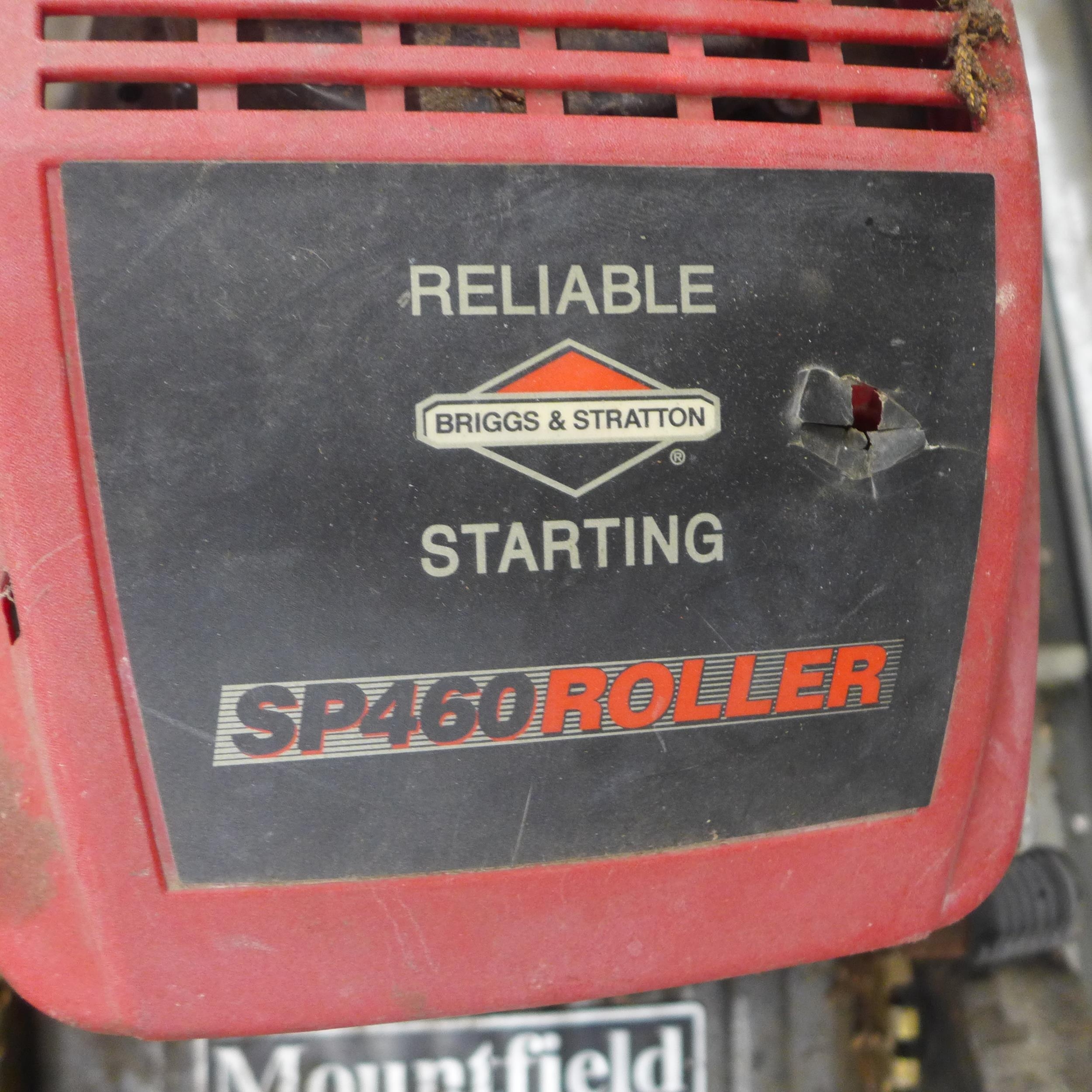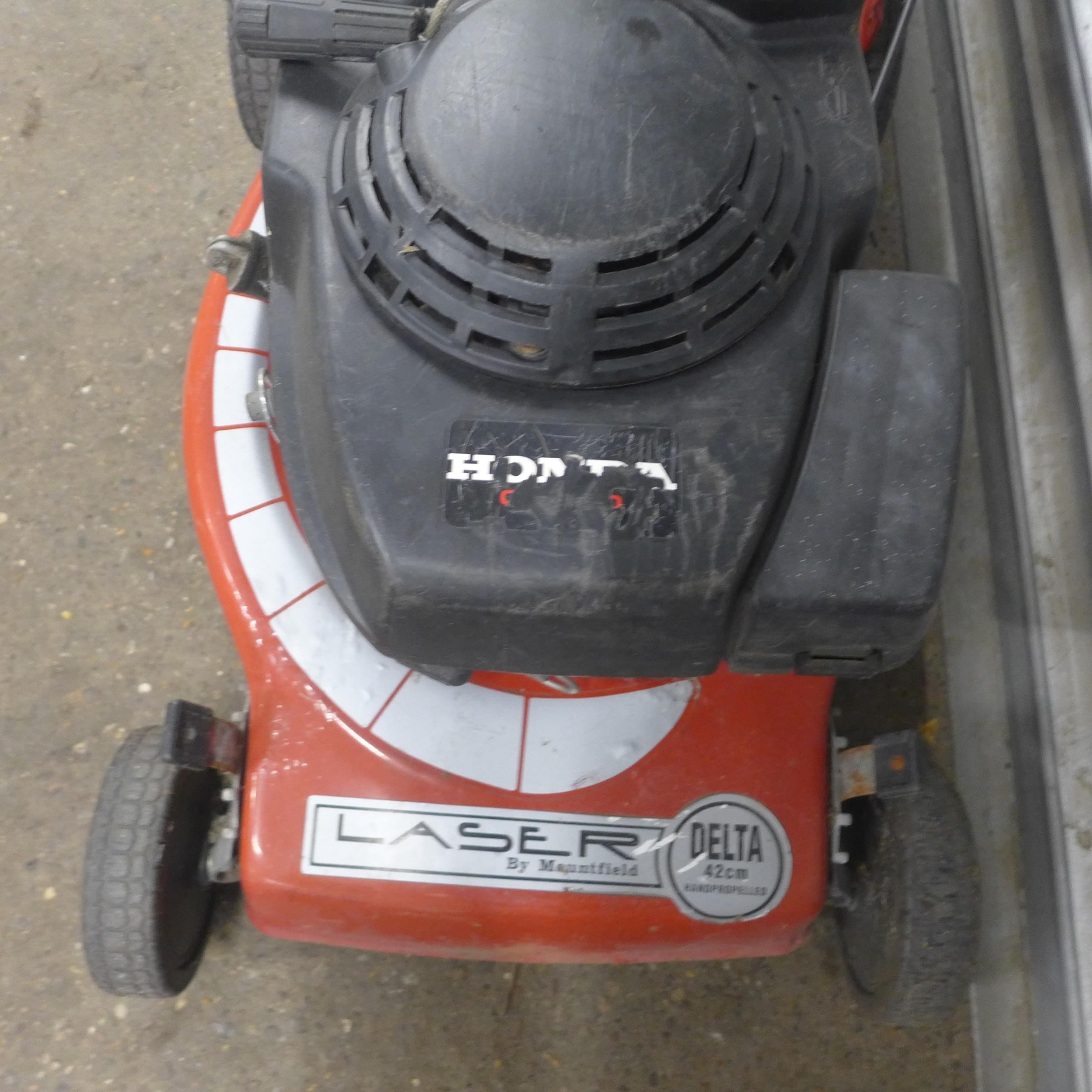 A Laser Delta 42cm hand propelled petrol lawnmower and a Mountfield SP460 roller petrol lawnmower