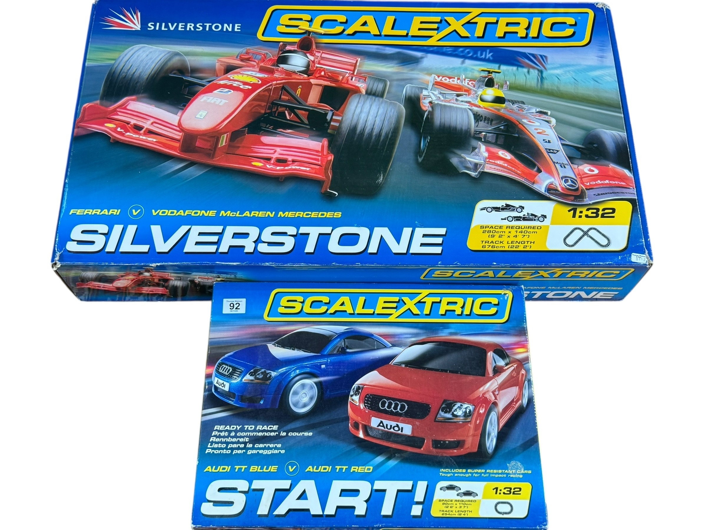 Two Scalextric box sets including Silverstone Ferrari v Vodafone Mclaren Mercedes and Audi TT Blue v Audi TT Red.