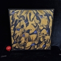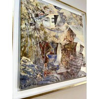 A mixed media acrylic on canvas painting. Features an abstract composition with rhythmic forms and shapes. Rendered in a limited colour palette with rich golds, blacks and indigos. Portrays rich textural element to the piece. Housed in a black frame.