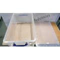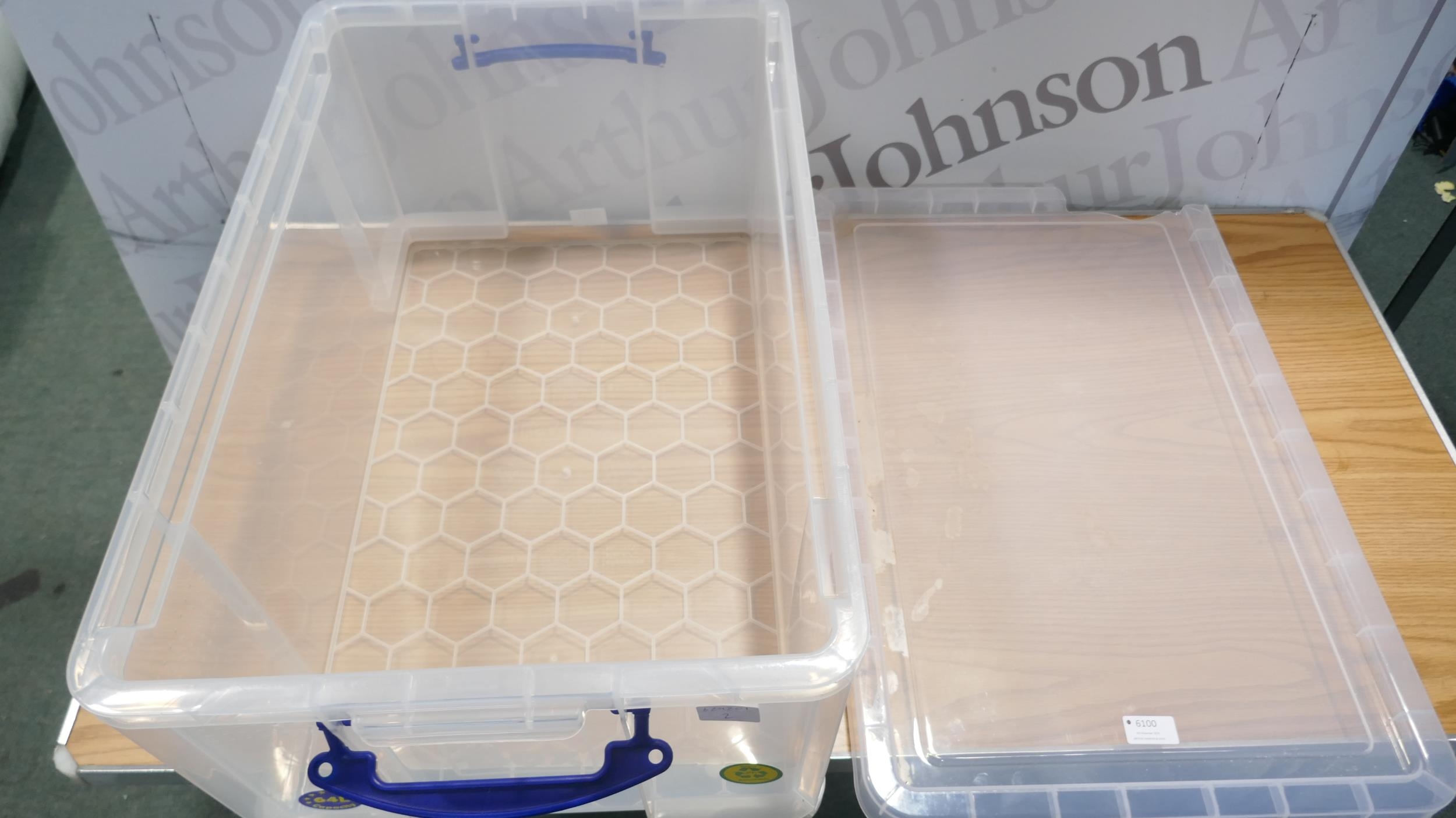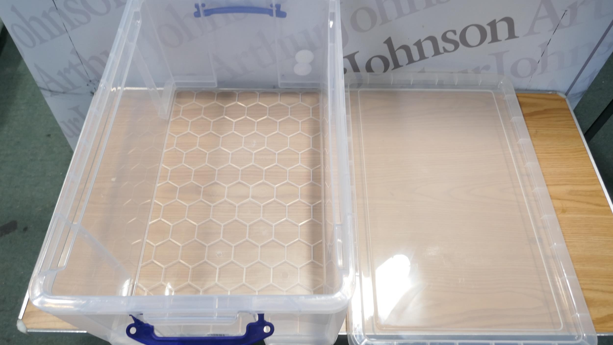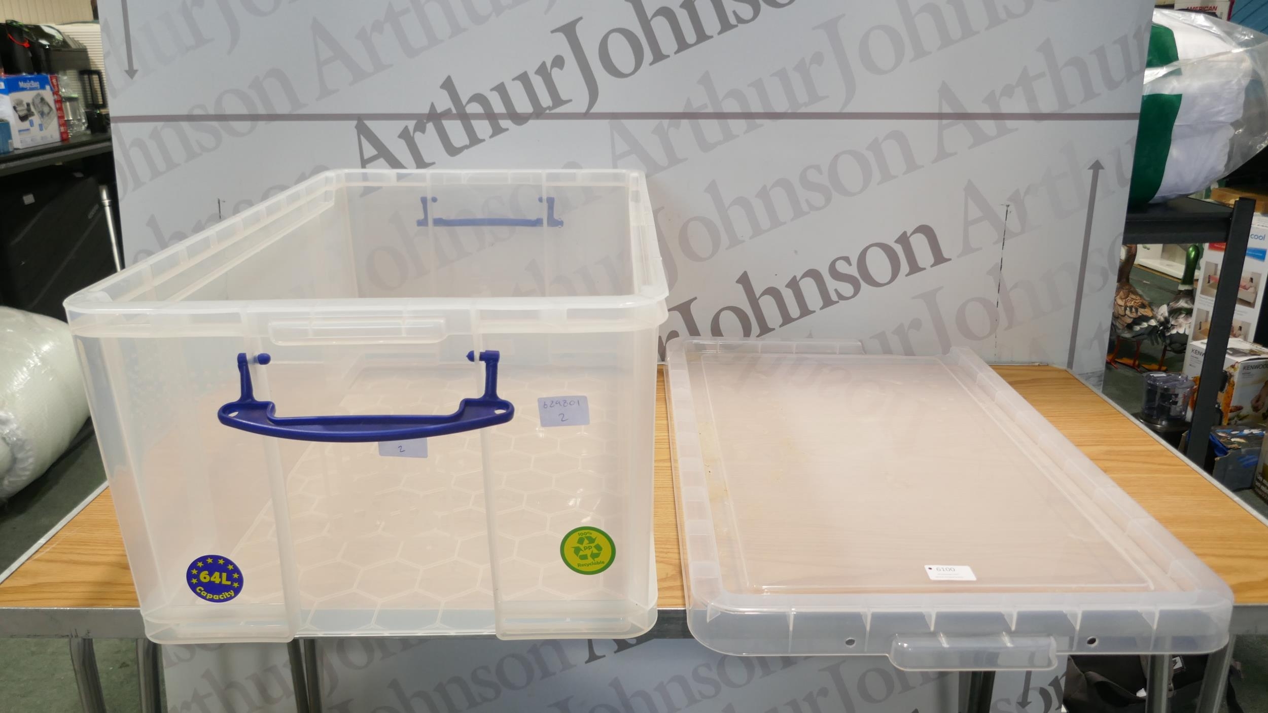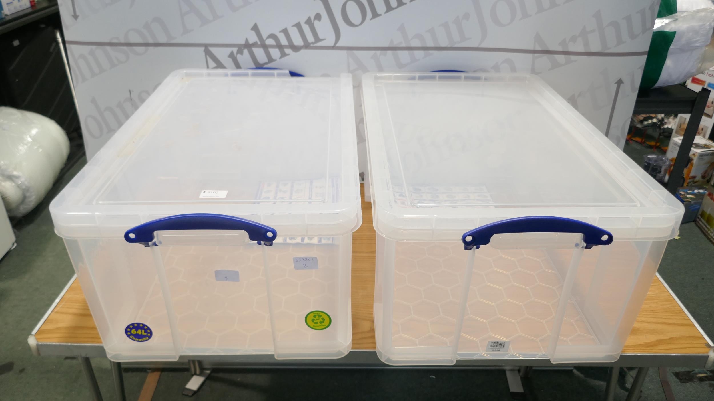 Two Really Useful 64 litre storage boxes with lids (damaged lid)