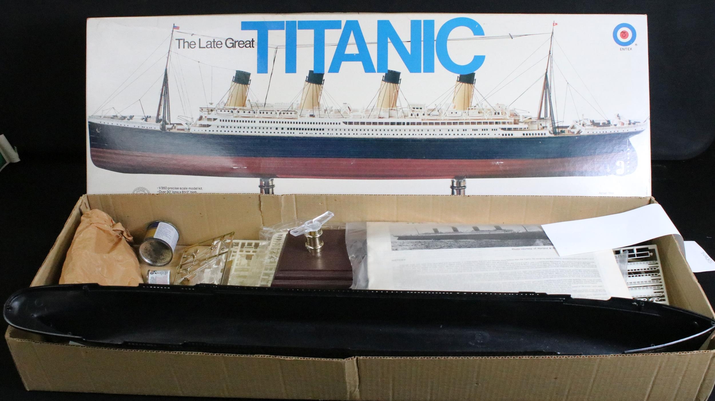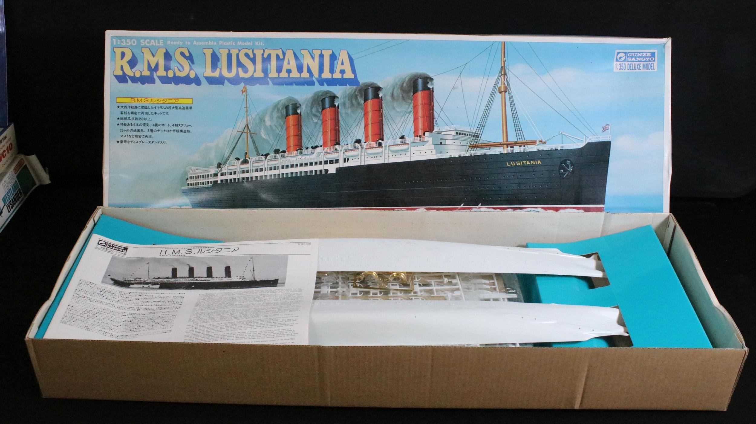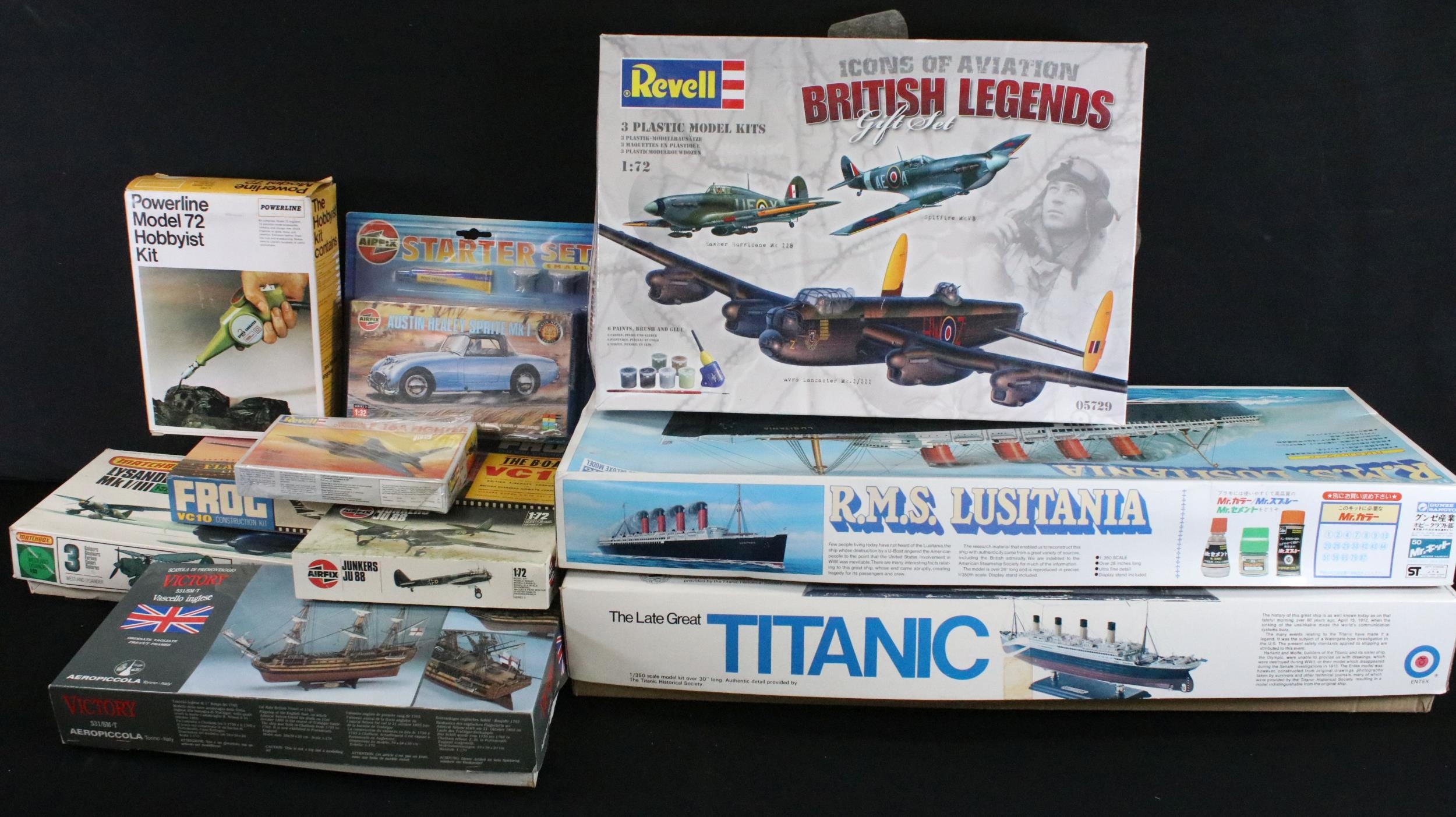 Ten boxed plastic model kits to include Titanic Historical Society The Late Great Titanic, 1/350 Gunze Sangyo RMS Lusitania, 1/72 Revell Icons Of Aviation British Legends Gift Set, Revell 1/144 General Dynamics F-16A Fighter, 1/144 Frog The BOAC Vickers Super VC10, etc, all appearing complete and ex, boxes vg
