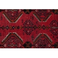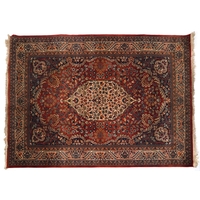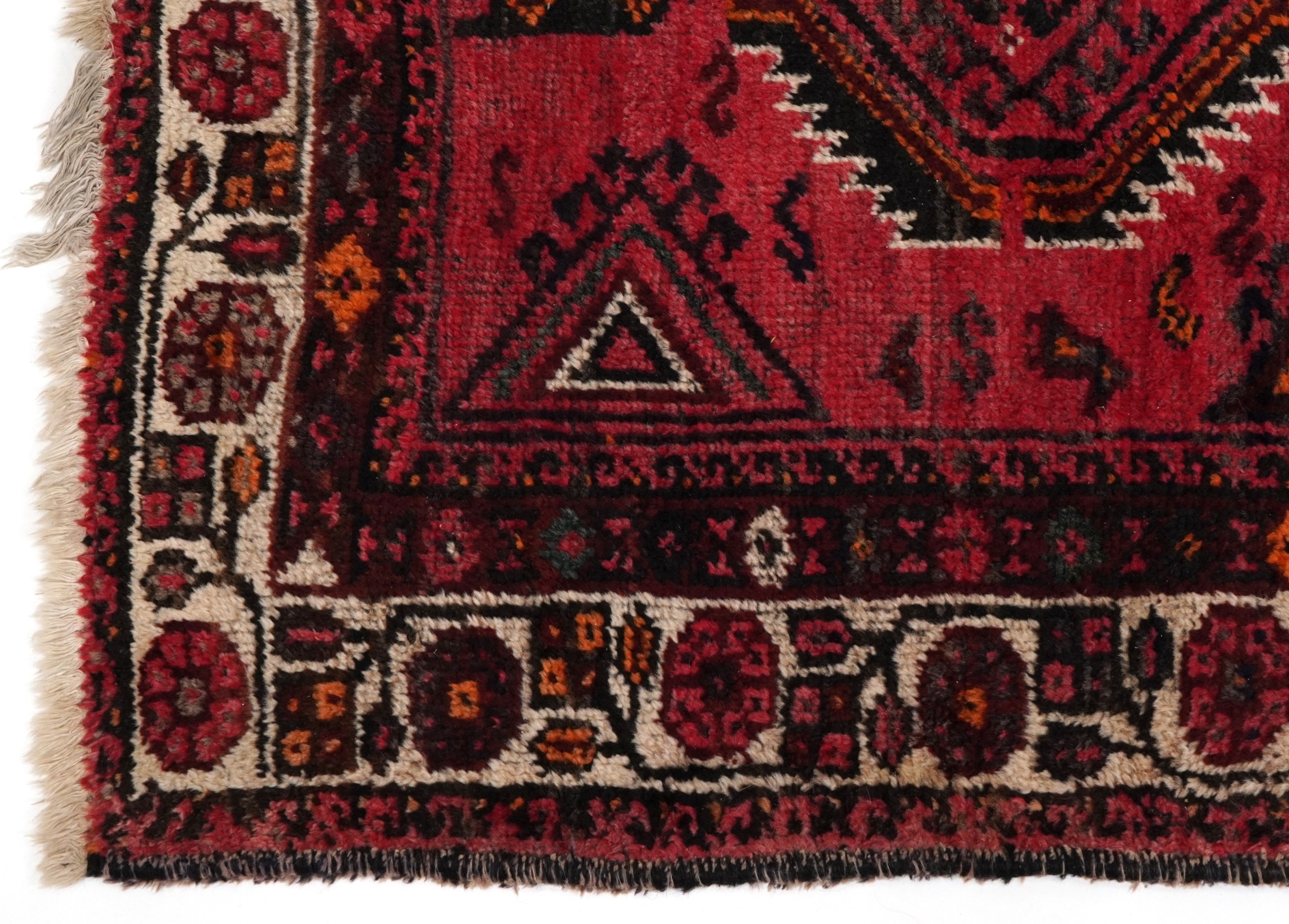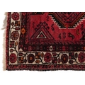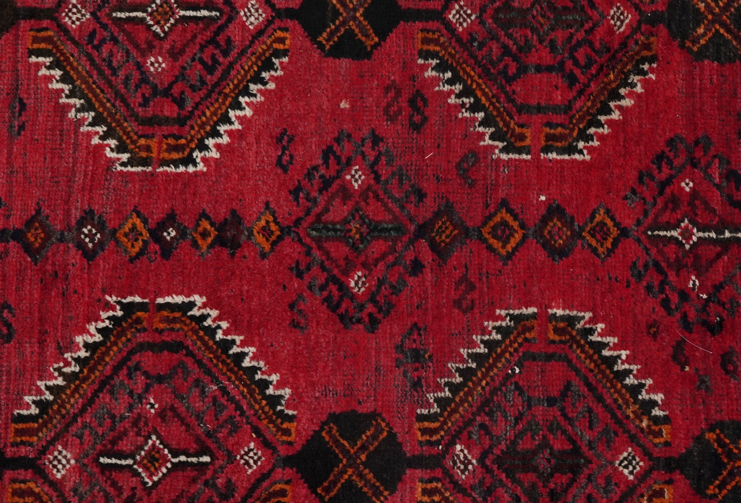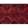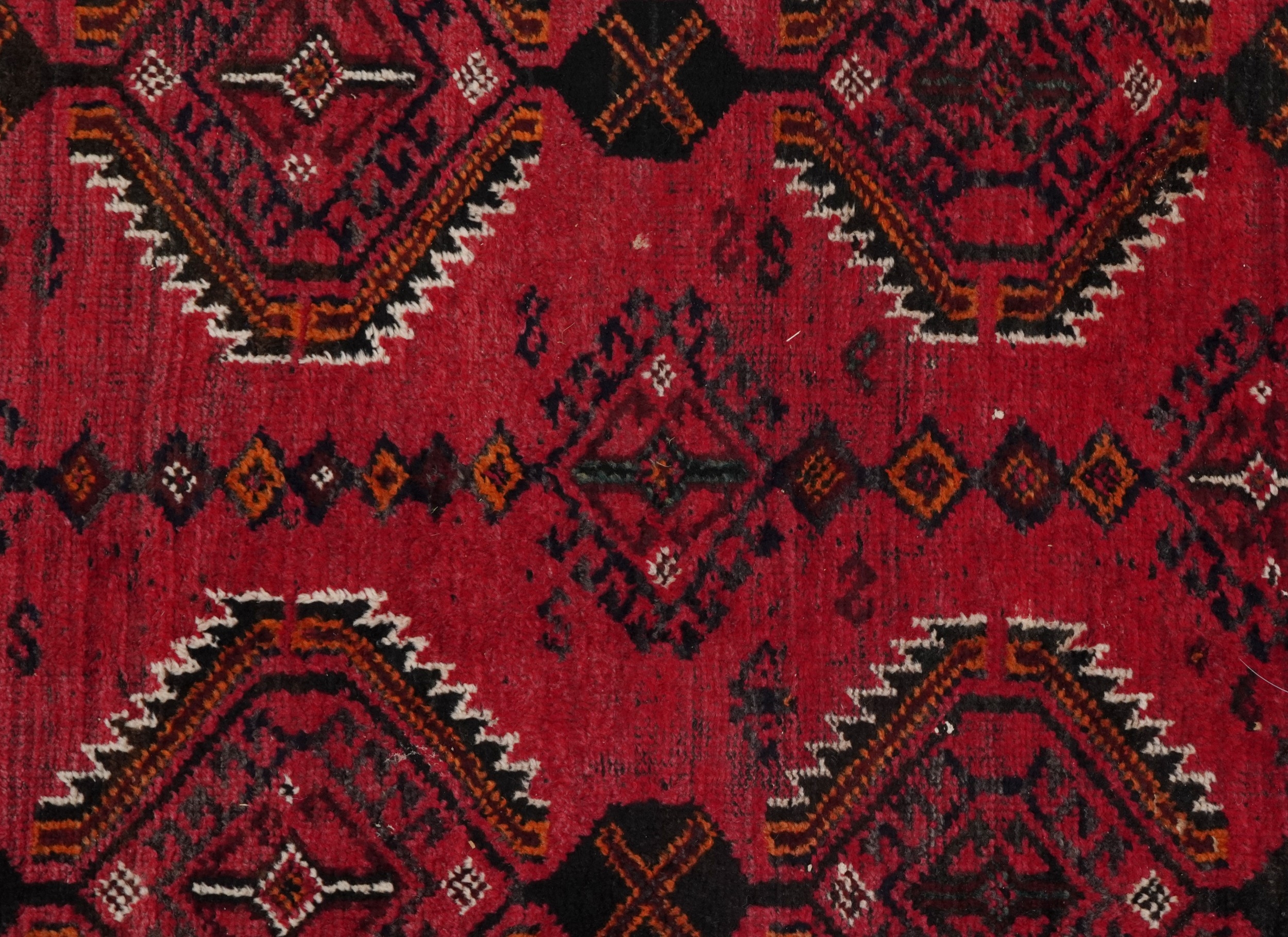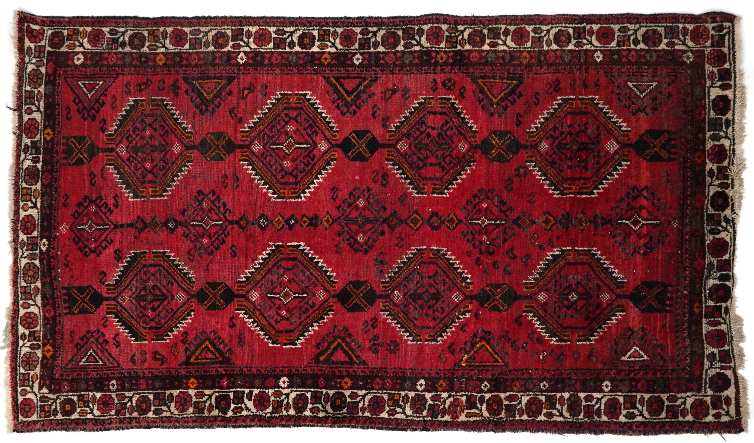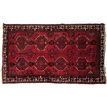 An Afghan rug, 20th century, the red field with two rows of stylized medallions within a complementary border, 257cm x 165cm.