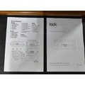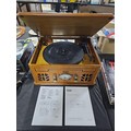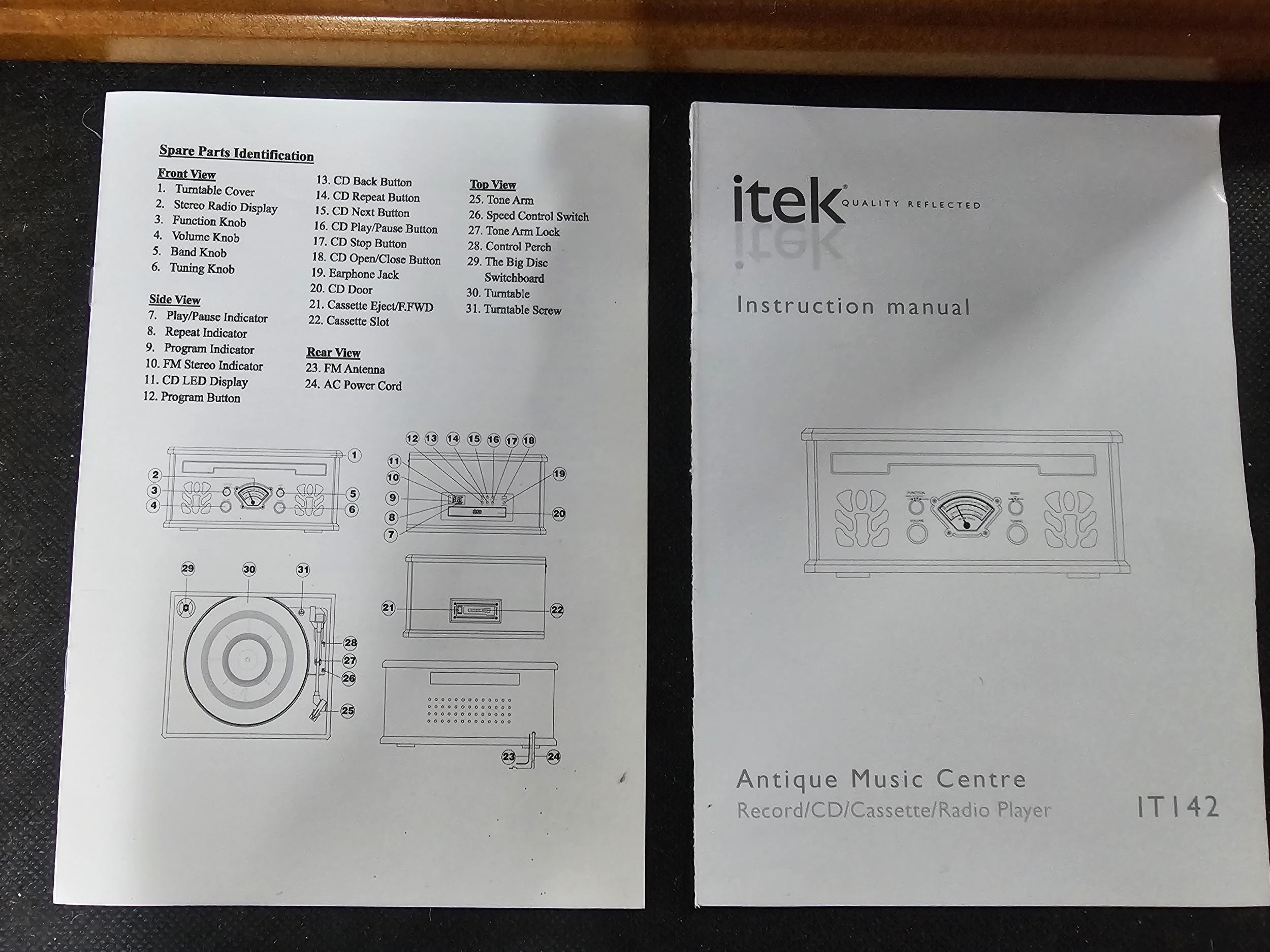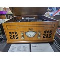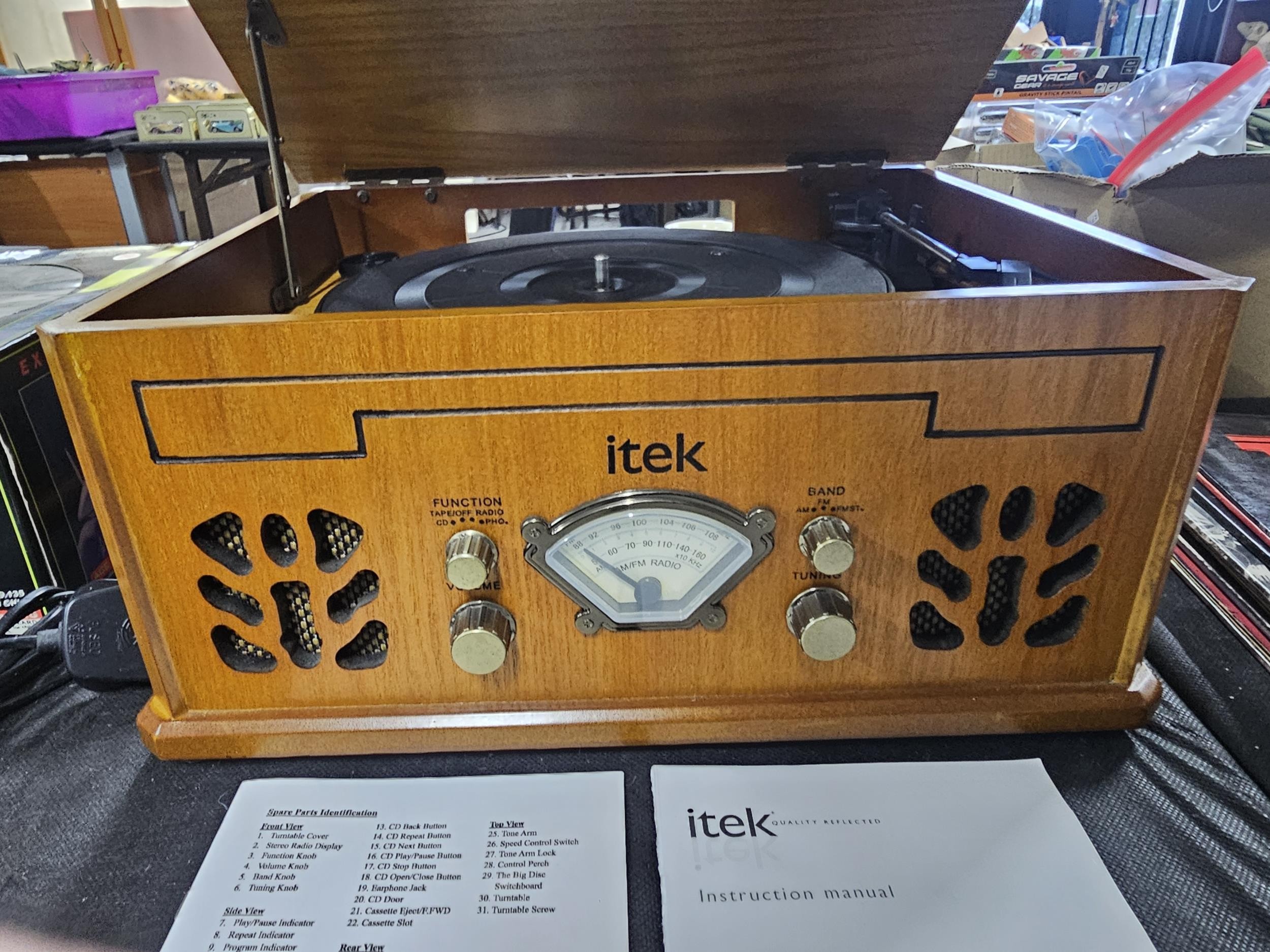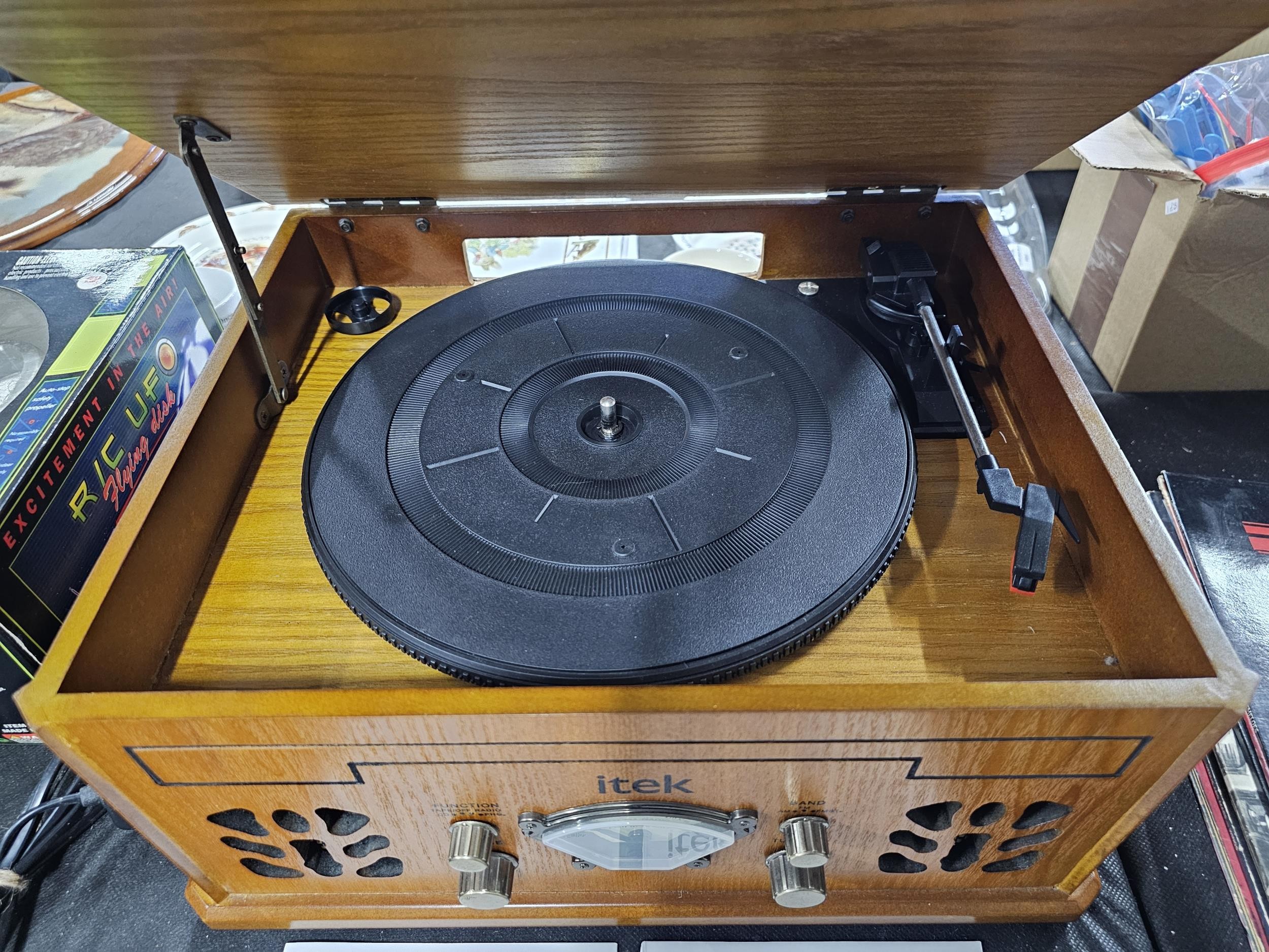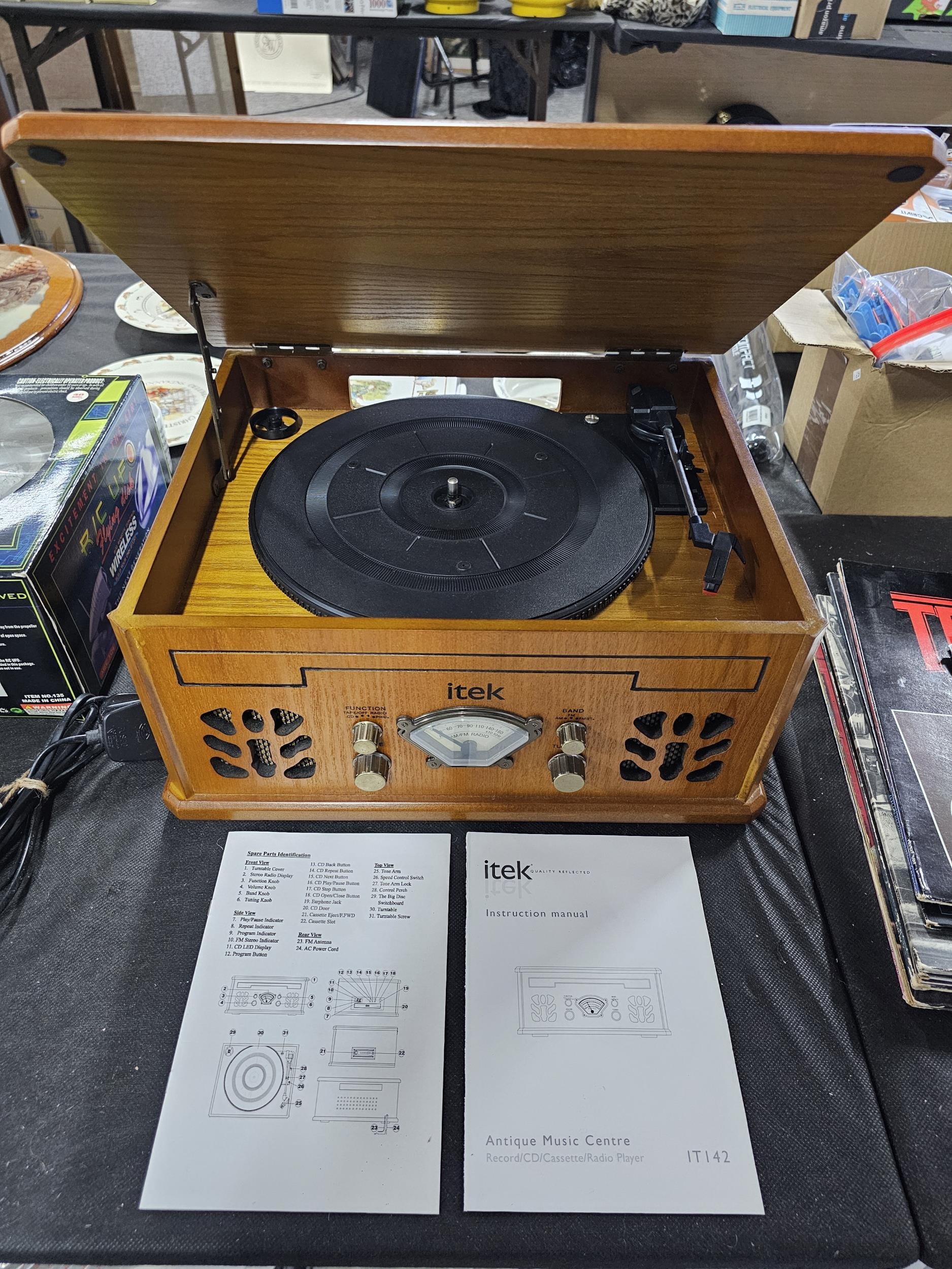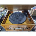 A modern retro style Itek record player with built in radio CD and cassette player, in working order set in a wooden effect case