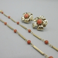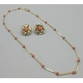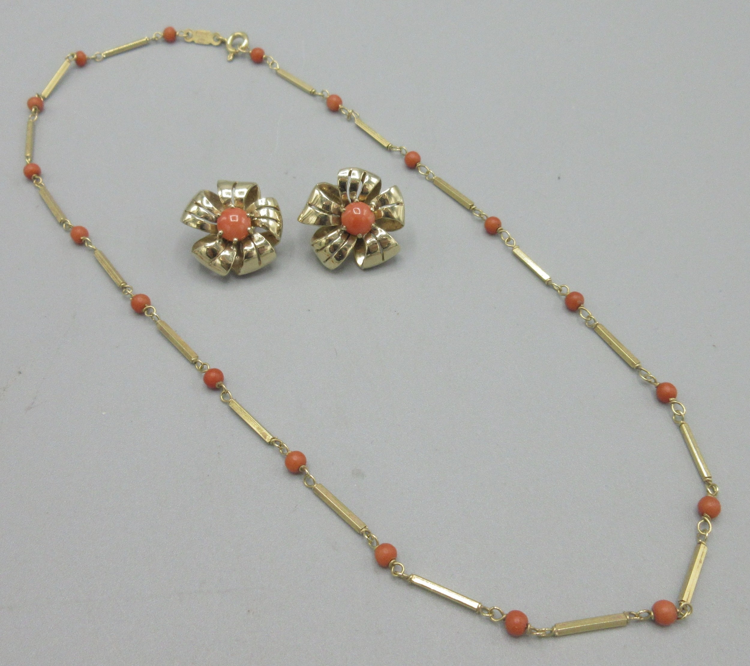 18ct yellow gold bar and coral bead necklace, stamped 750, L40cm, 5.8g, and a pair of 9ct yellow gold flower clip on earrings set with coral, stamped 375, W18mm, 8.5g