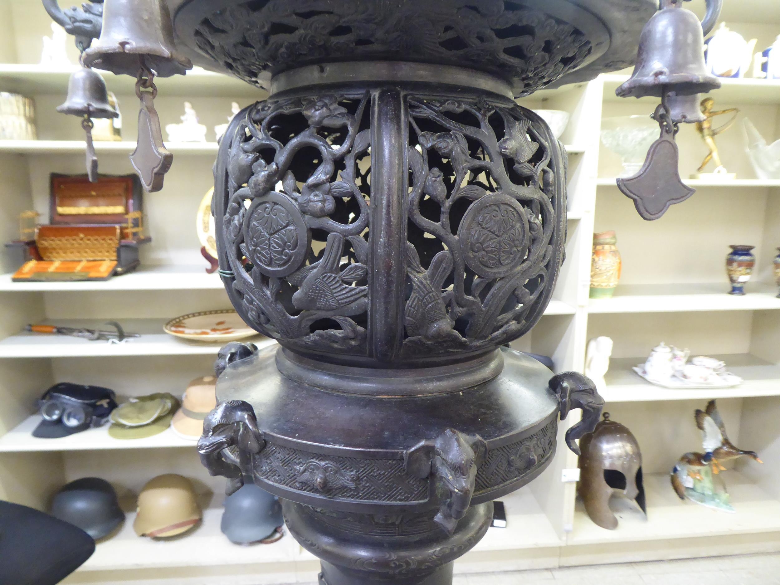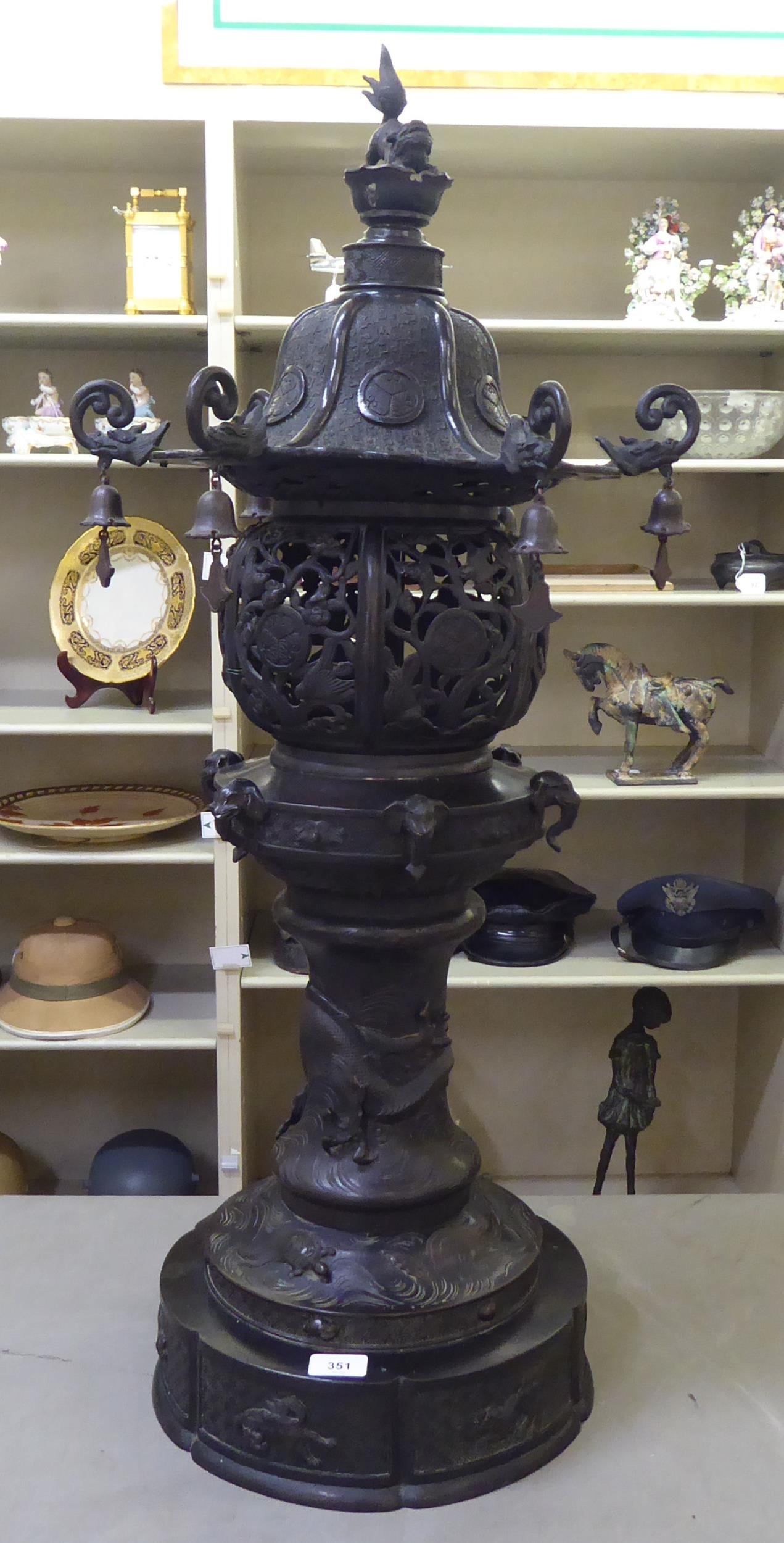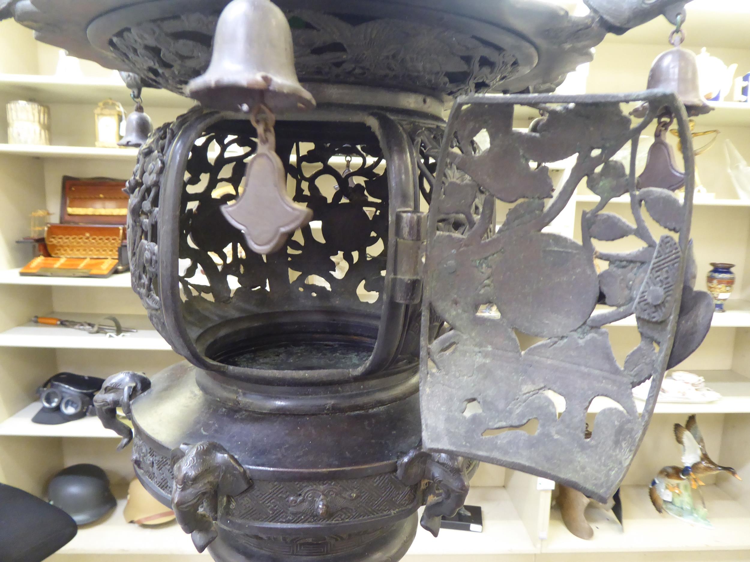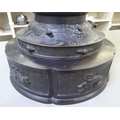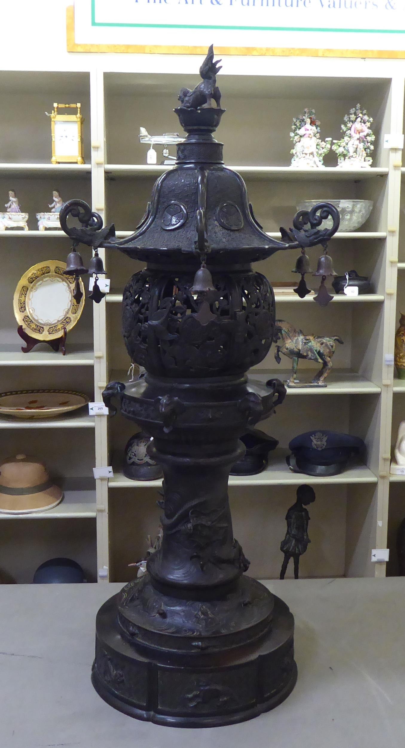 A Japanese bronze finished, metal temple censer with a pagoda top, over a pierced bowl, on a pedestal base, decorated with dragons 34"h