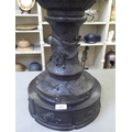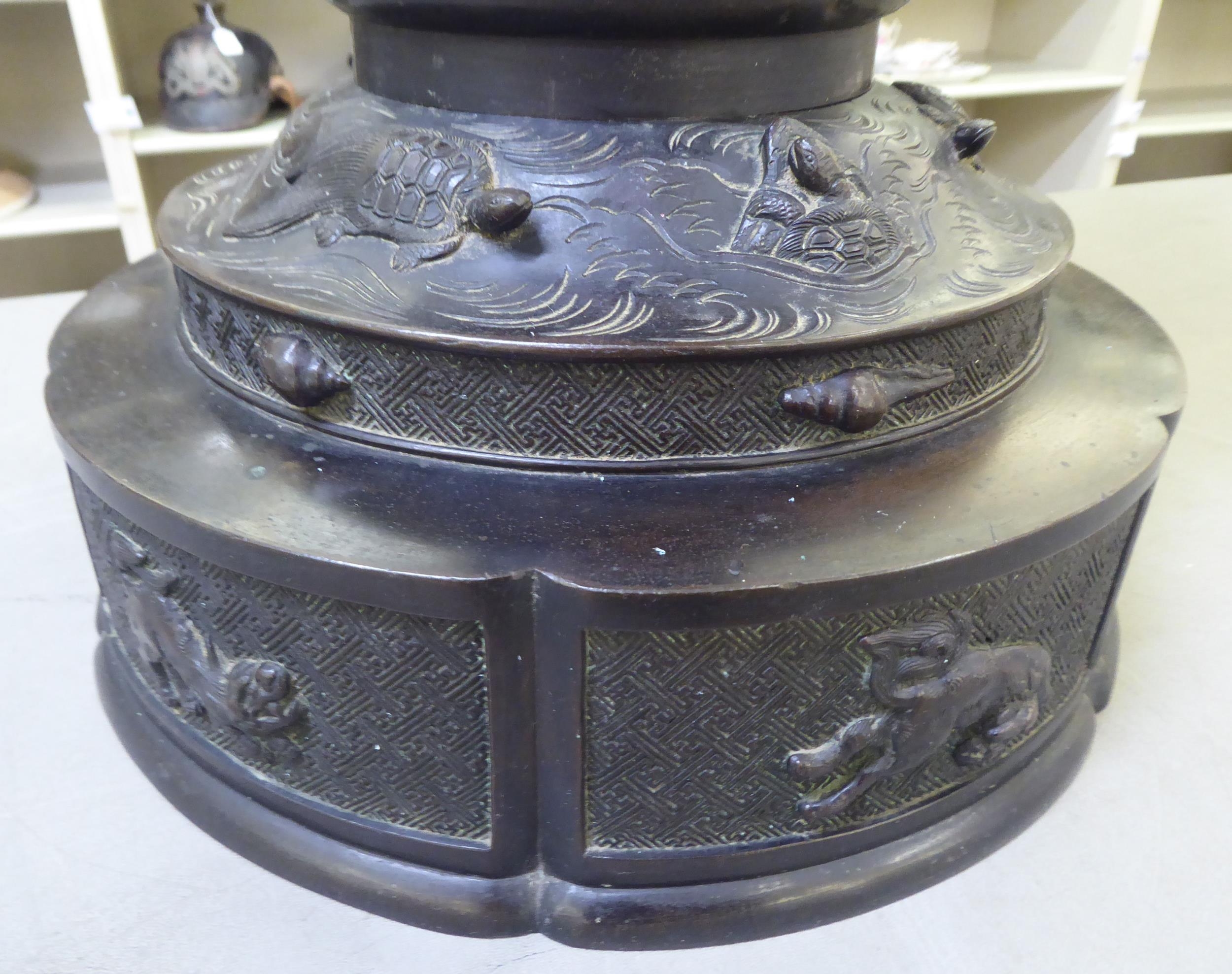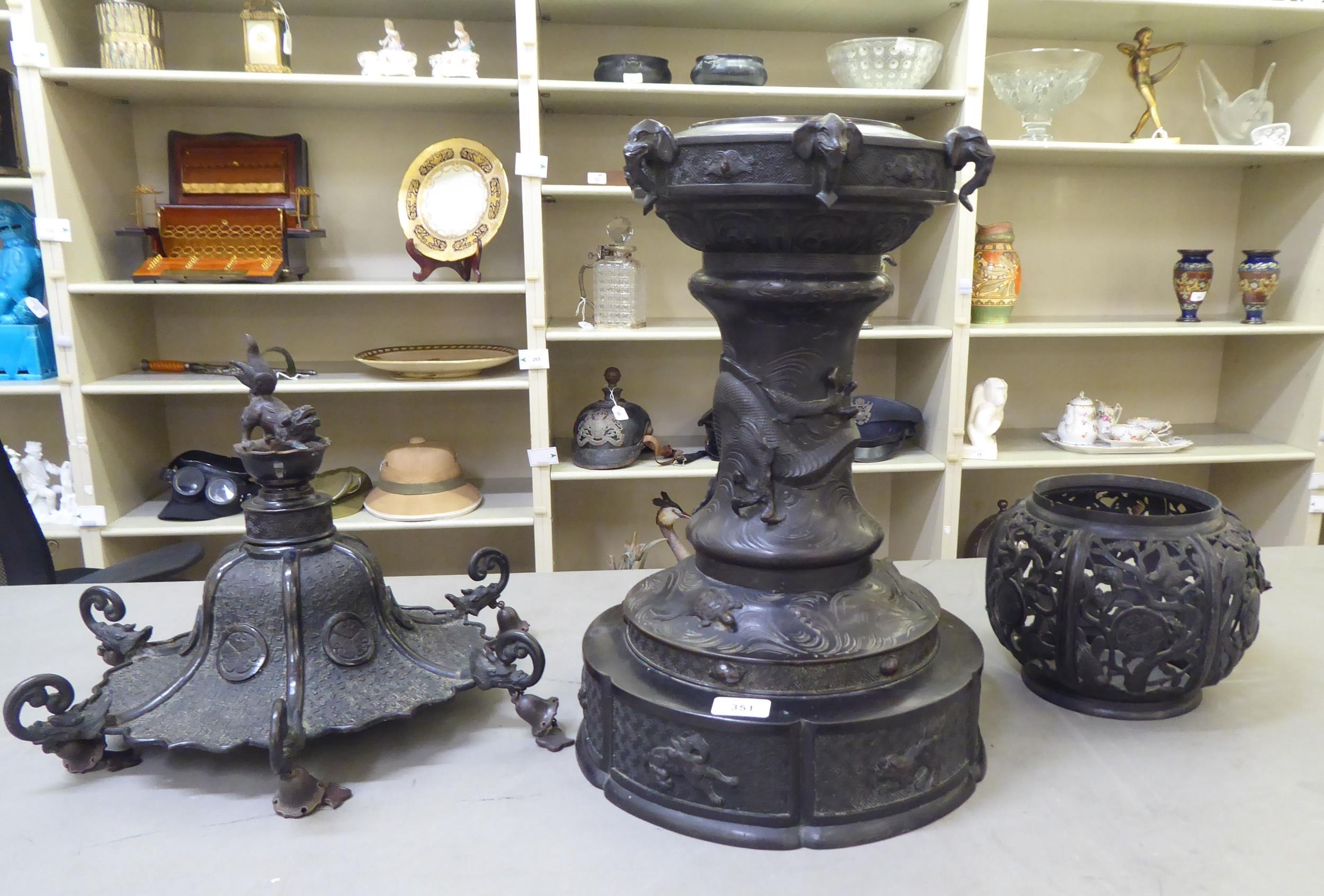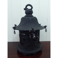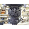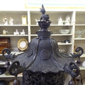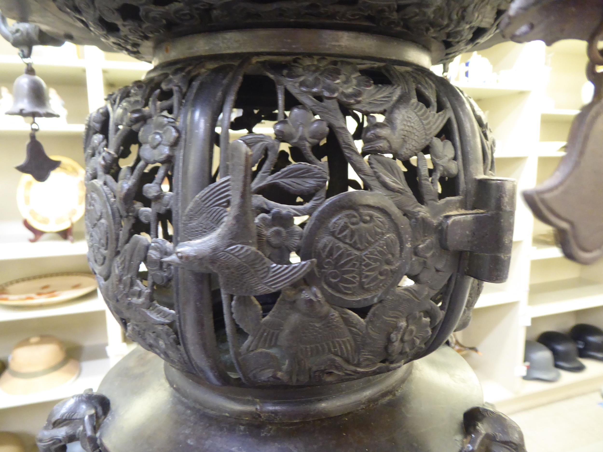 A Japanese bronze finished, metal temple censer with a pagoda top, over a pierced bowl, on a pedestal base, decorated with dragons 34"h
