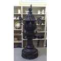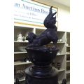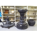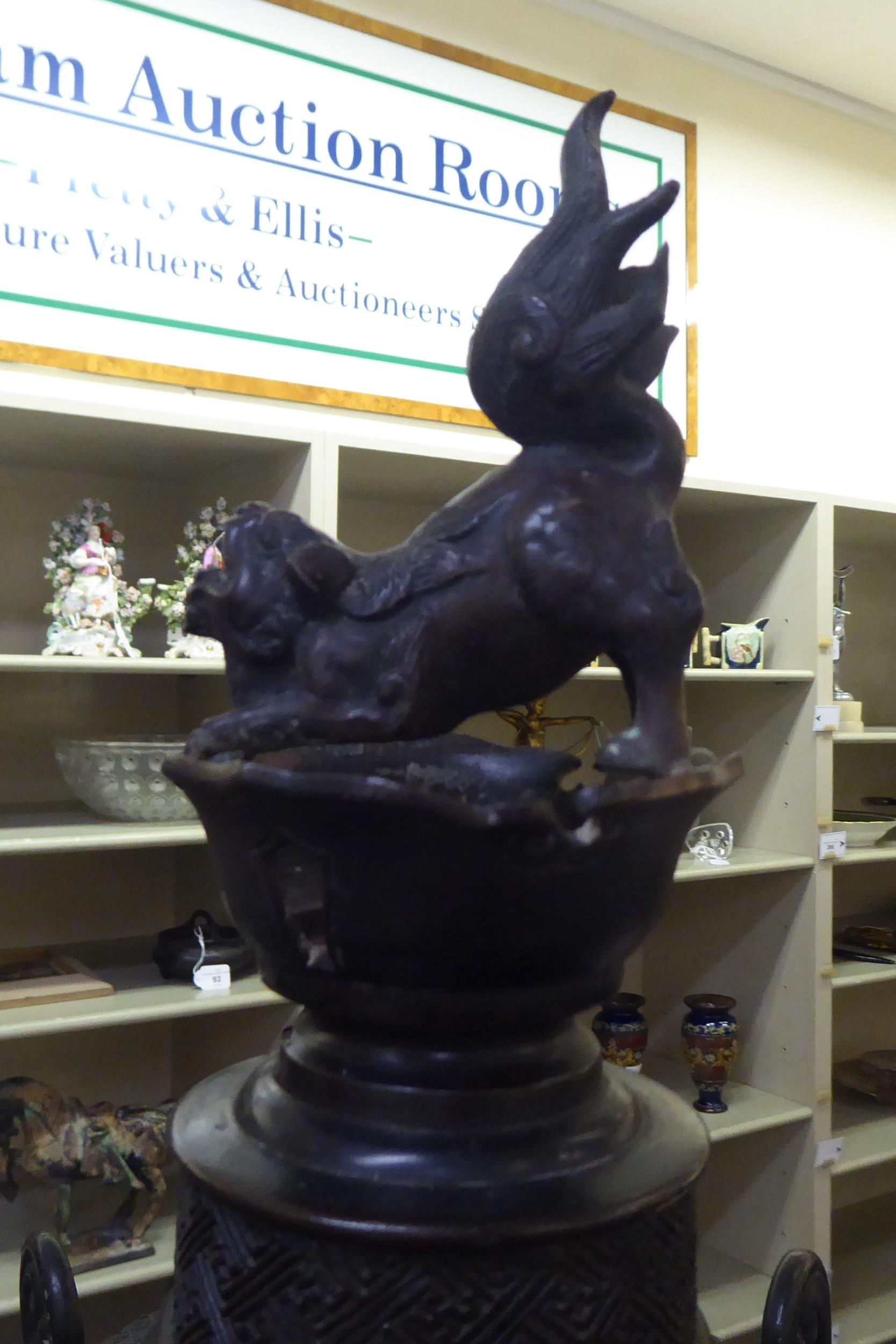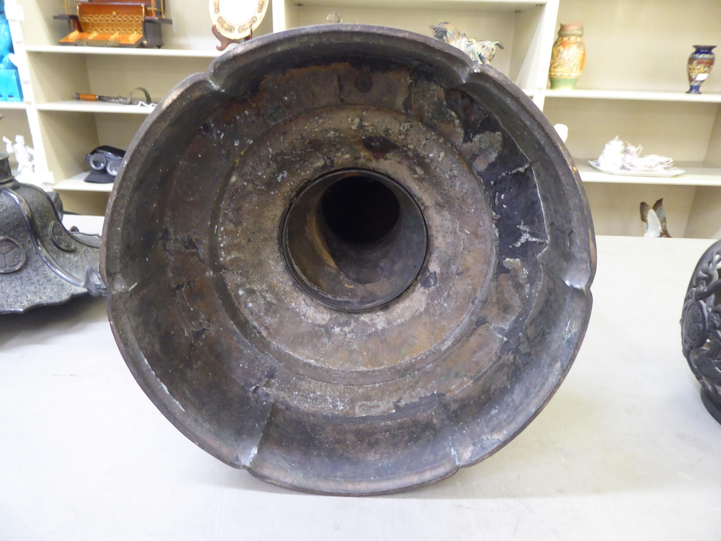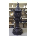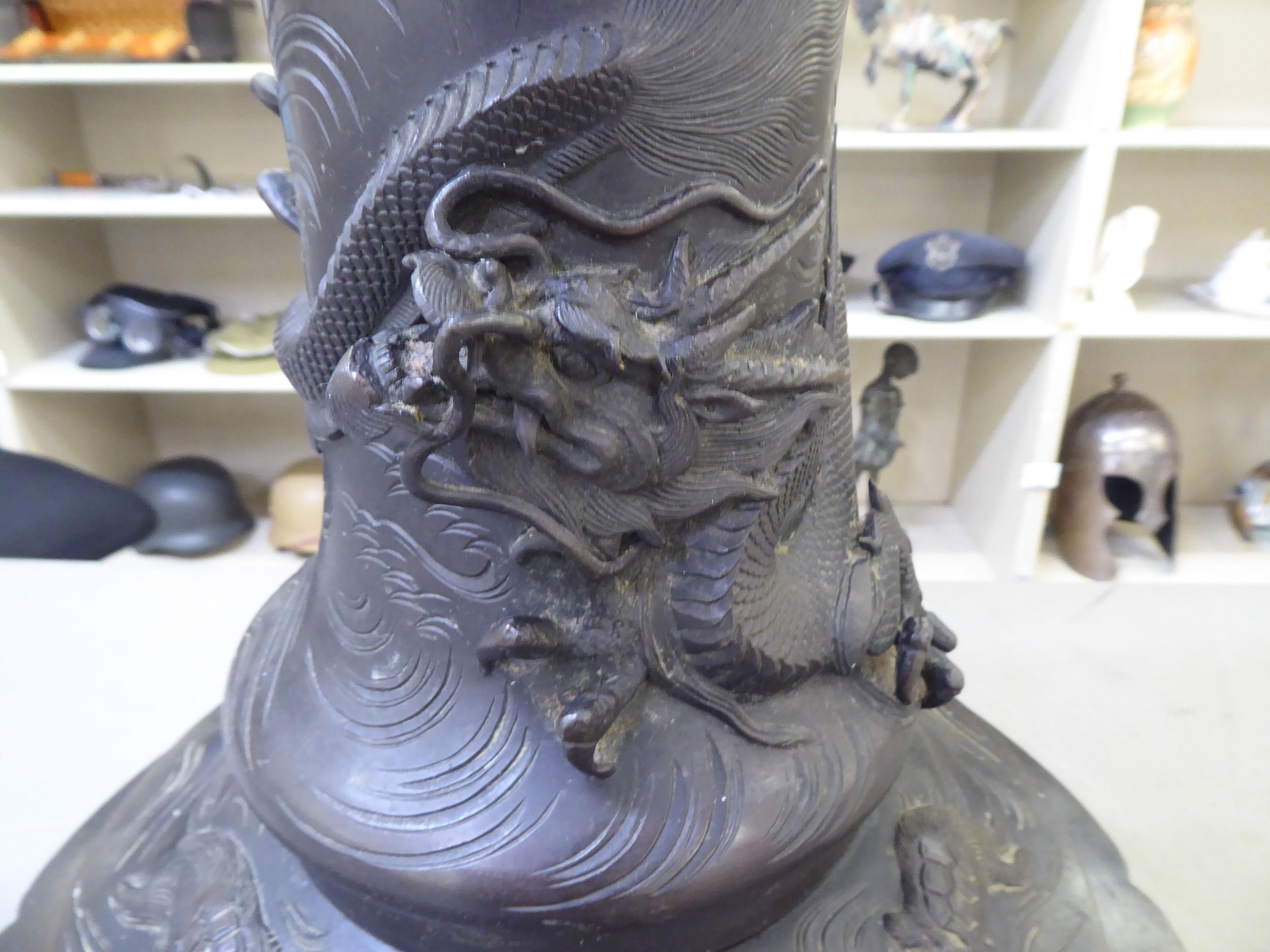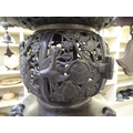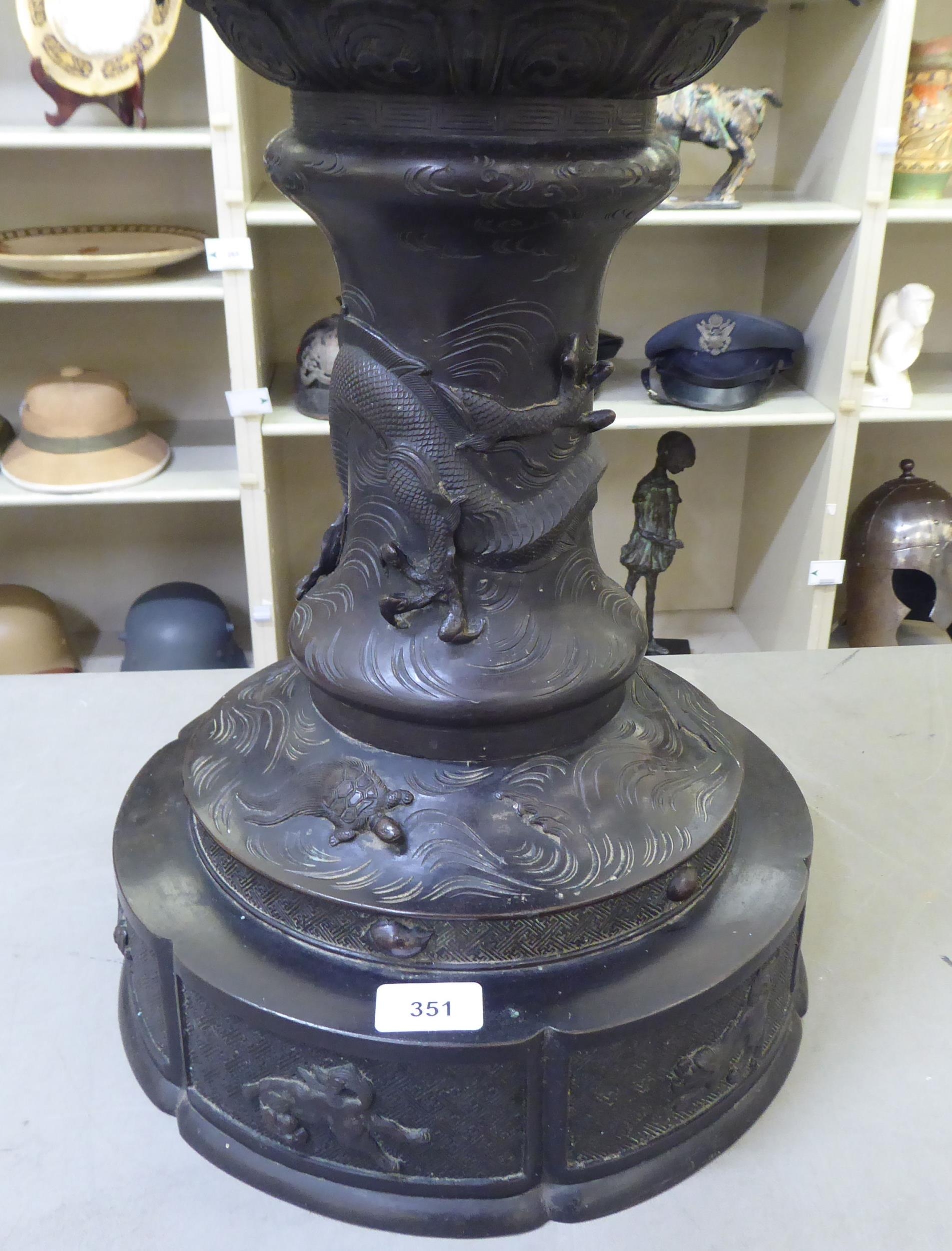 A Japanese bronze finished, metal temple censer with a pagoda top, over a pierced bowl, on a pedestal base, decorated with dragons 34"h