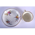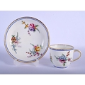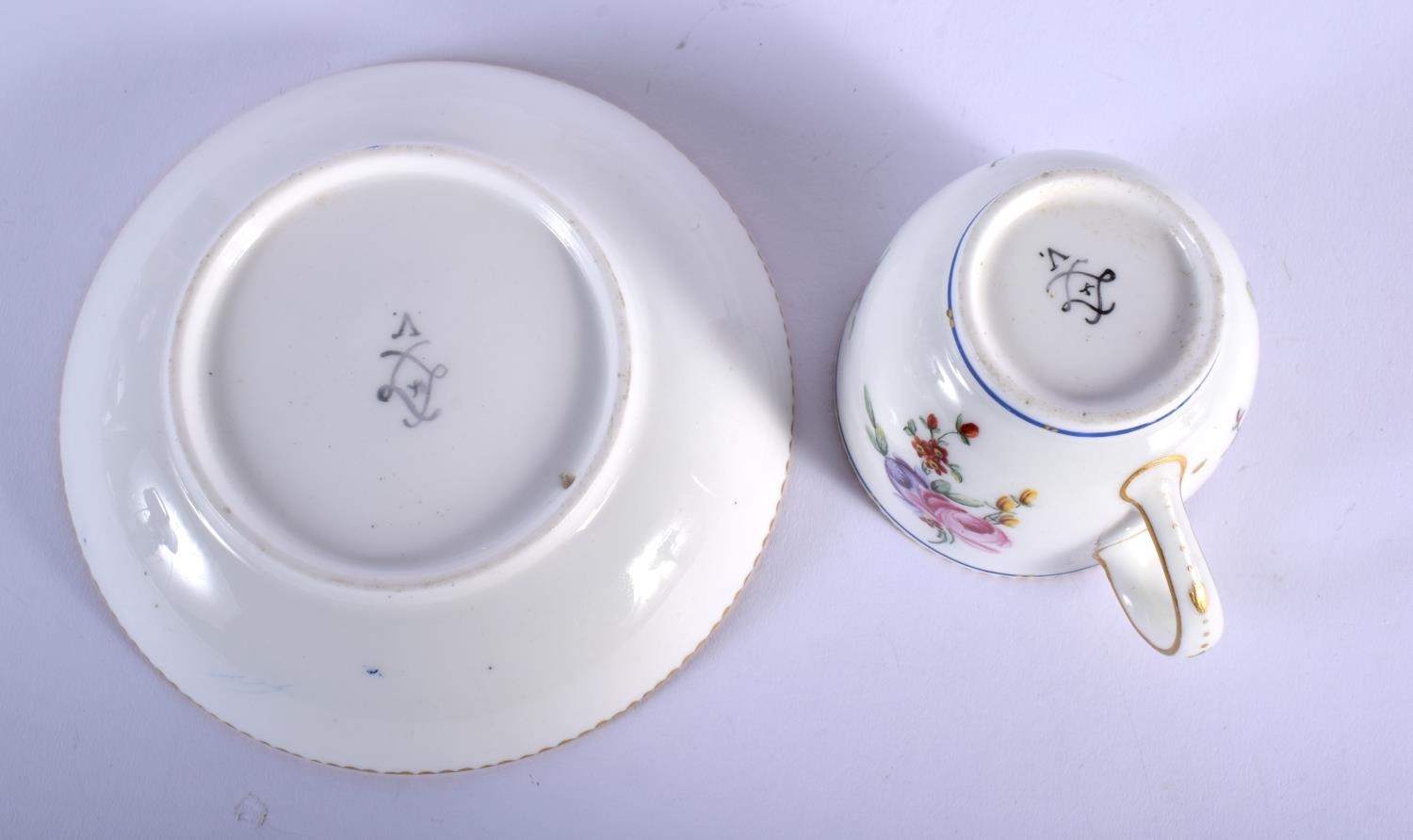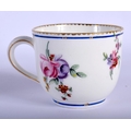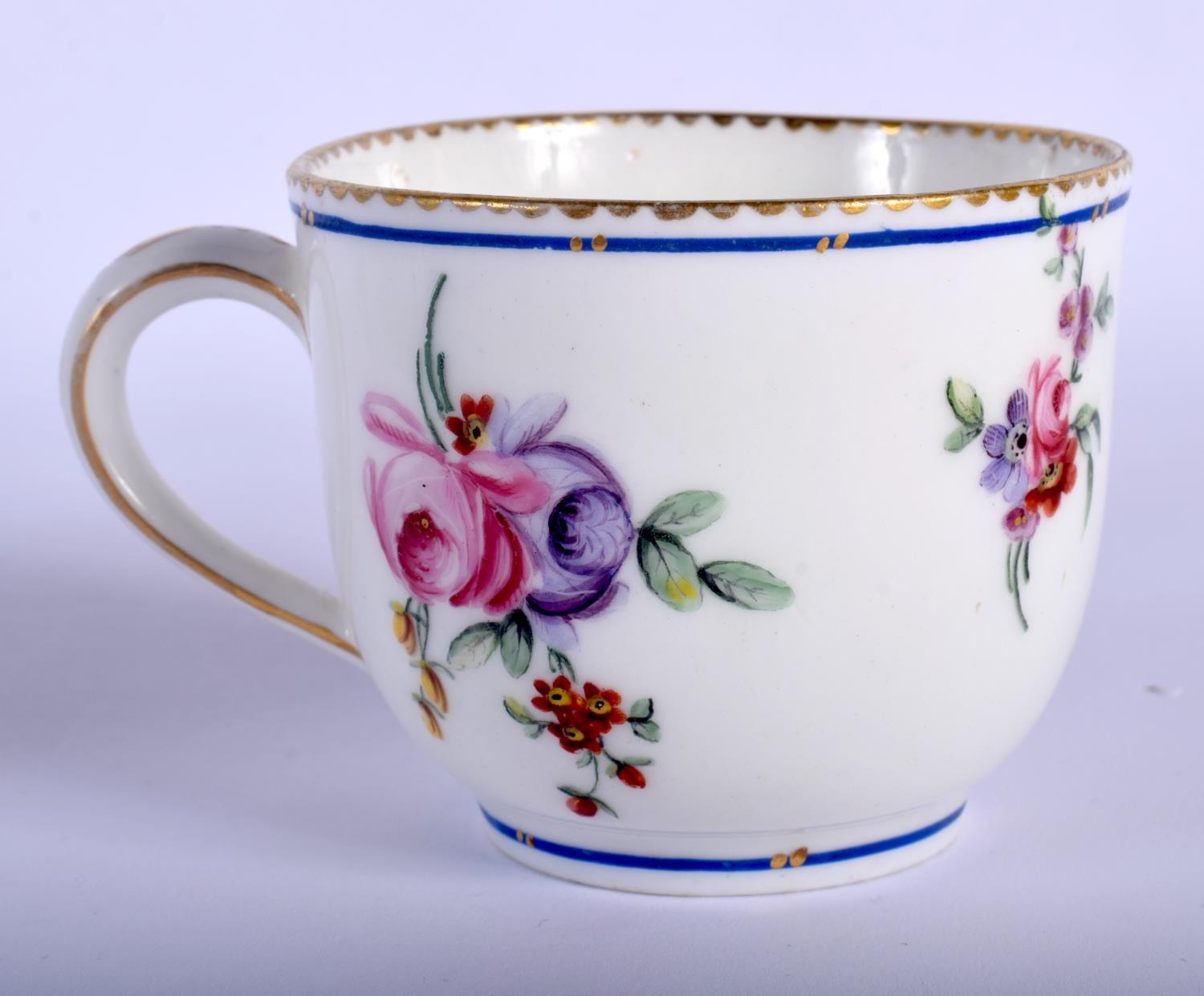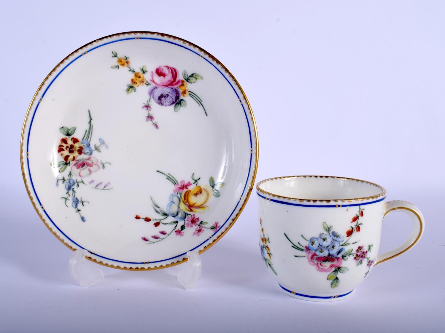 18TH C. SEVRES GOOD COFFEEE CUP AND SAUCER BOLDLLEY PAINTED WITH FLOWERS UNDER A BLUE LINE DENTIL GILT BORDER. Cup 6cm high, Saucer 14cm diameter (2)
