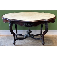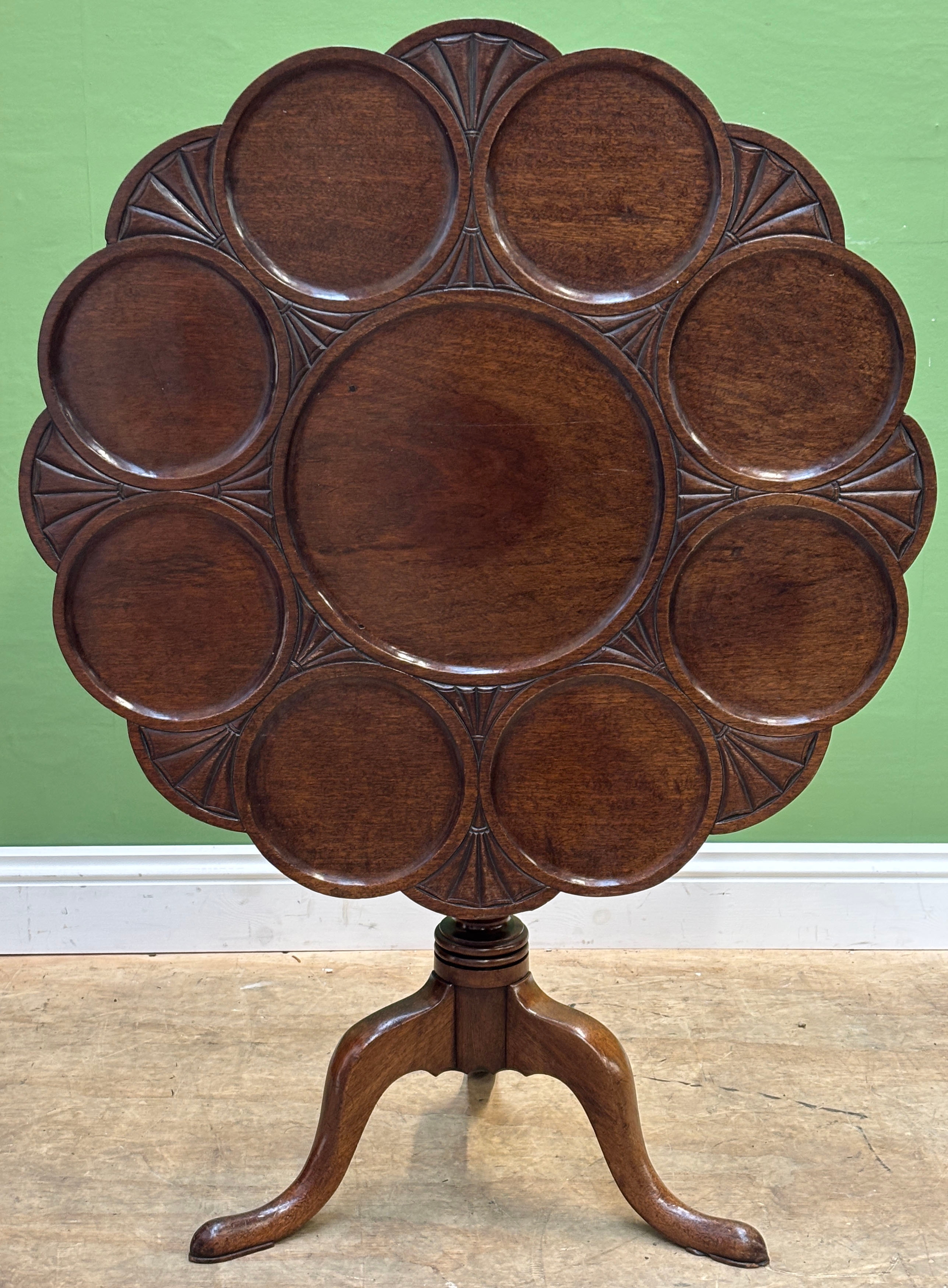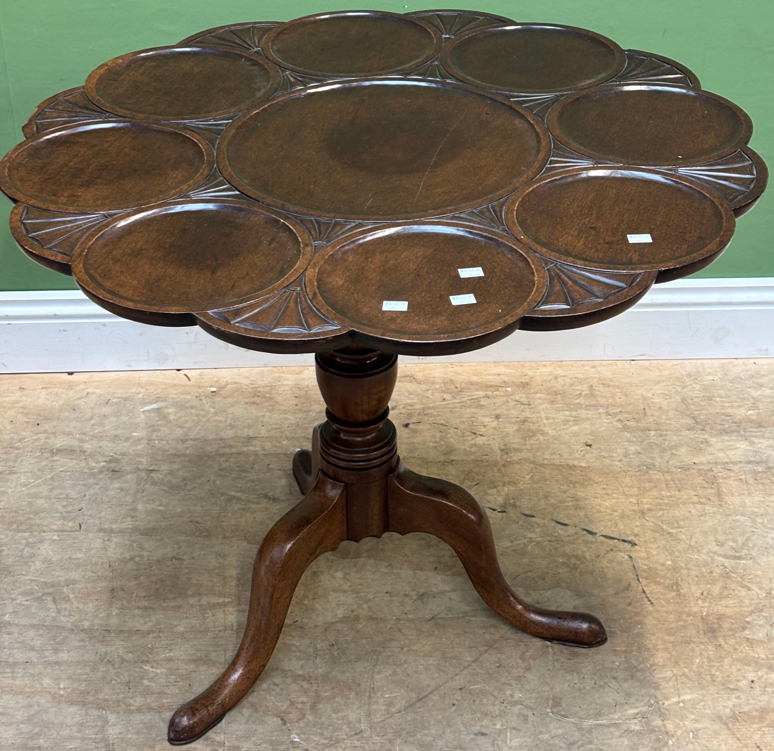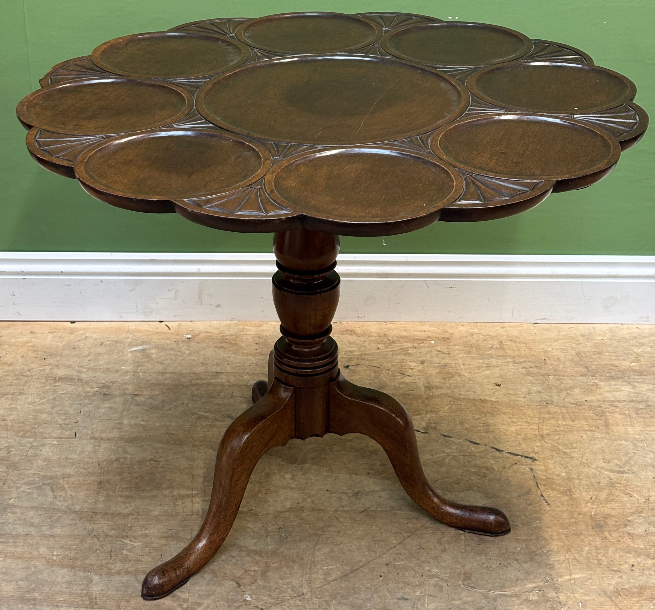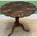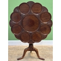 A mahogany tilt-top table with scalloped top in 18th century taste, early 20th century, on turned column and tripod cabriole legs, 89cmD
