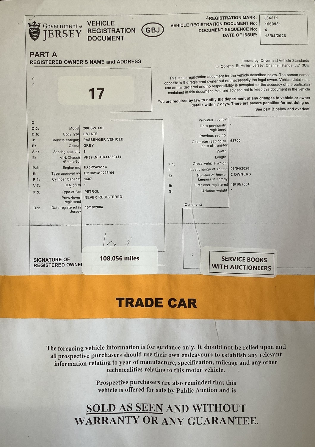 A 2004 Peugeot 206 SW 1.6 XSi estate J84511 (petrol/automatic), odometer reading 108,056 miles - Trade car