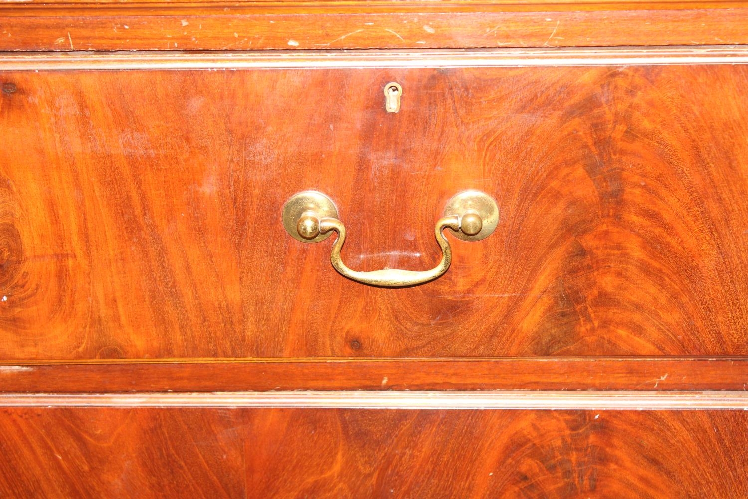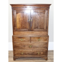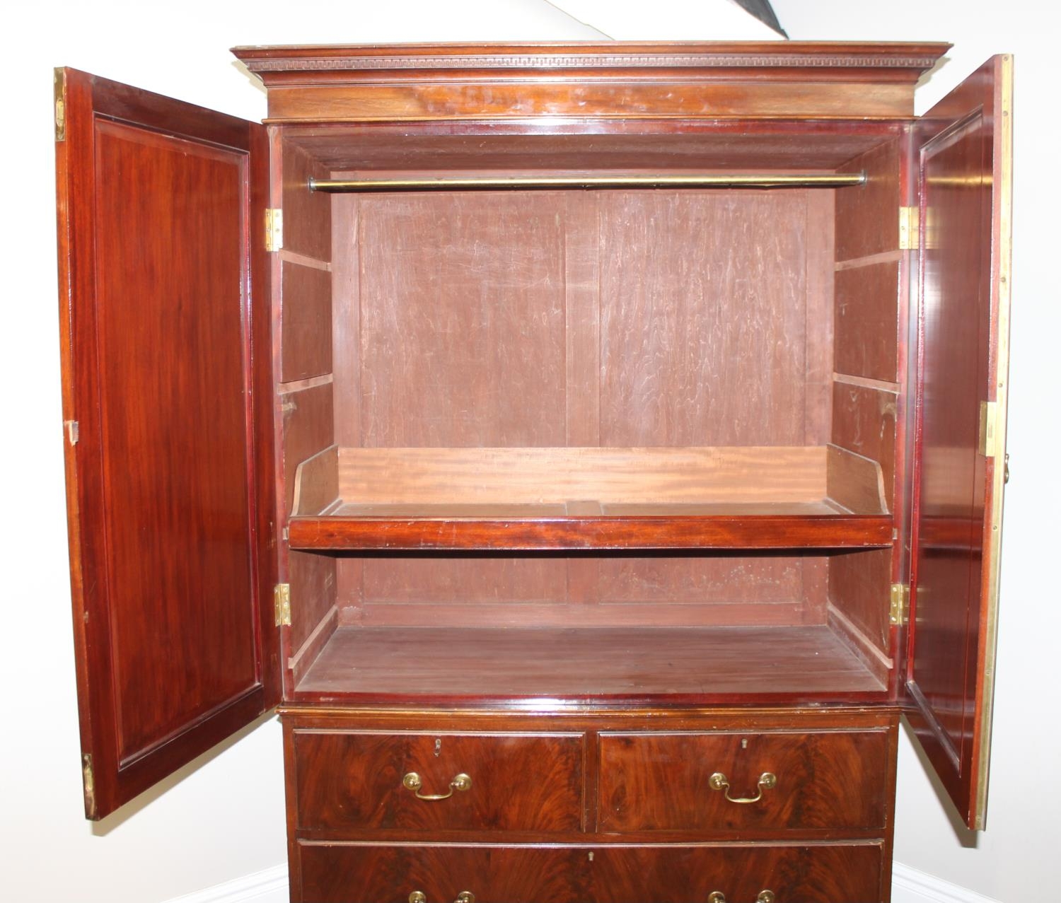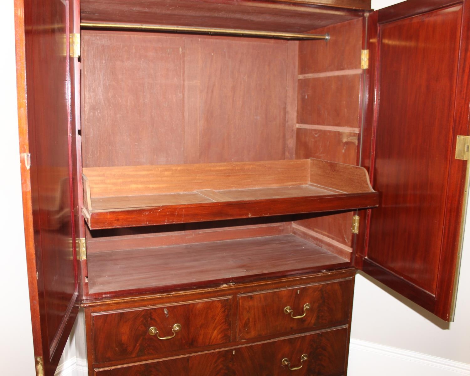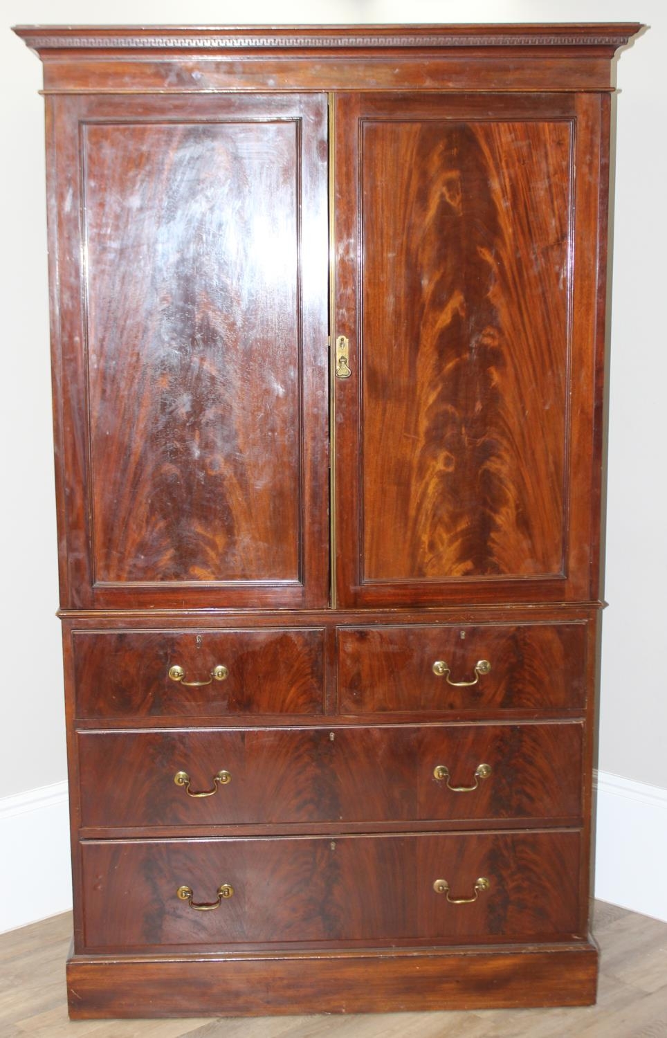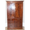 A 19th century mahogany linen press cabinet, 2 over 2 drawers to base and one slide and wardrobe pole in top cupboard, approx 129cm wide x 58cm deep x 222cm tall