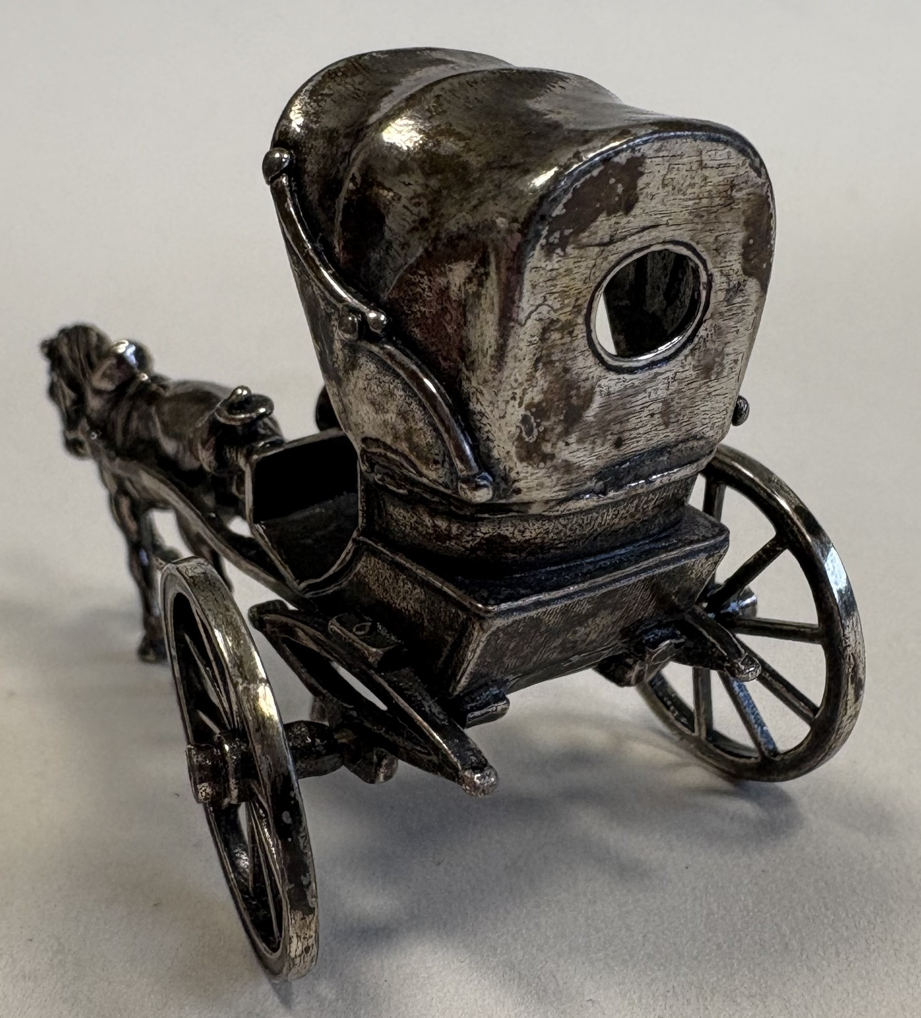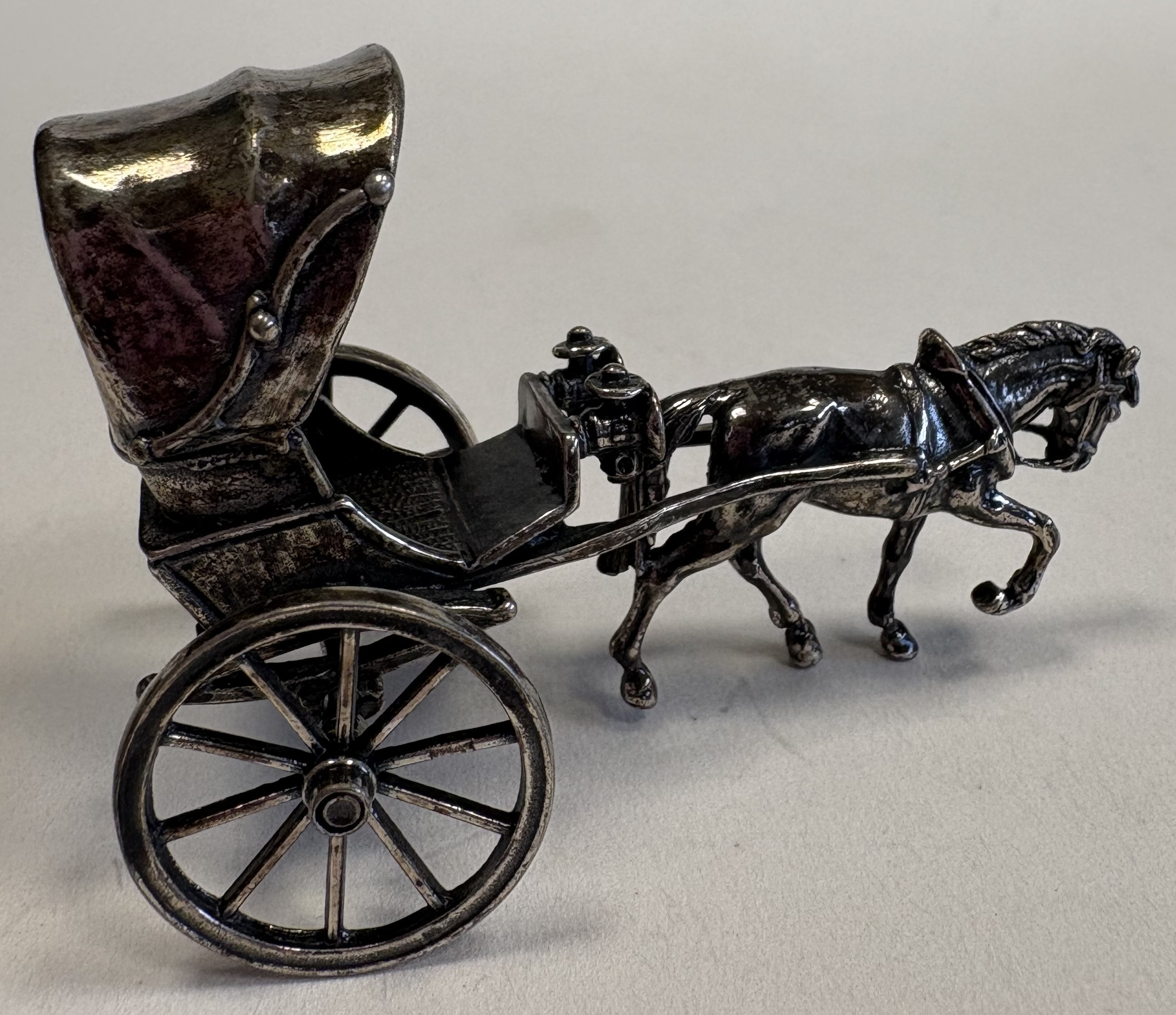 A miniature silver figure of a horse and carriage. Approx. 37 grams. Est. £50 - £80.