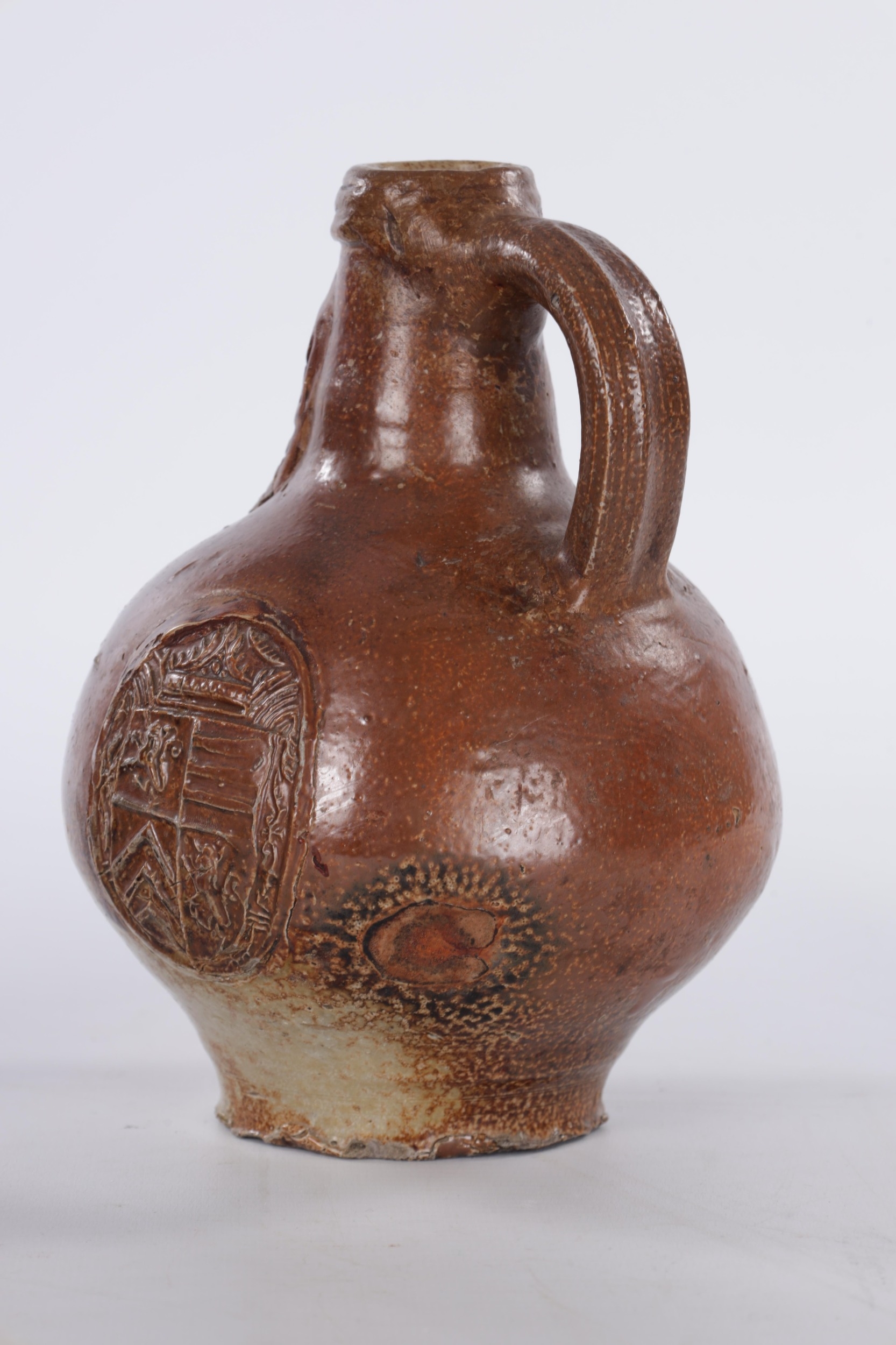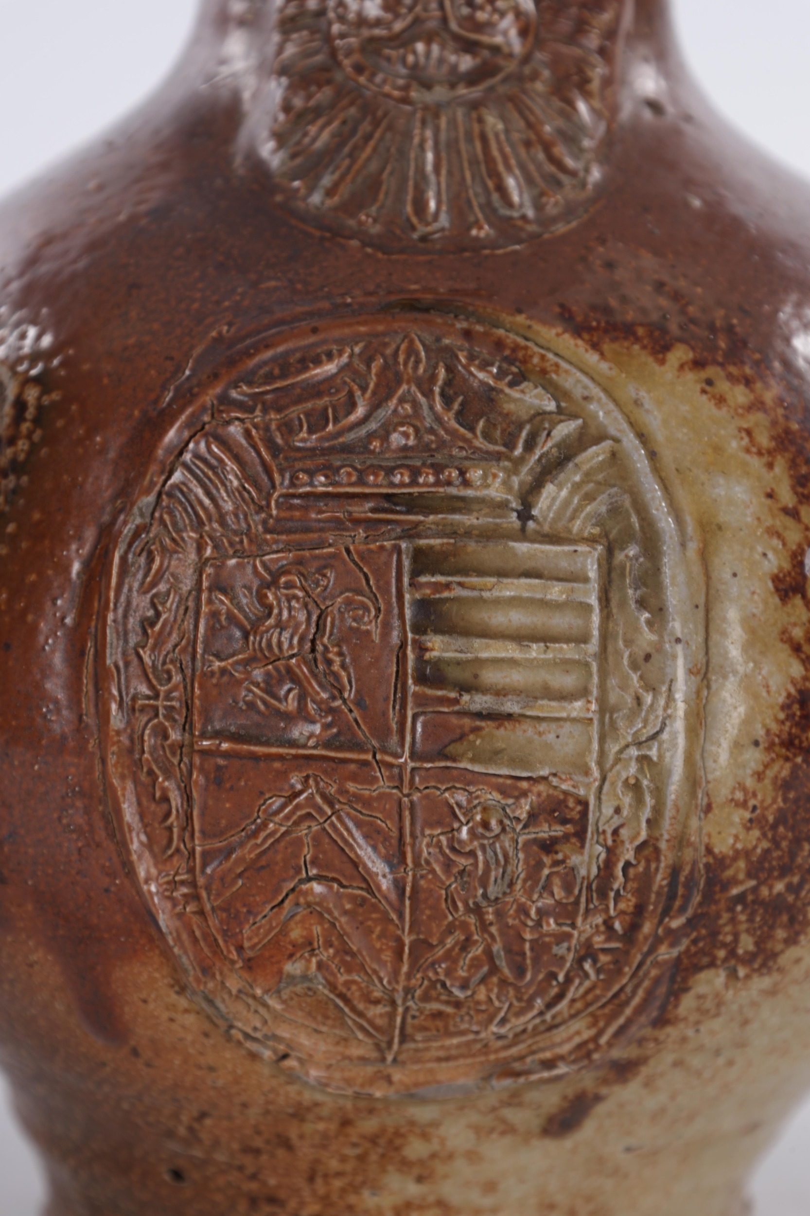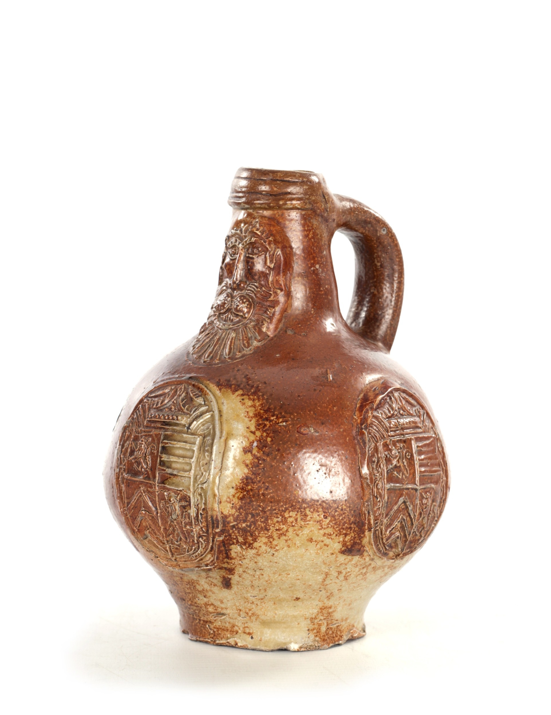 A 17TH CENTURY RHENISH BELLARMINE JUG WITH COAT OF ARMS of bulbous form with a narrow neck, applied bearded mask to the neck, coat of arms roundels to the body, in a mottled brown salt glaze. (19cm high)