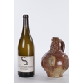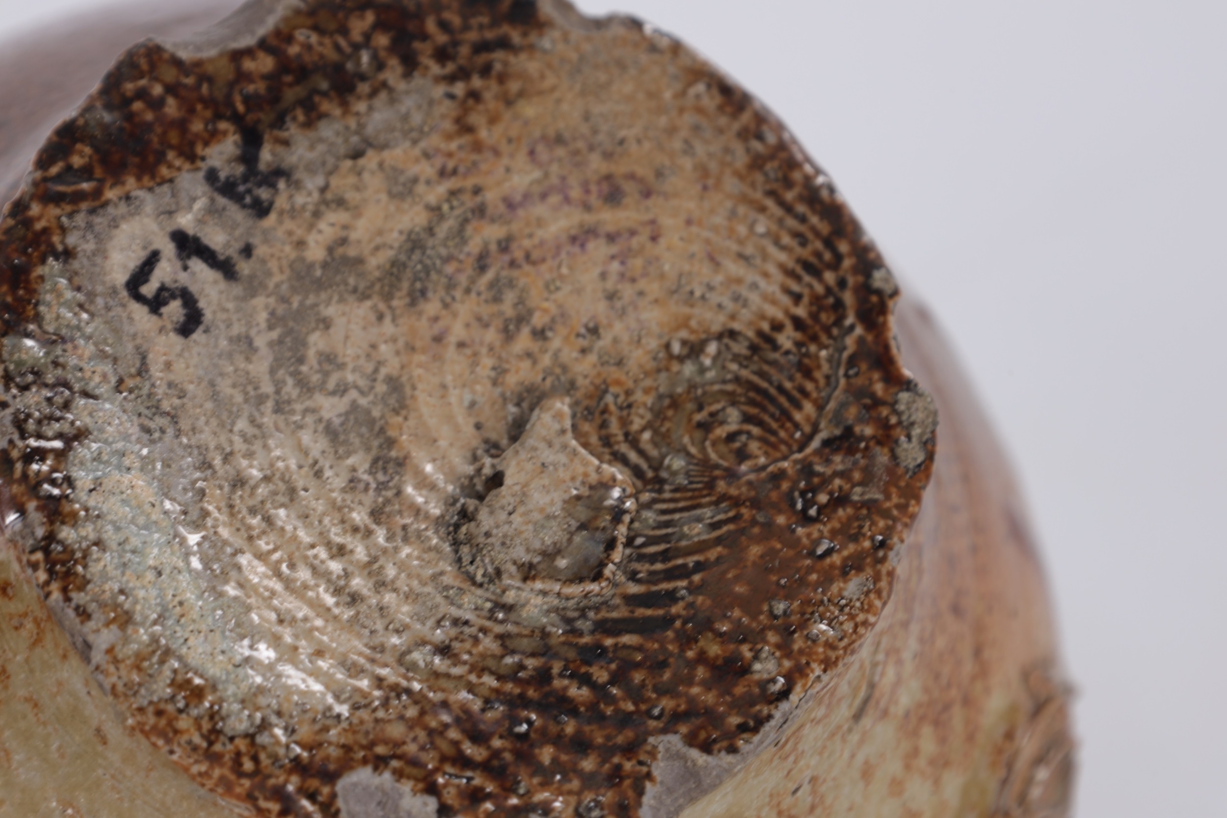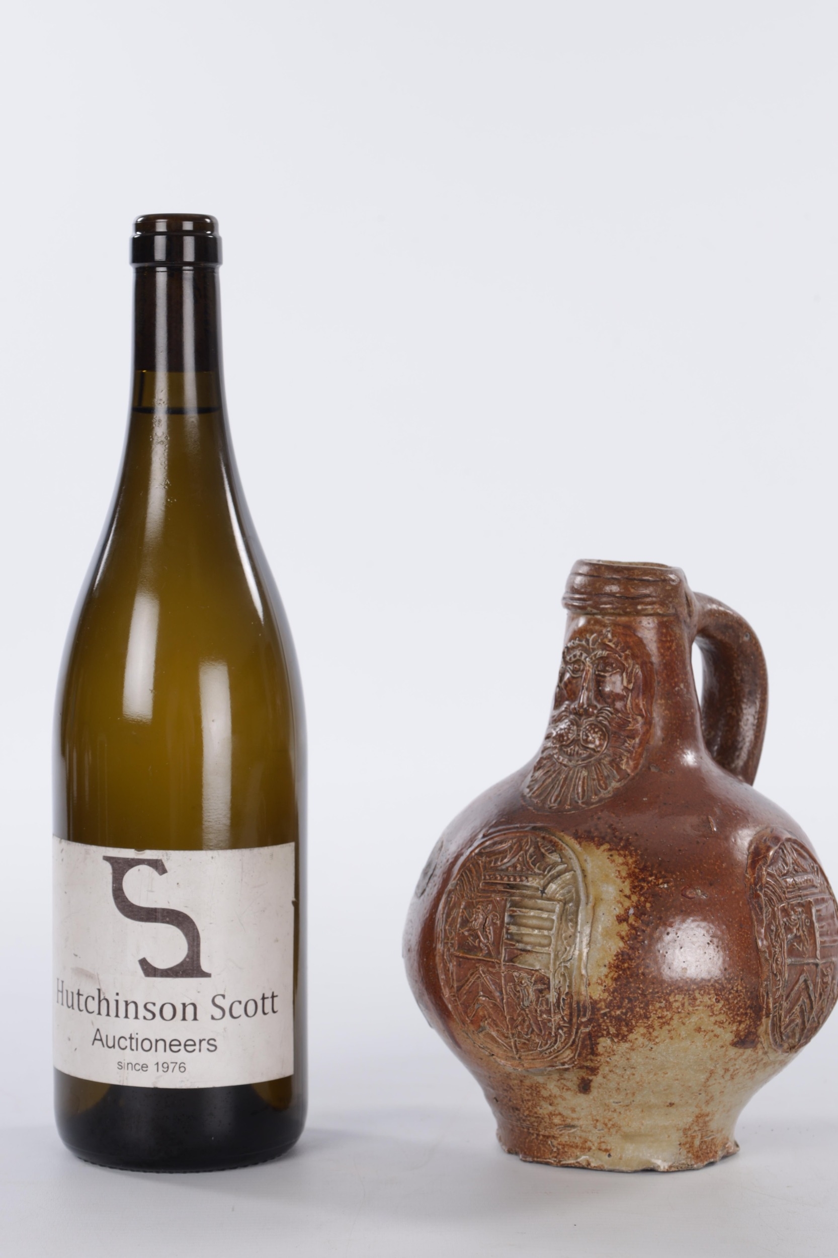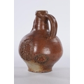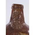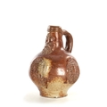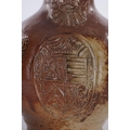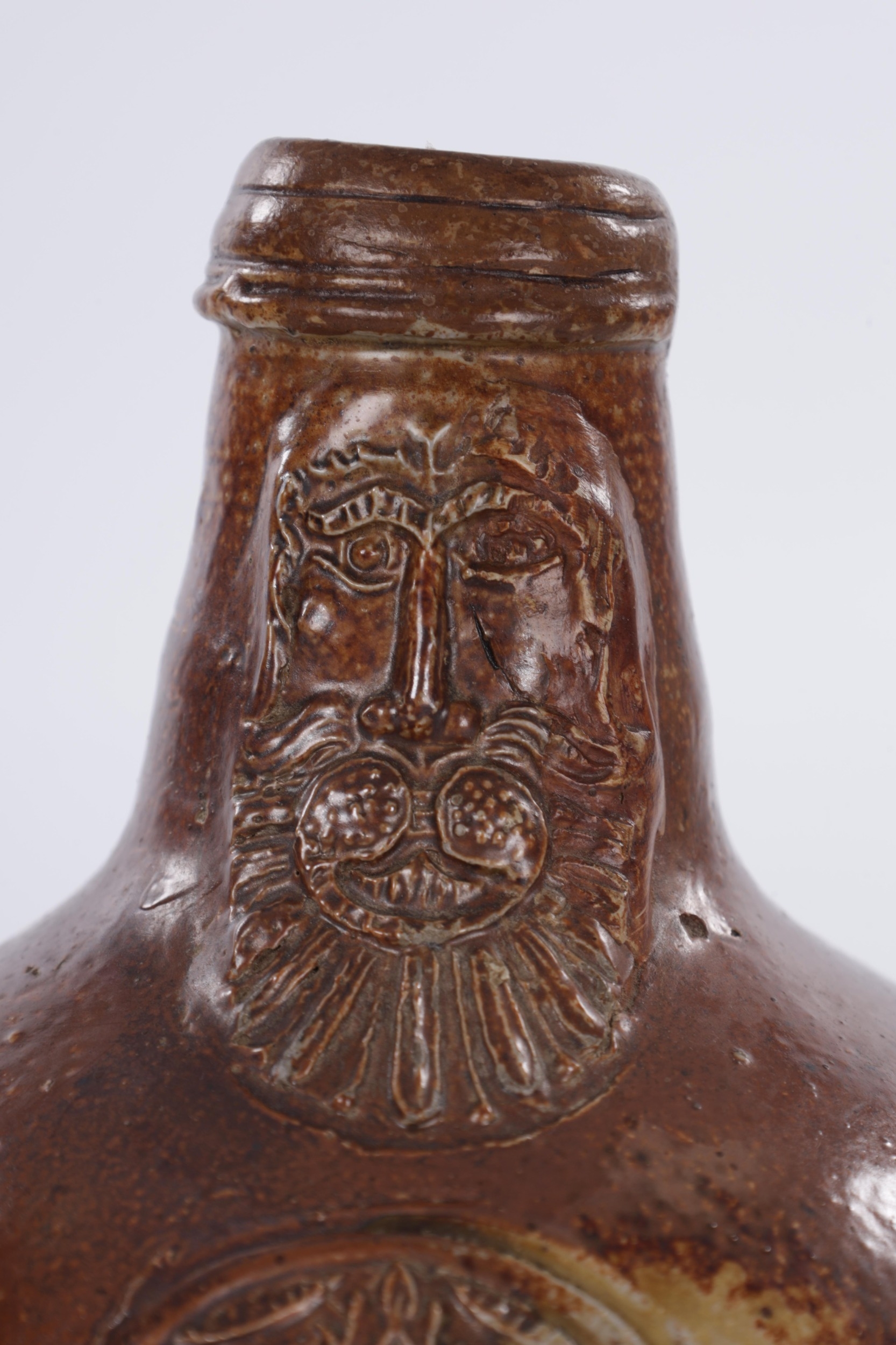 A 17TH CENTURY RHENISH BELLARMINE JUG WITH COAT OF ARMS of bulbous form with a narrow neck, applied bearded mask to the neck, coat of arms roundels to the body, in a mottled brown salt glaze. (19cm high)