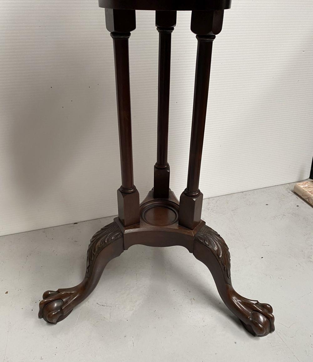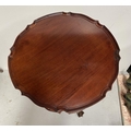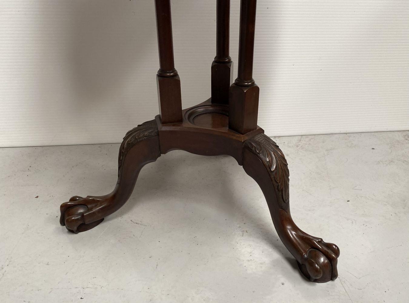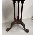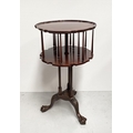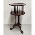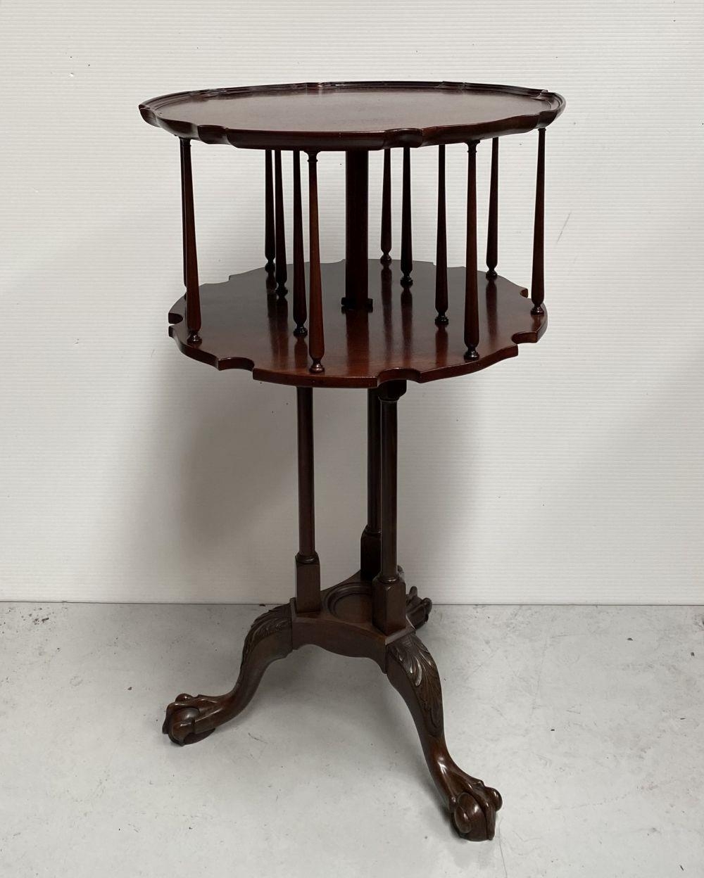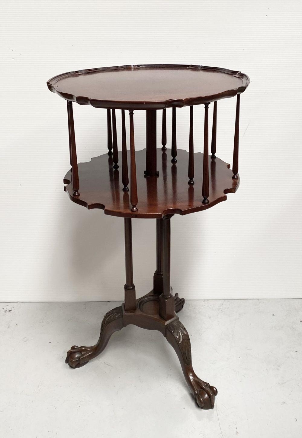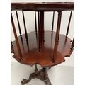 A GOOD MAHOGANY REVOLVING BOOKCASE ON STAND, circular form with pie crust edge, turned supports, supported by tripod base with carving to knee and standing on lion paw feet. Dimensions: 79cm high x 46cm wide approx.