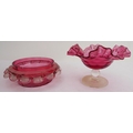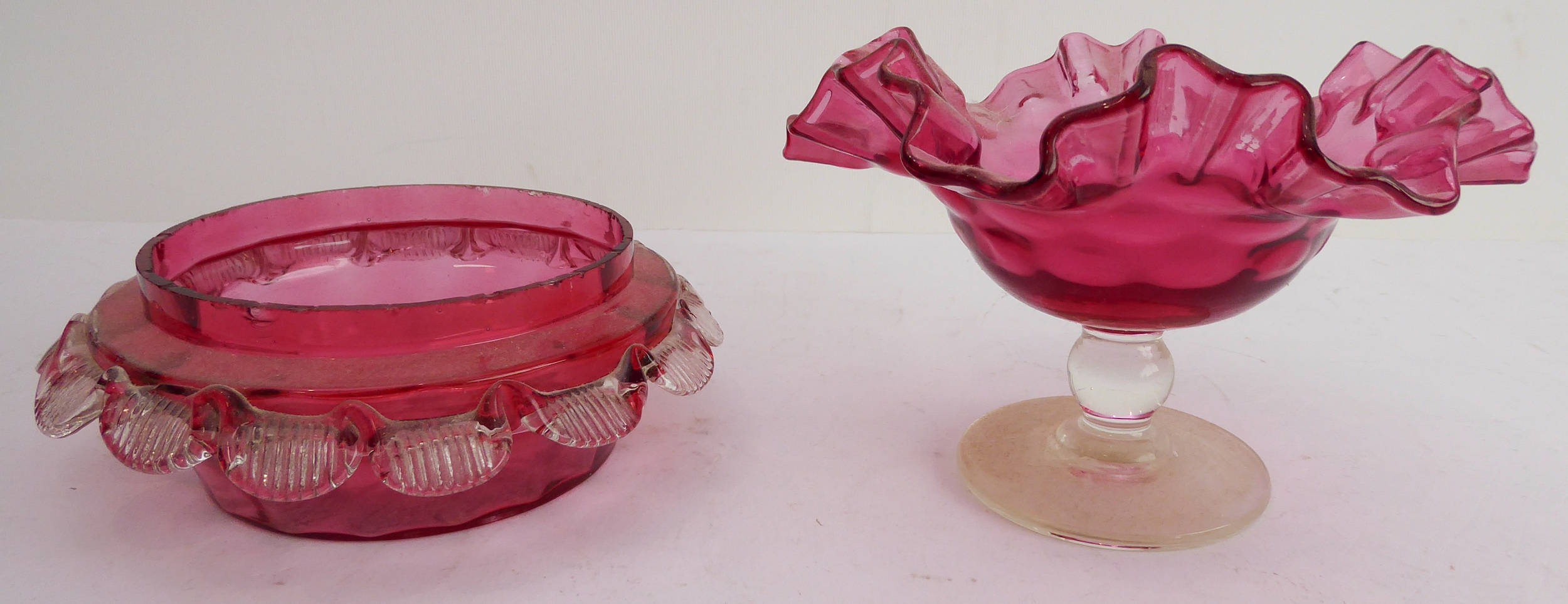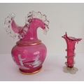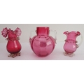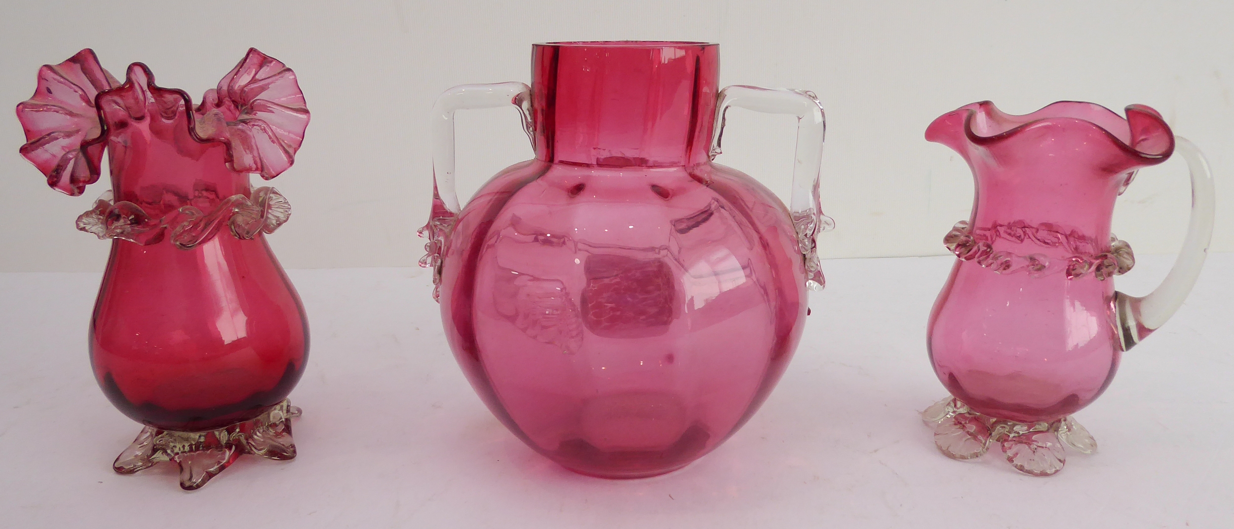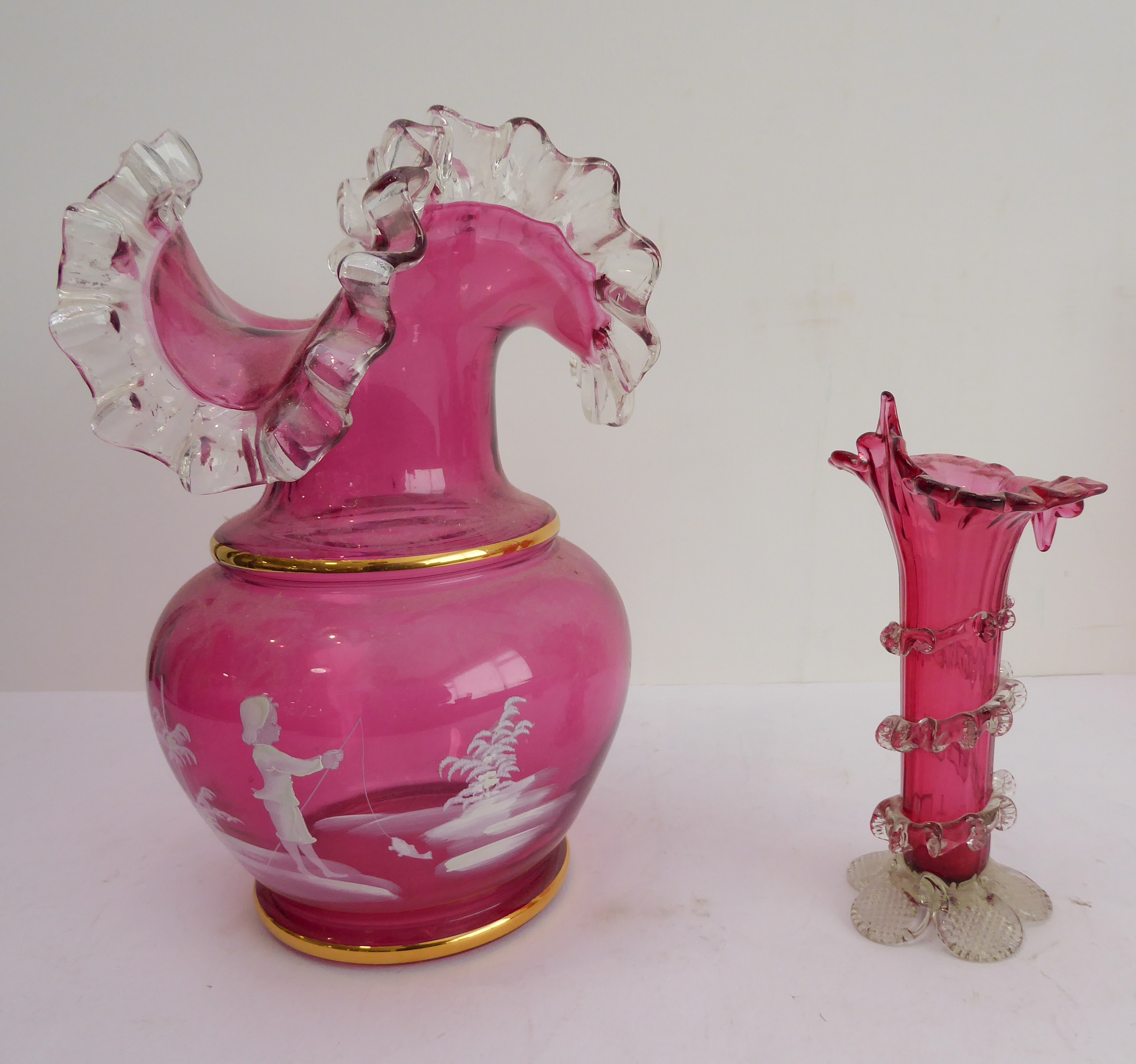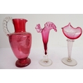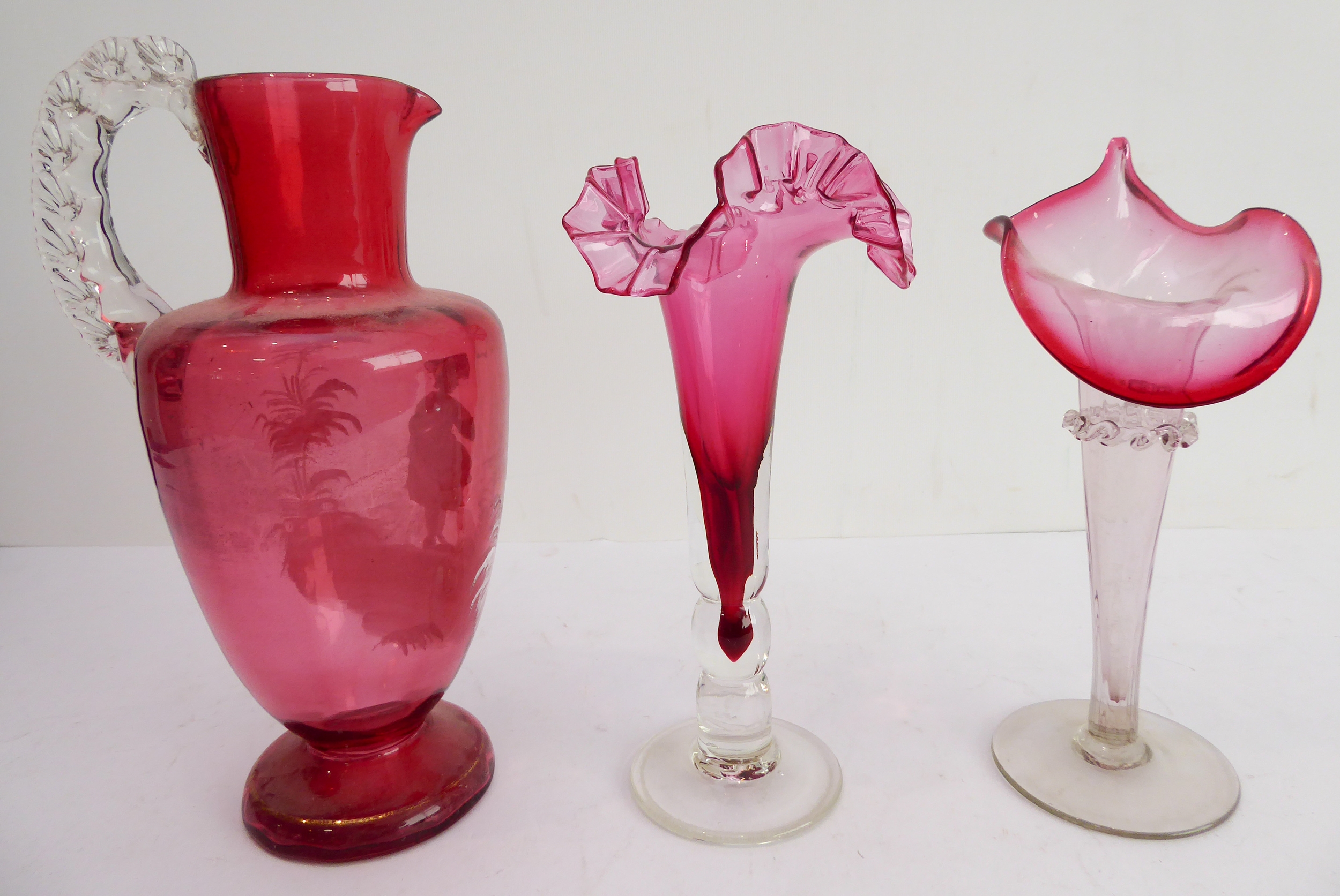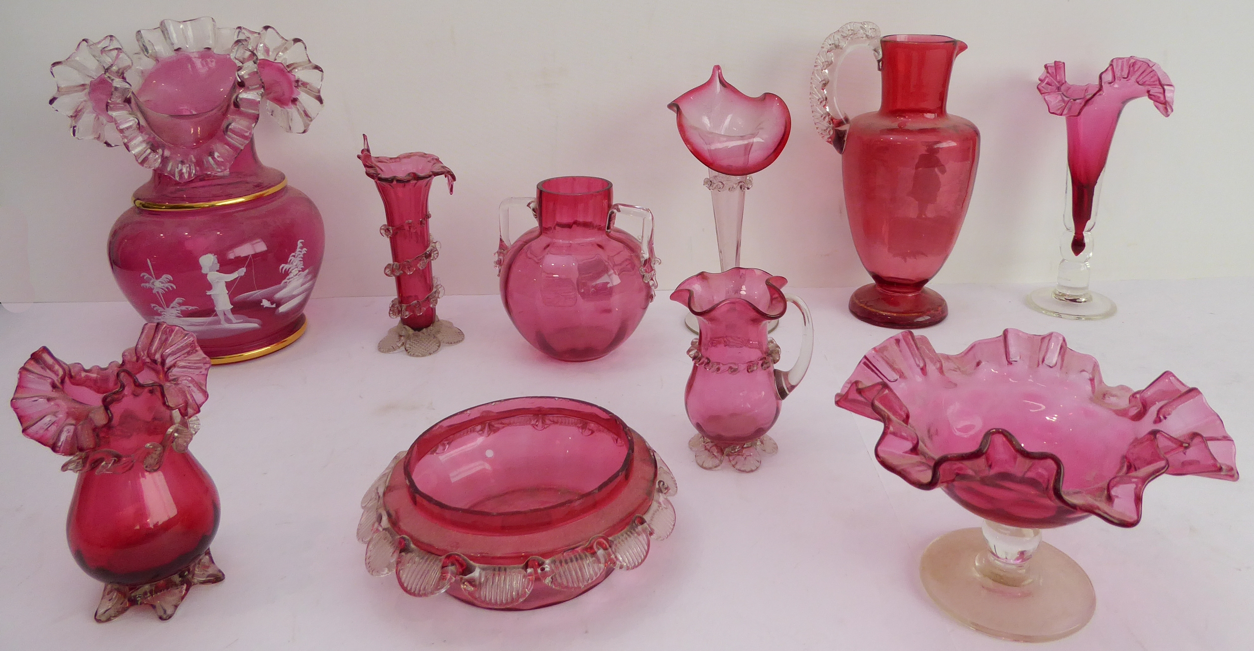 Ten pieces of mostly 19th century cranberry glass to include a large Mary Gregory style vase and jug, and a Jack-in-the-Pulpit vase.