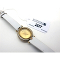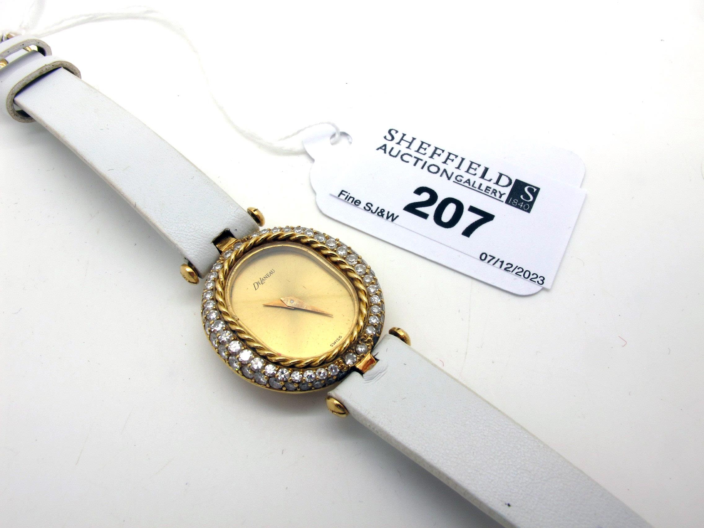 DeLaneau; A Modern Diamond Set Ladies Wristwatch, the signed oval dial within diamond set case, stamped marks and "750", on a modern white strap with Sekonda buckle.