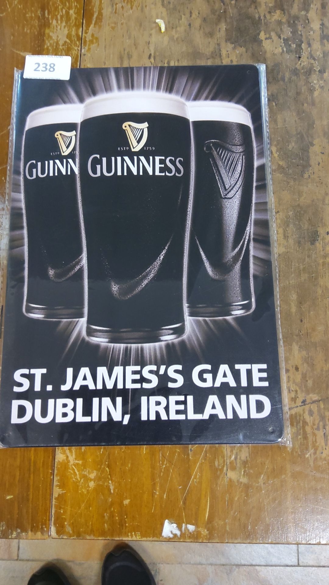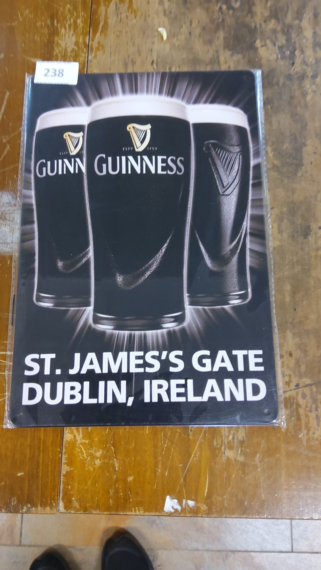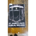 Metal sign featuring iconic pint design and St. James’s Gate, Dublin, Ireland text. Approximately 12 x 16 inches.
