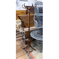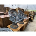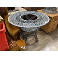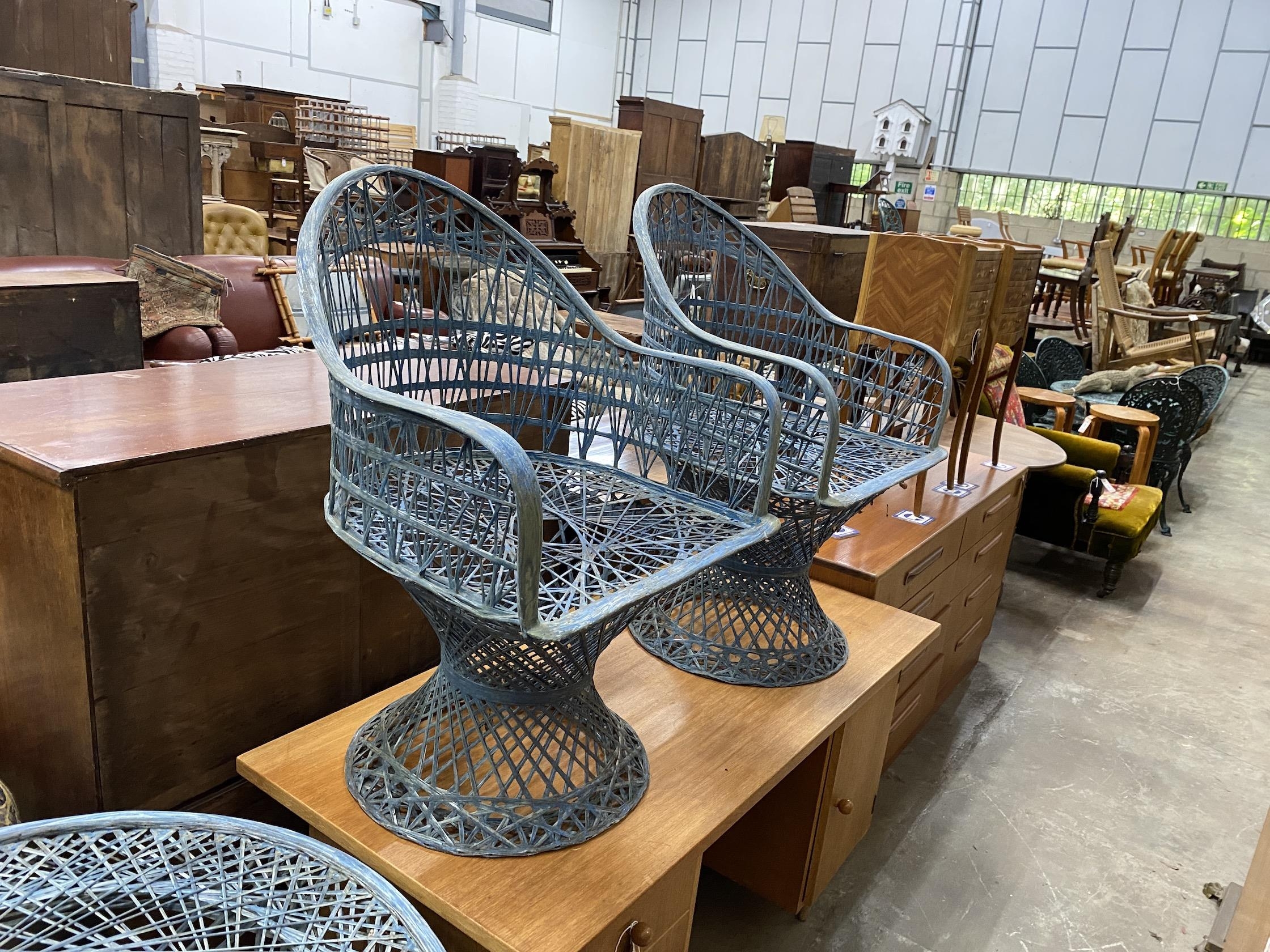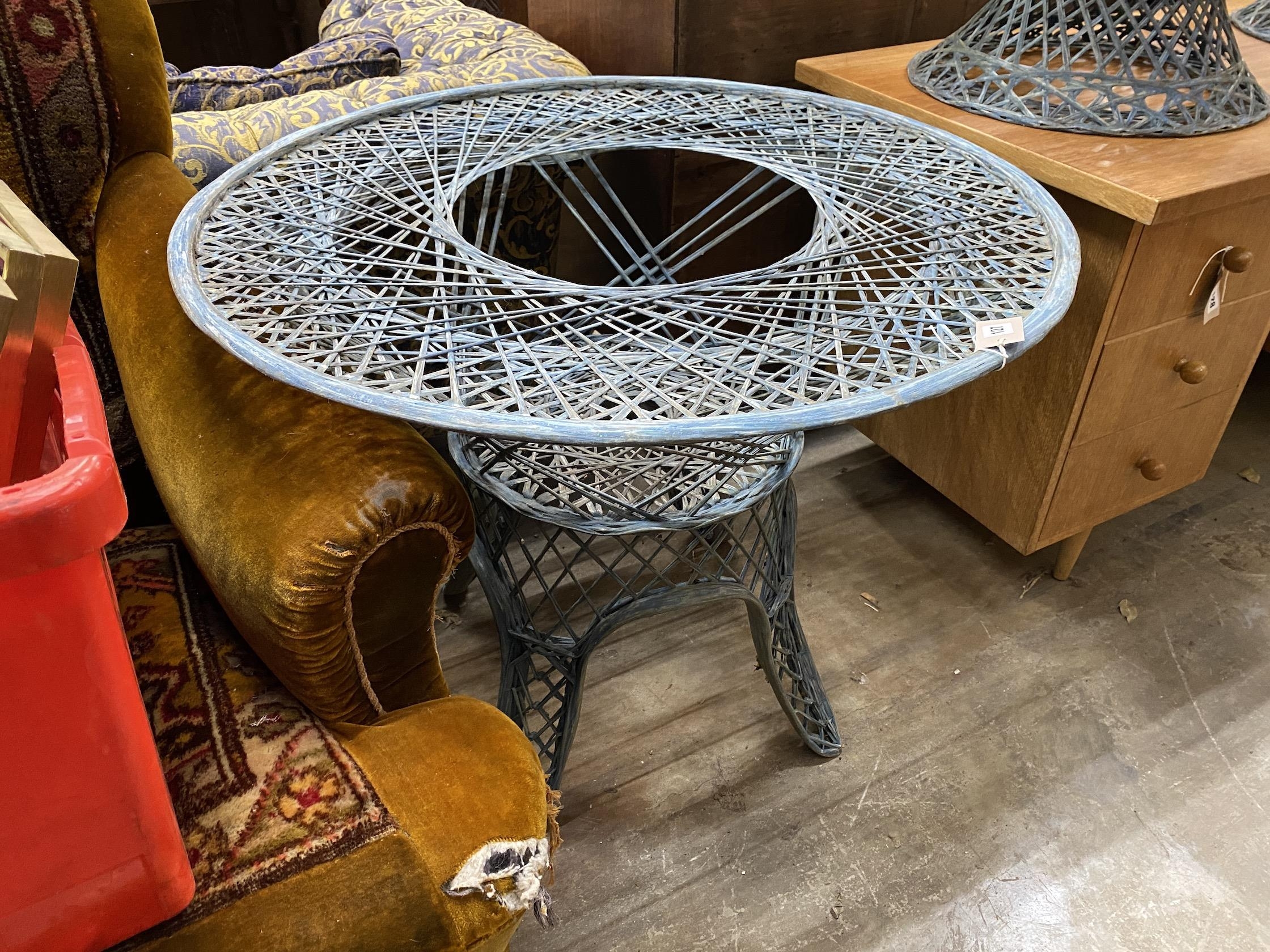 A painted wrought iron circular garden table, by Russell Woodard, diameter 88cm, height 70cm (lacking glass top), together with two matching chairs