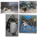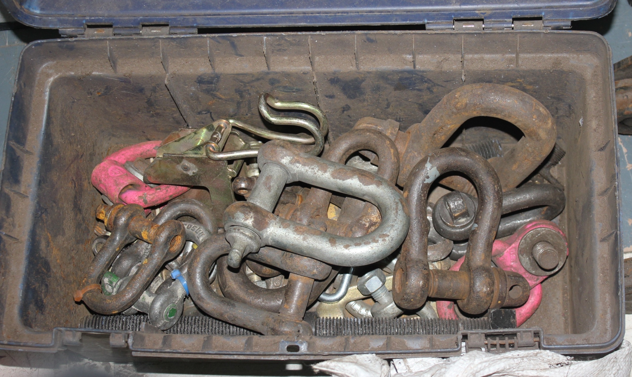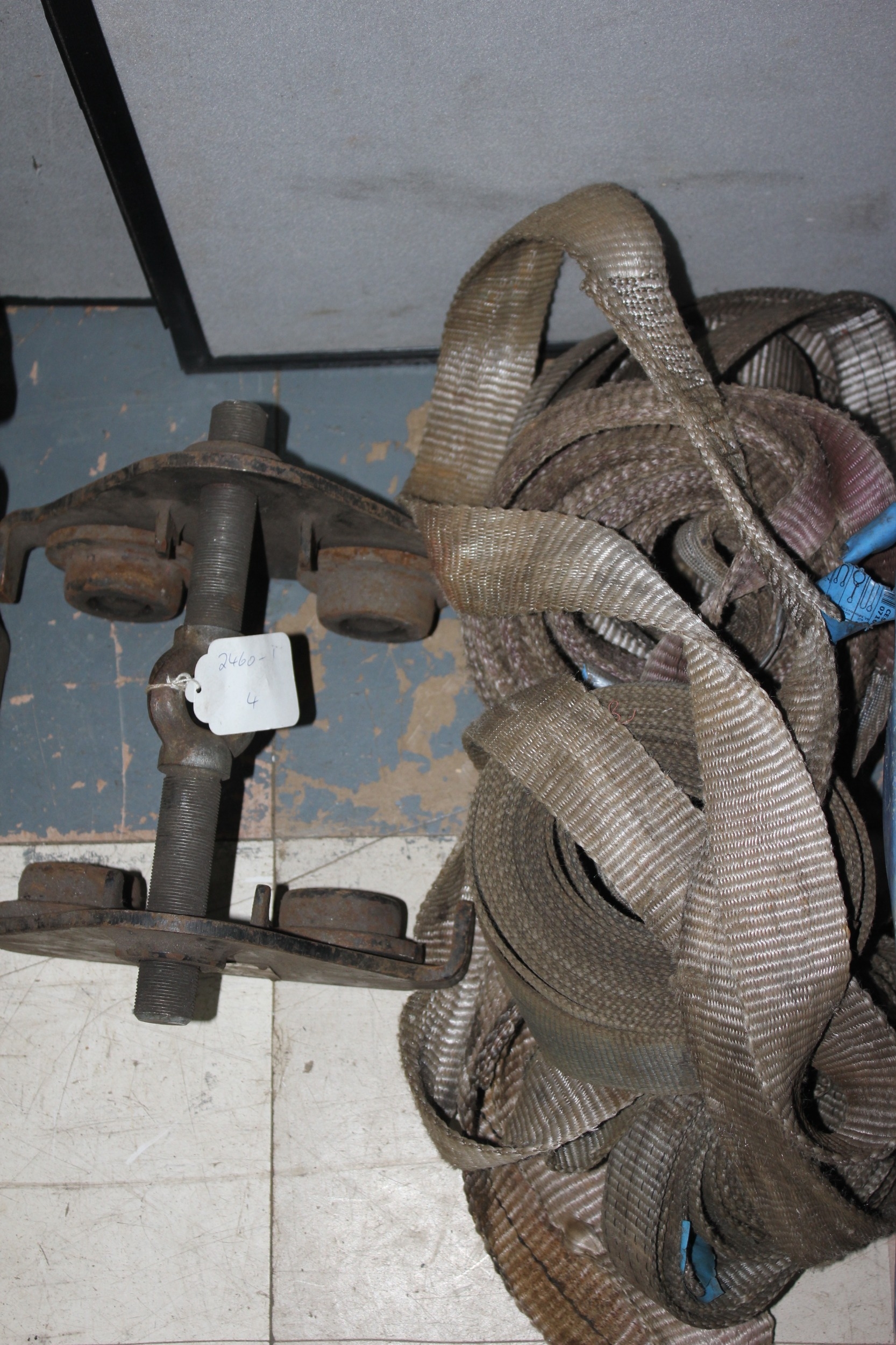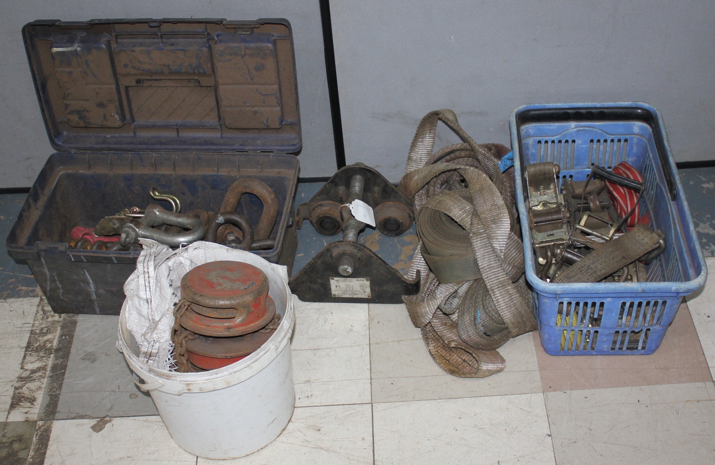LIFTING BLOCK AND CHAIN, SHACKLES, RATCHETS, STRAPS, BEAM TROLLEY, 110V TOOLS, SEALEY OIL DISPENSER, VARIOUS TOOLING