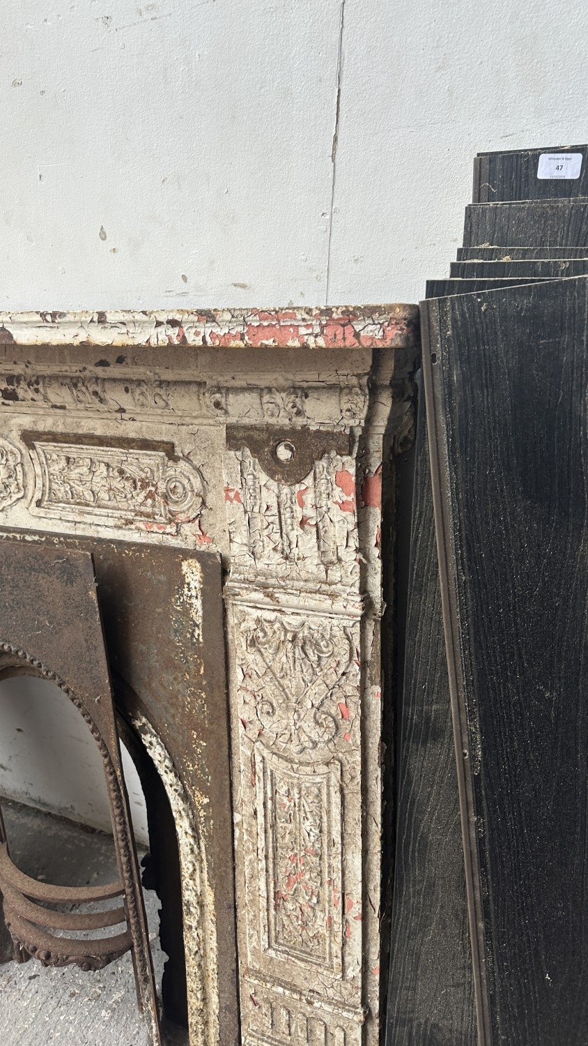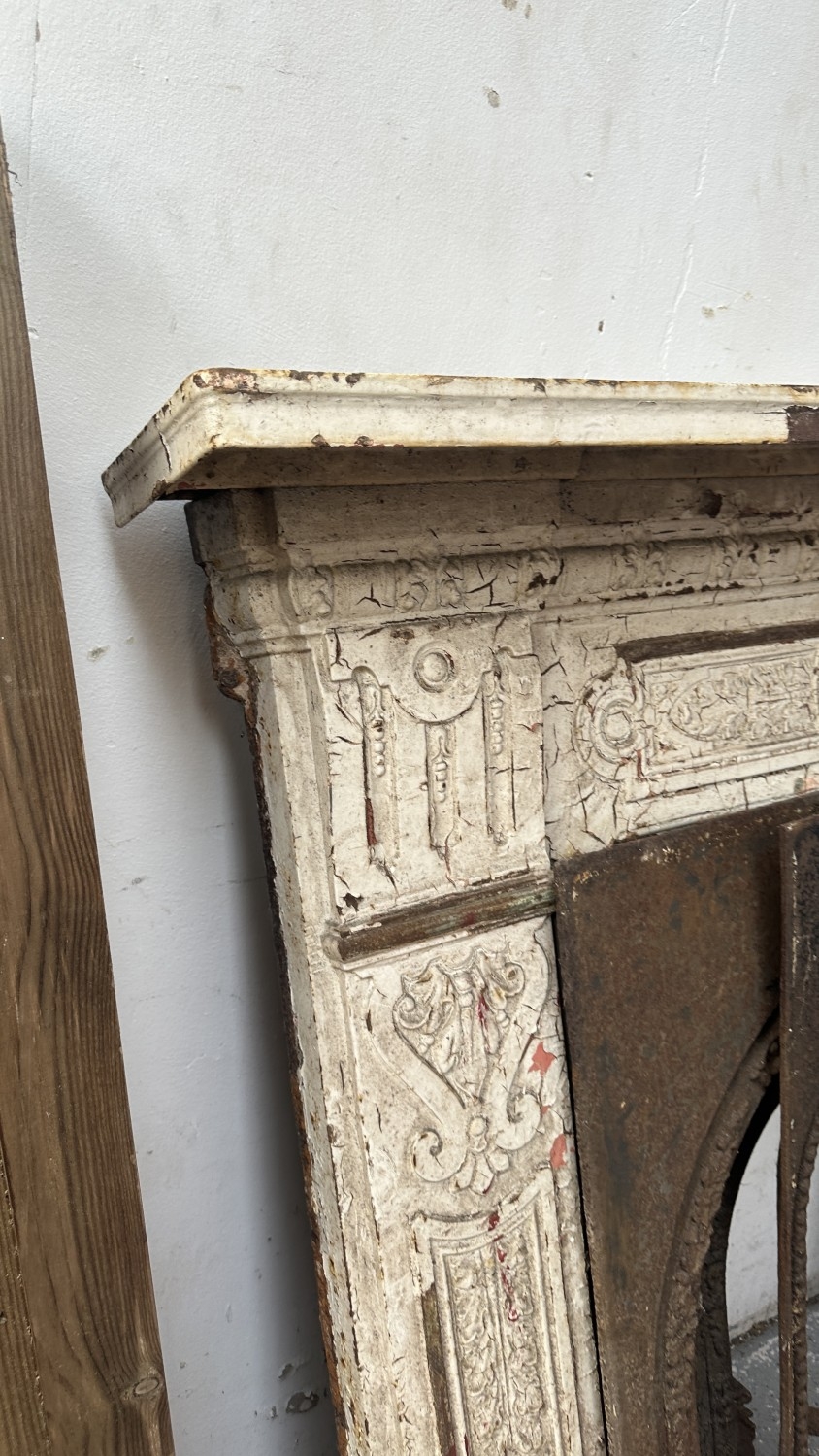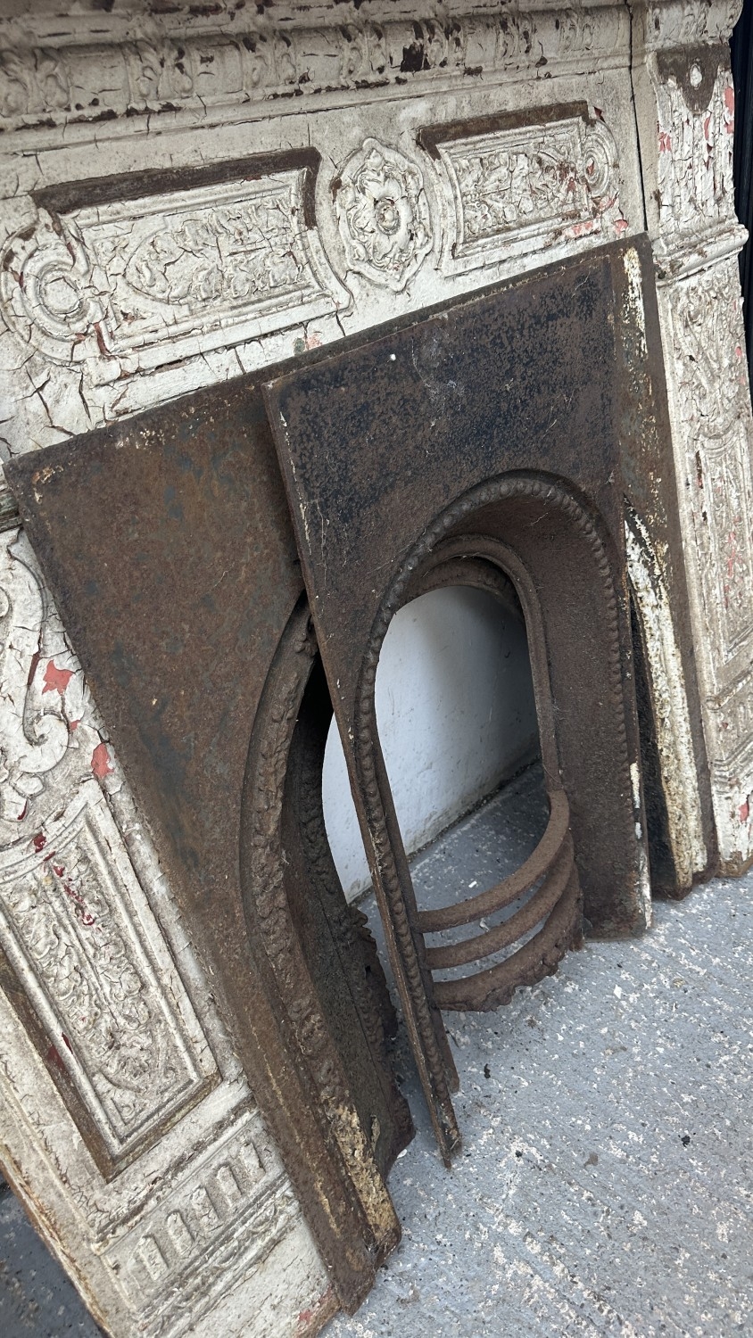 A Victorian white painted cast iron fire surround with two inserts - approx. 126cm high x 136cm wide x 25cm deep