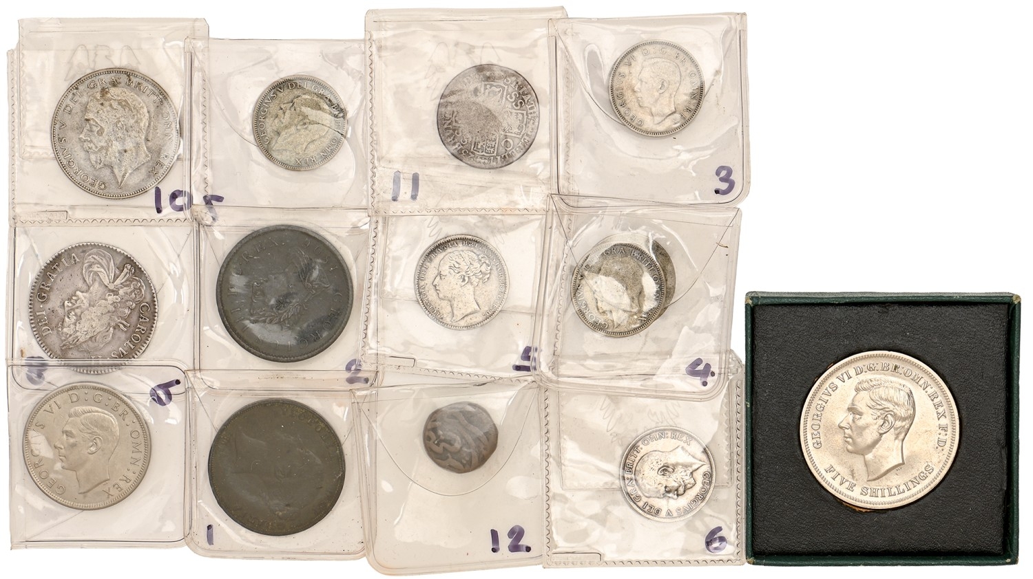 Coins. Charles II 2/6 1671, Vicesimo Tertio, minor staining reverse, supberb portrait, slight central weakness, almost VF; 1723 SSC 1/0 poor, others silver and base (12) (14)