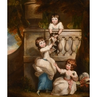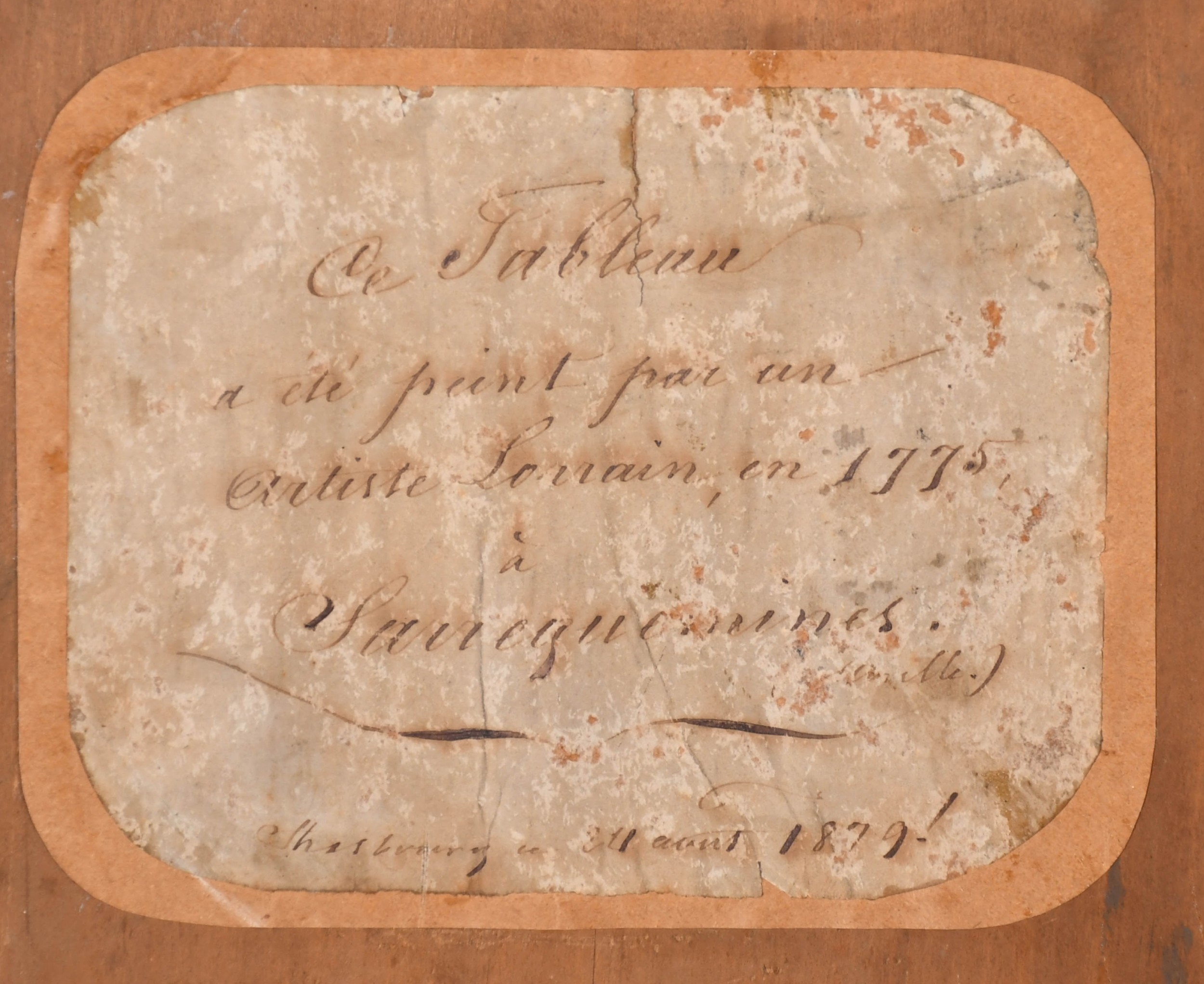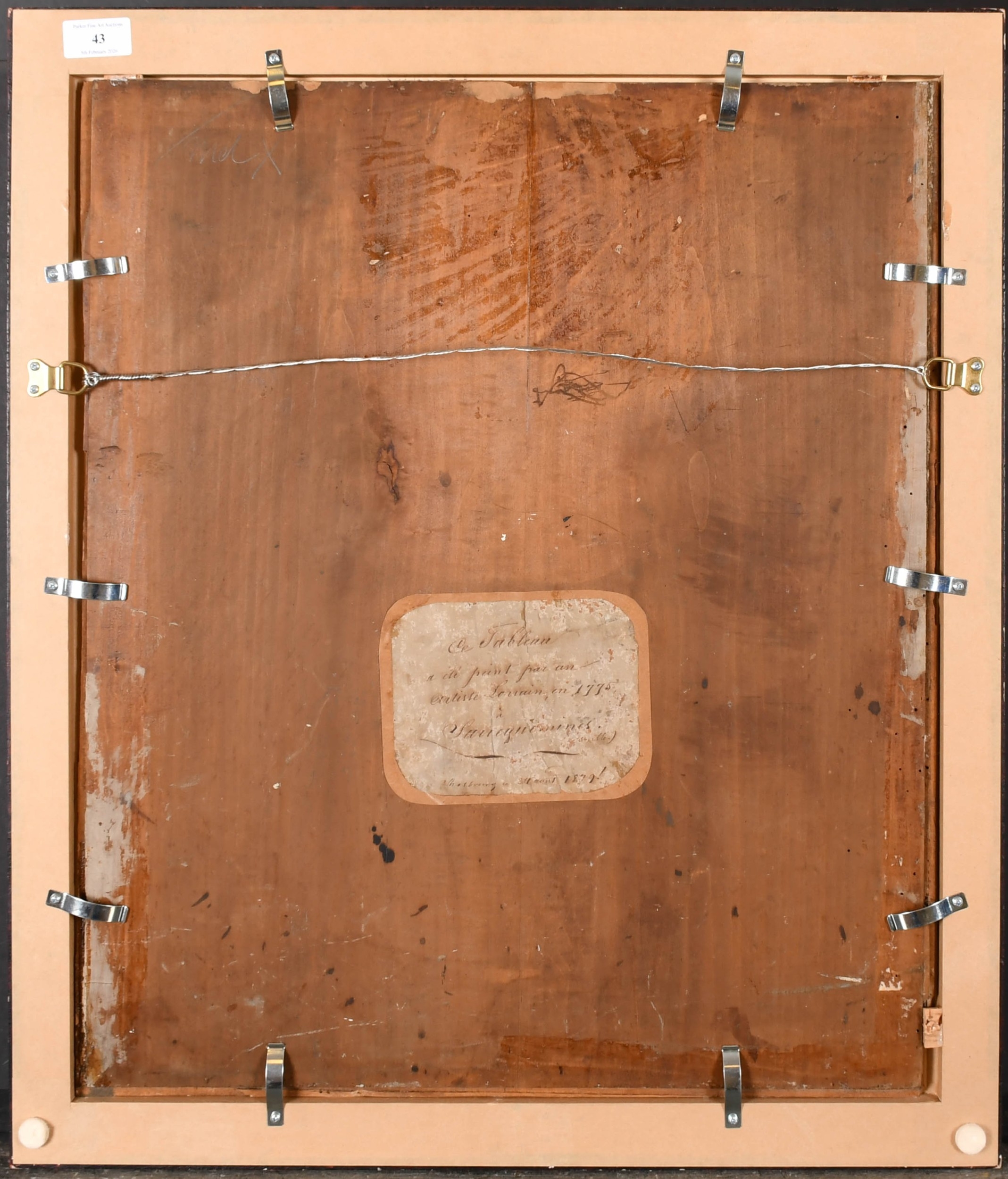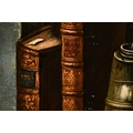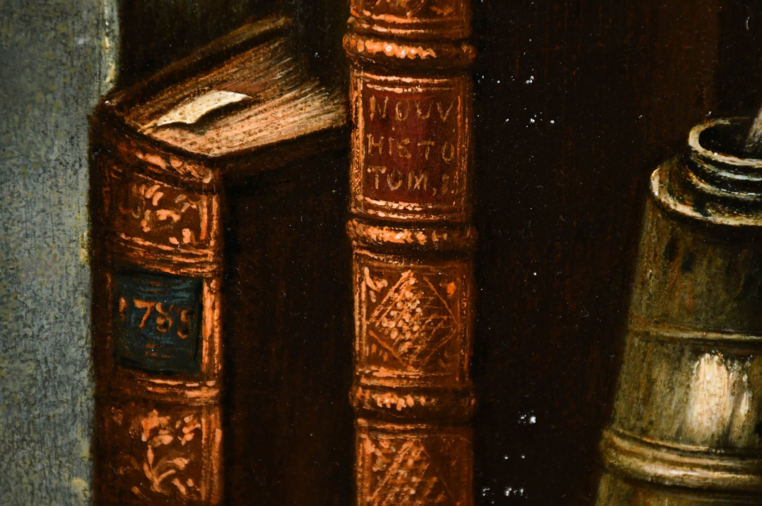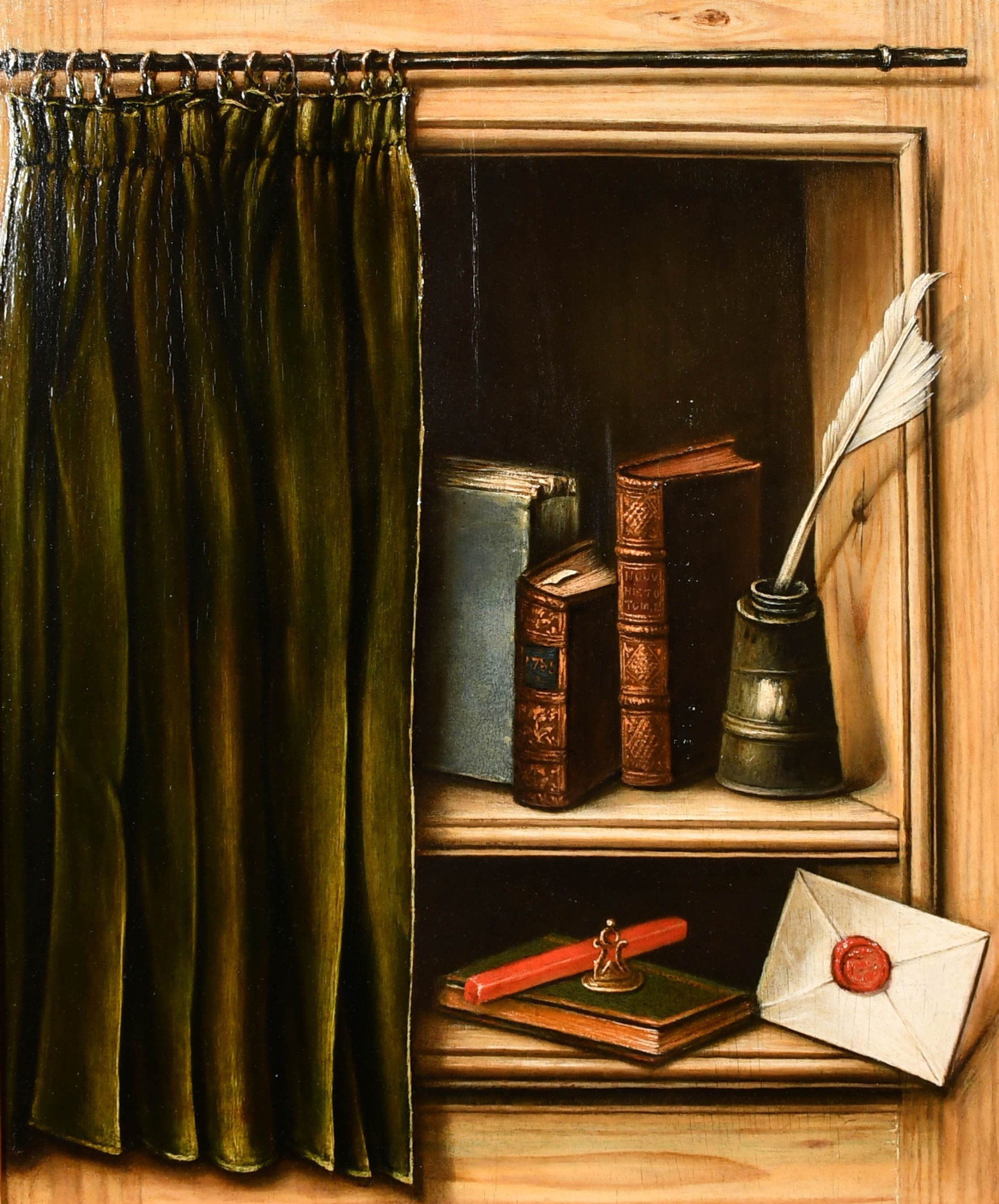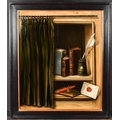 Circle of Claude-Joseph Fraichot (1732-1803) French. A Trompe L'Oeil, behind a curtain with books and an inkwell, Oil on panel, Dated 1789 on a book, and inscribed on a label verso, 22.5" x 19" (57.2 x 48.2cm)