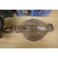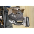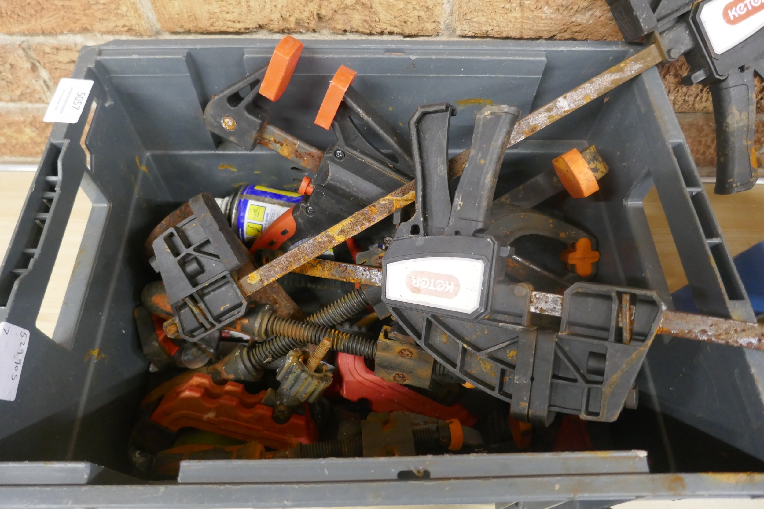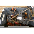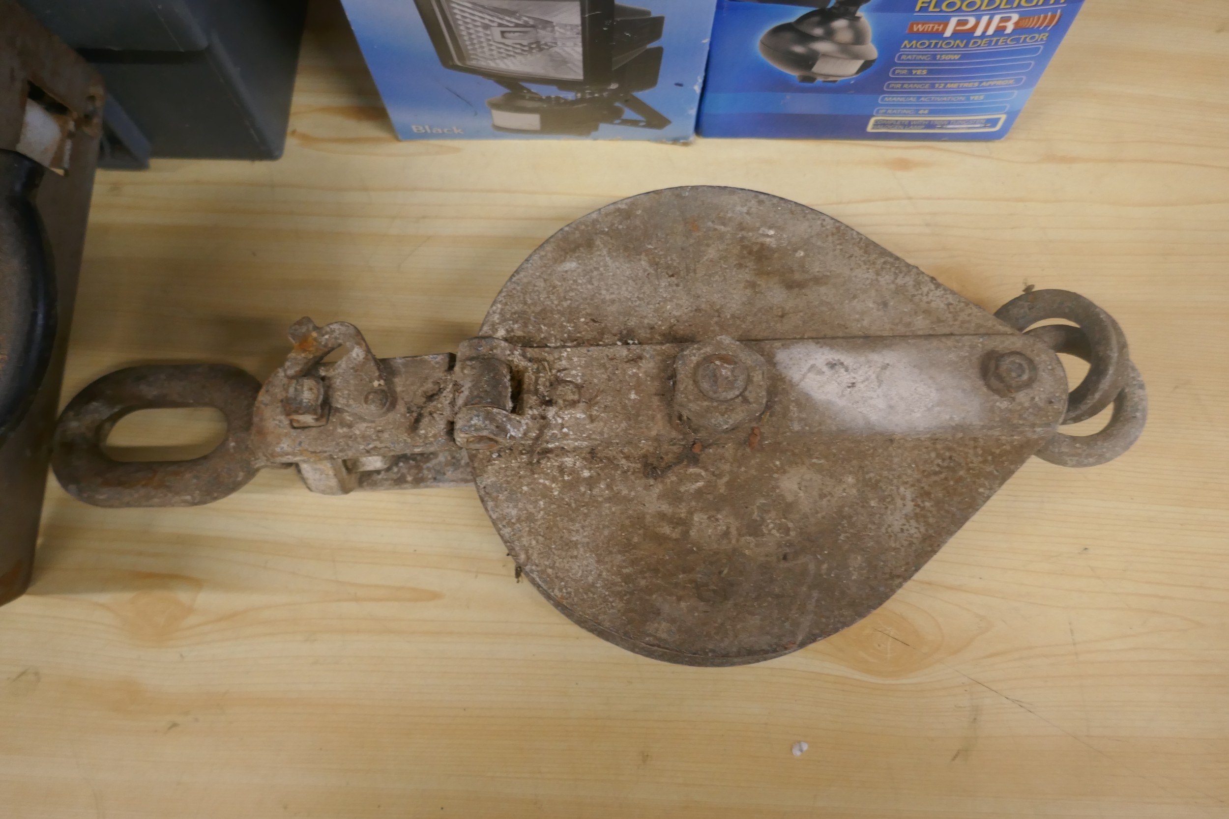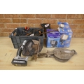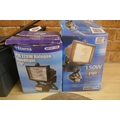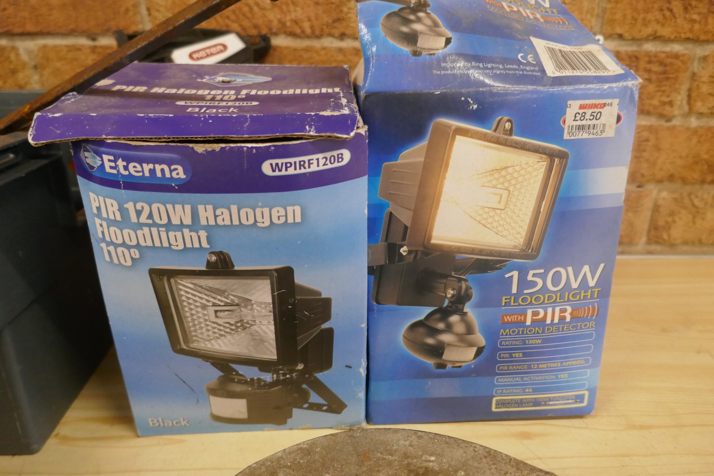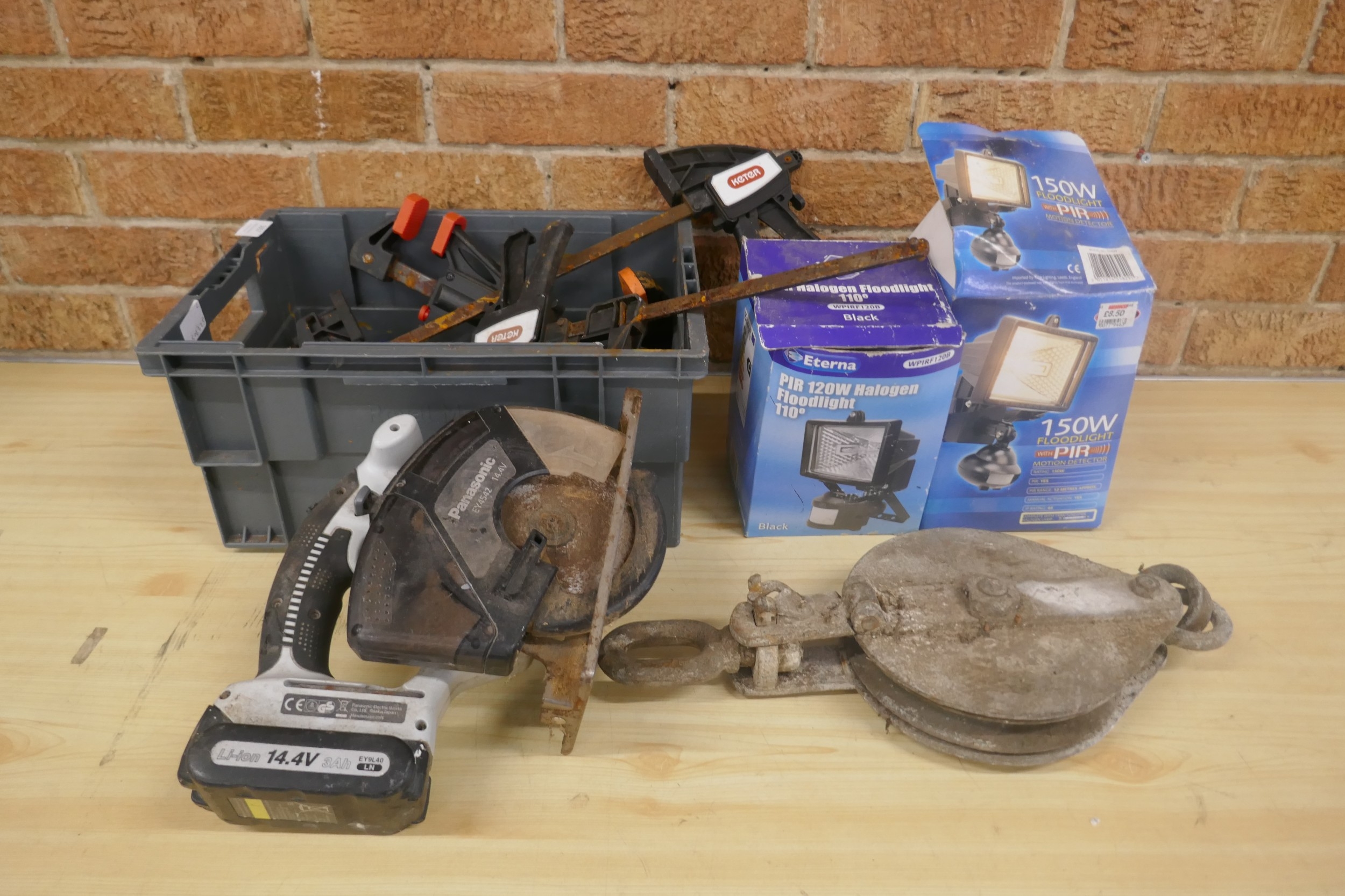 2 Eterna PIR, 120W halogen floodlights, a Panasonic EY4542 14.4V cordless circular saw with battery and a box of assorted tools including quick clamps, spring clamps, pulley, etc.