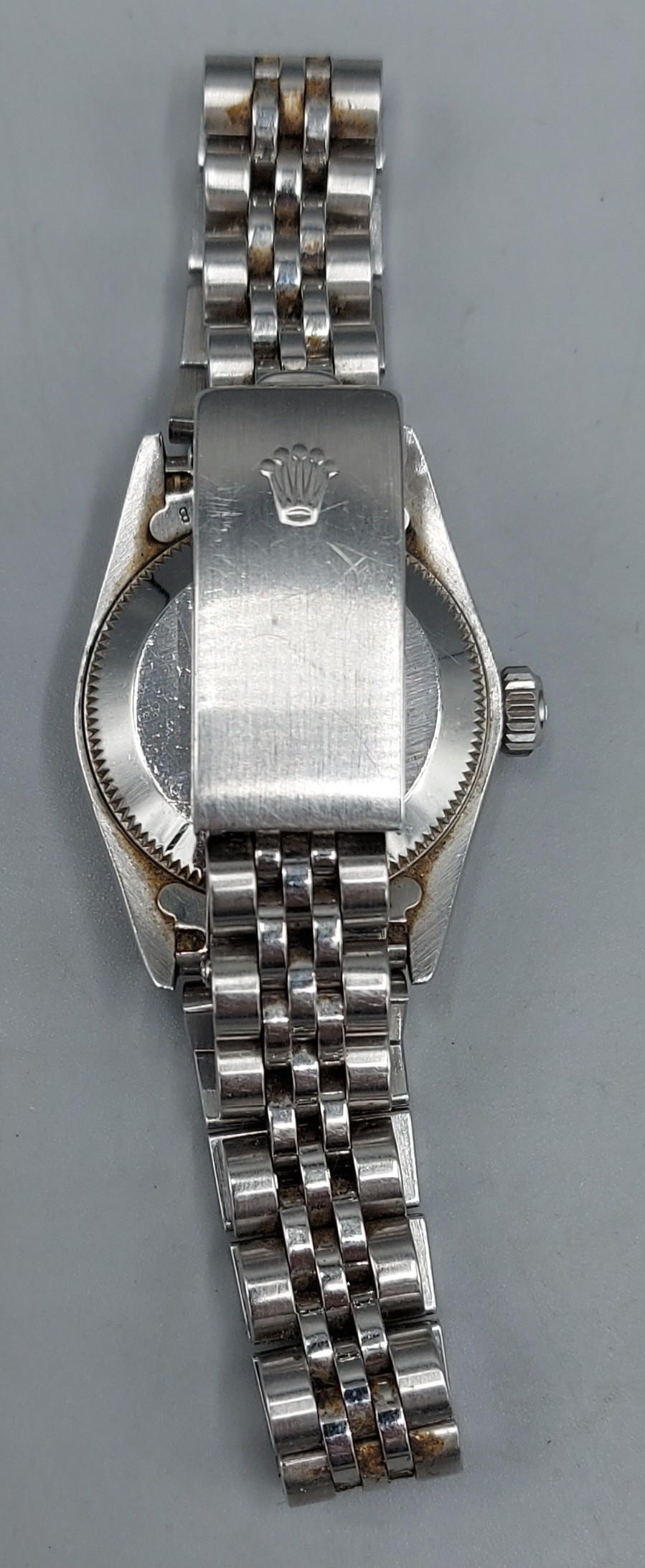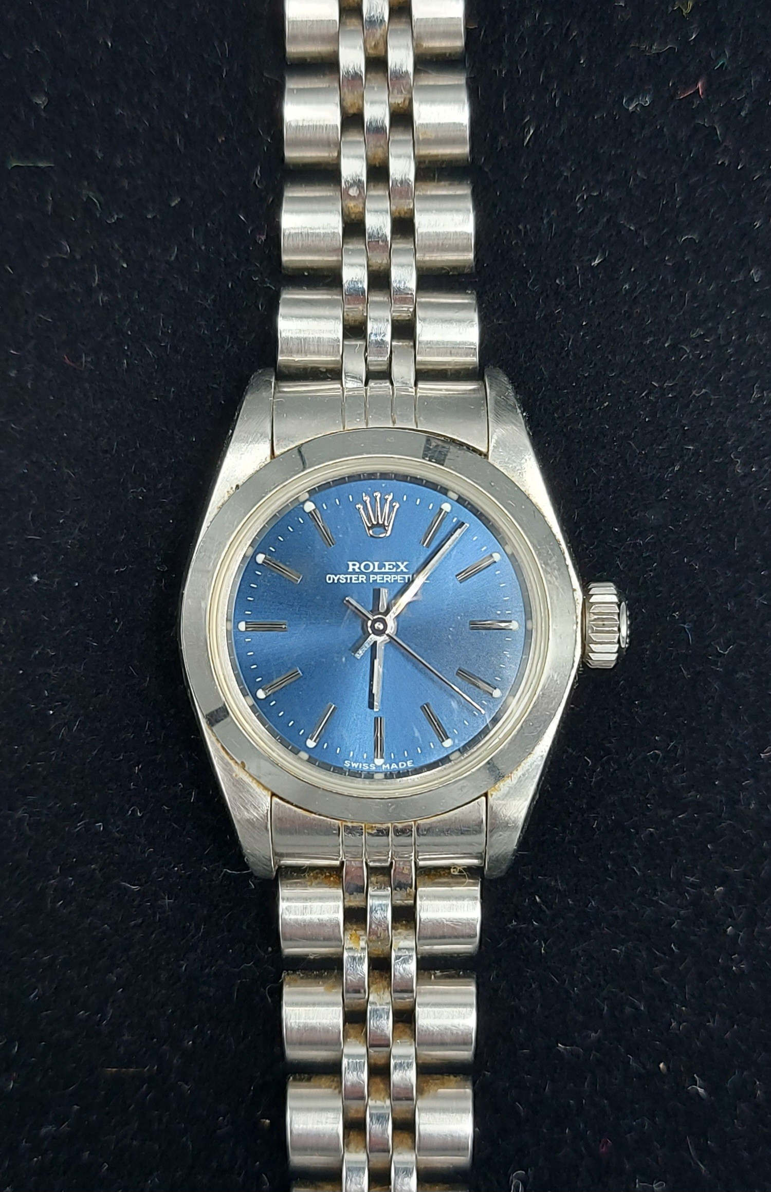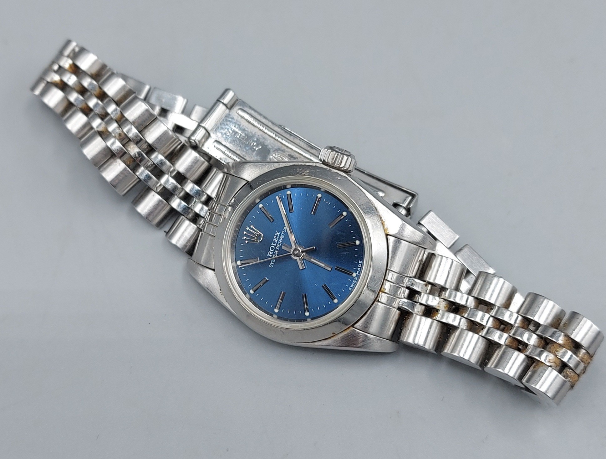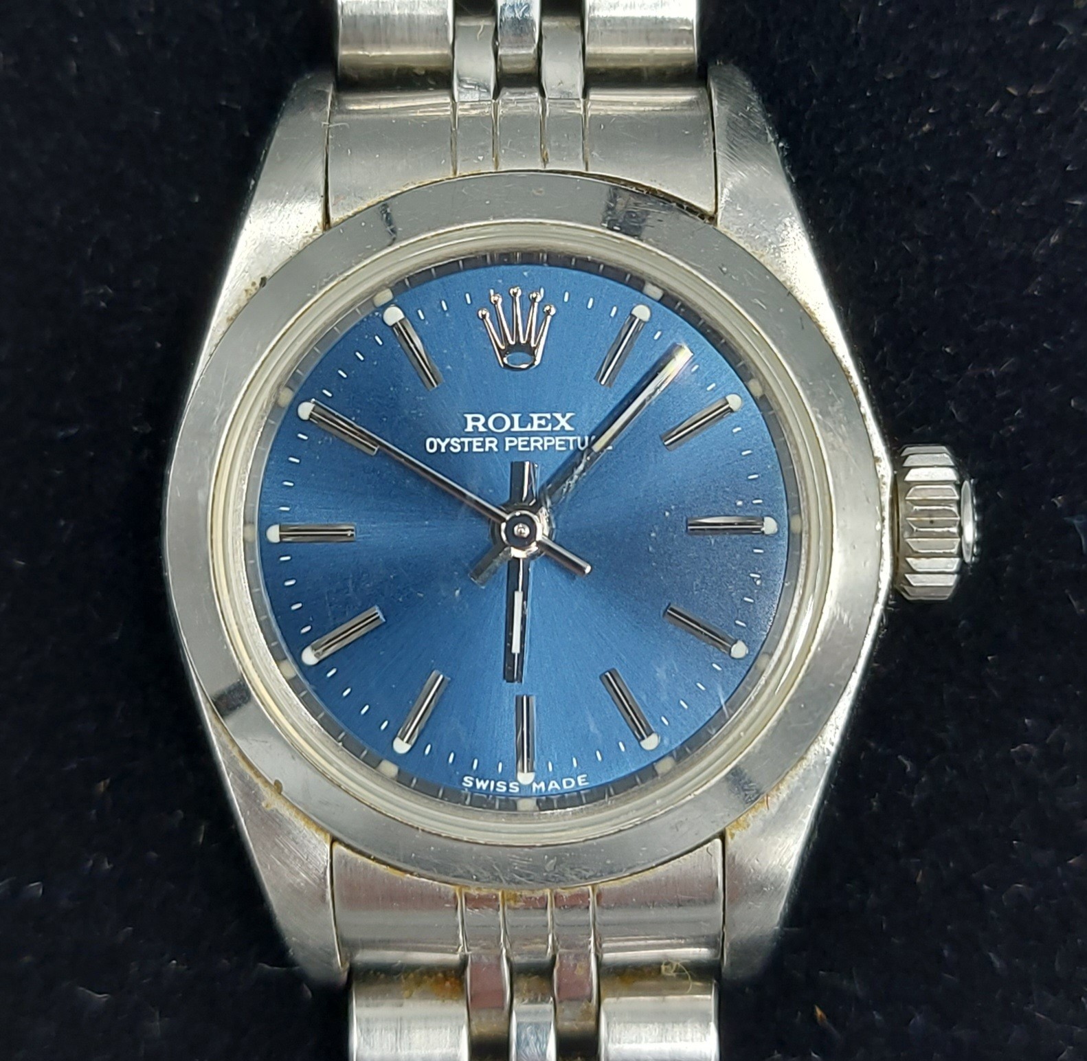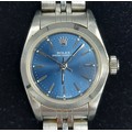 A Rolex Oyster Perpetual, 76080 stainless steel cased ladies wristwatch with blue dial, automatic movement and Jubilee bracelet