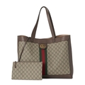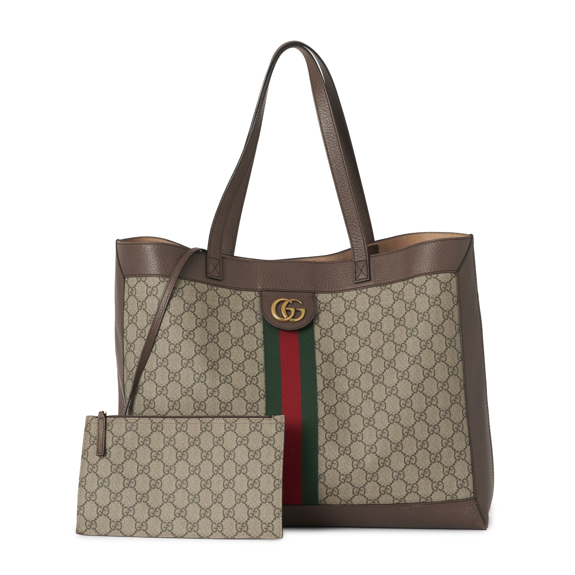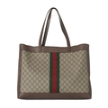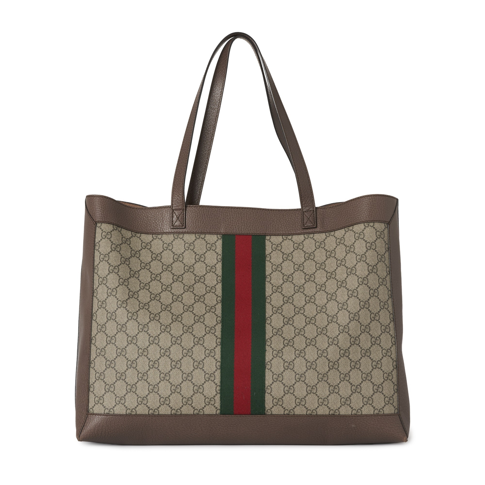 Gucci, a Supreme Ophidia tote bag w/ pouch, GG coated canvas exterior, brown leather trim, gold-tone hardware, green and red central web stripe adorned with an interlocking GG logo plaque, dual leather handles, an open top, pink microfibre lining, and a matching detachable interior pouch, measuring 15 by 33 by 44cm
