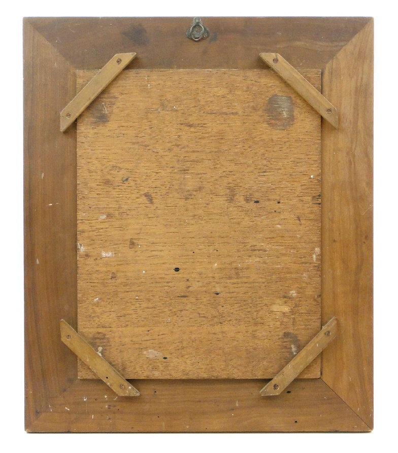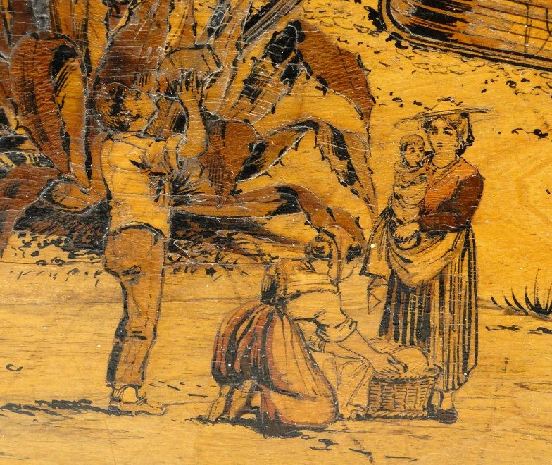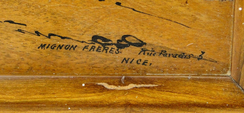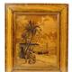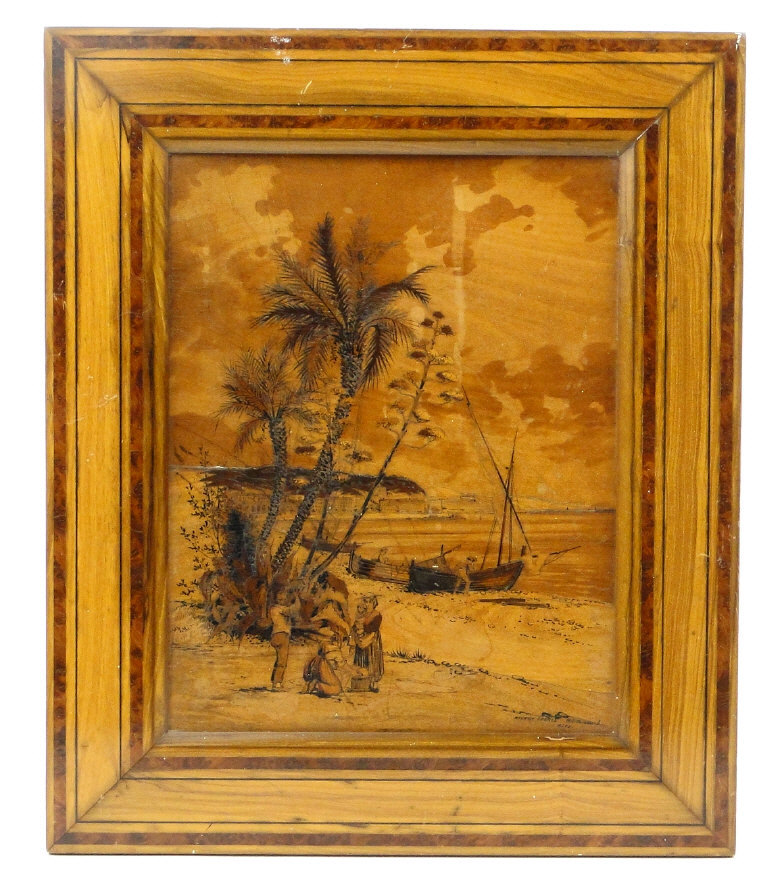 French marquetry panel depicting figures off the Nice coast, titled Mignon Frères Rue Paradis, Nice, the panel 25cm x 19cm excluding the frame